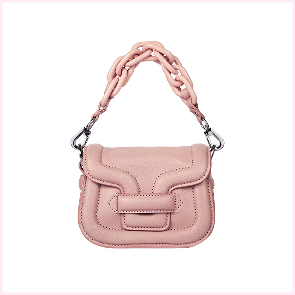 パフィなボディに大ぶりのチェーンをあしらって、軽やかなパウダーピンクで春を先取り。