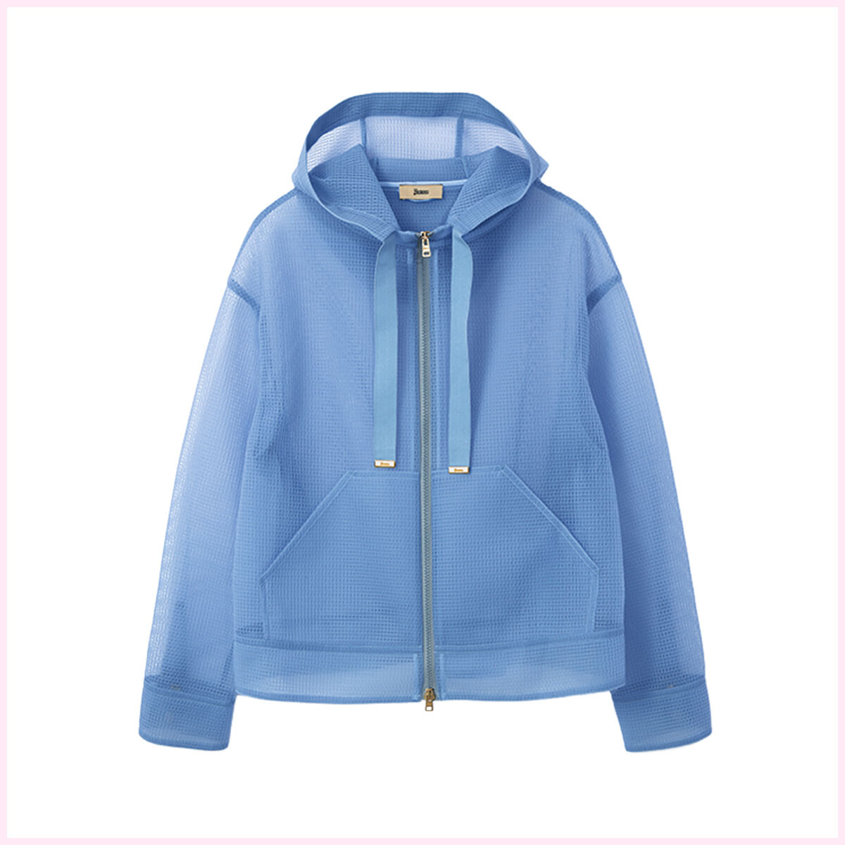 カジュアルなイメージのあるパーカはシアーな素材でひと匙のスパイスを。真夏の空を彷彿させるアイシーブルーで暑さを払拭。