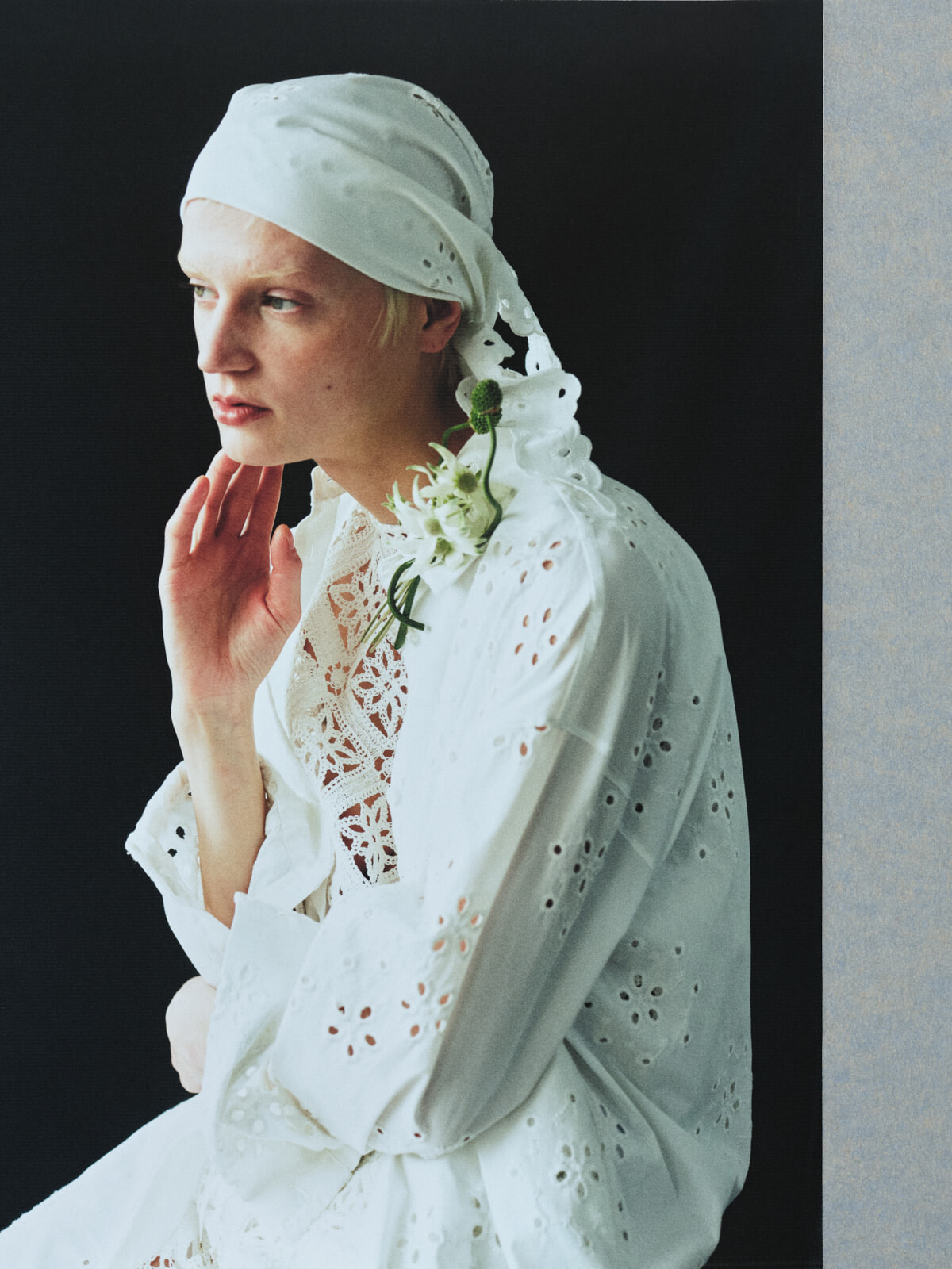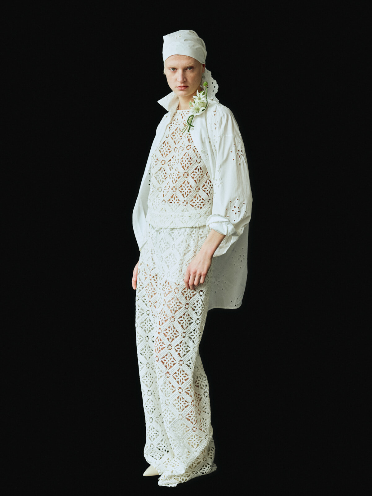レースのウエアで全身を揃えた、リラックスムード漂う爽やかなホワイトコーディネート。主役のコットンロングシャツは、アウターのように羽織ったり、ボタンを閉めてミニドレスとして着たりと、スタイリングが自在に楽しめる一着。フラワーモチーフでありながら甘すぎない、大人の品格が薫る。