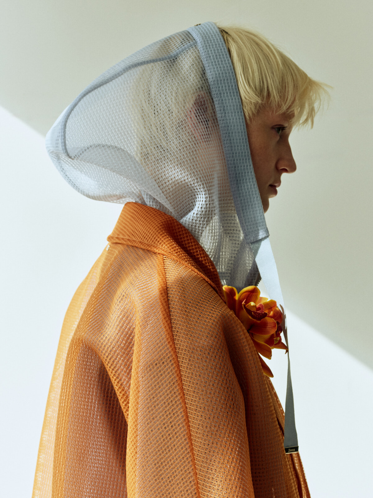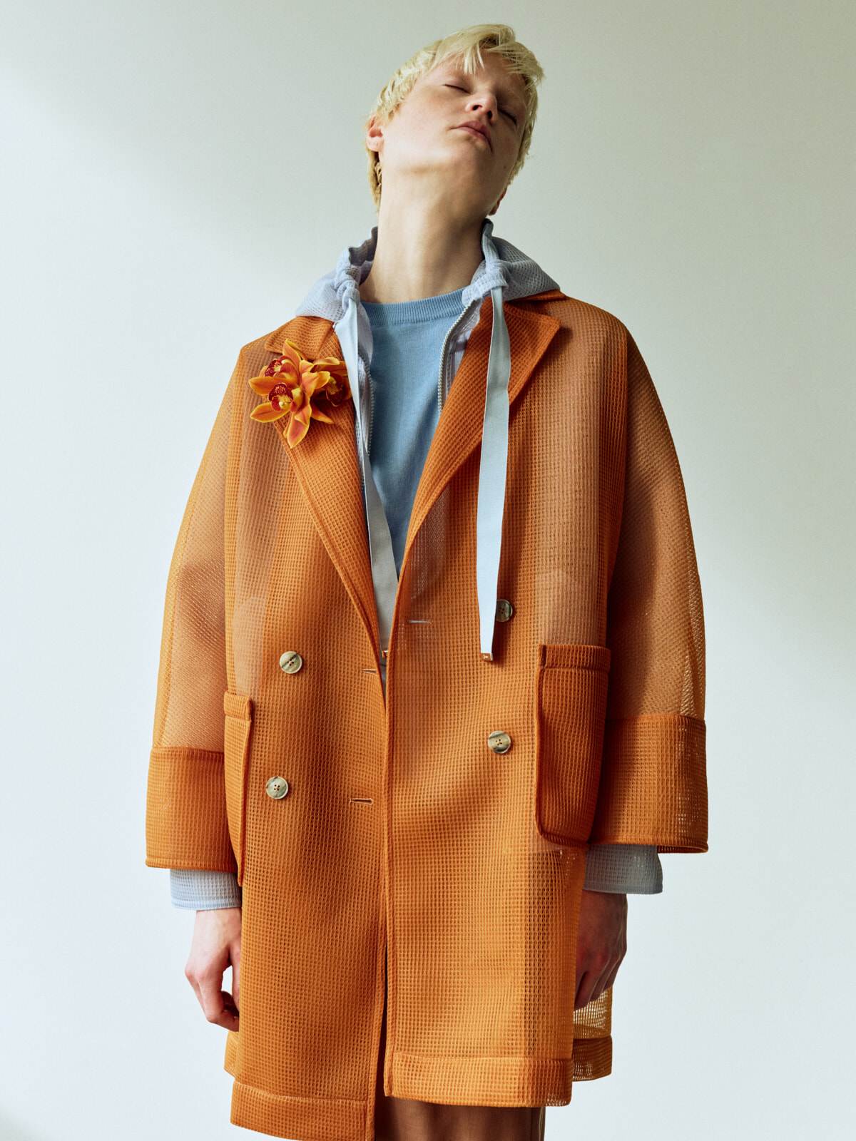 20デニールのポリエステルを使用した軽量なメッシュ生地のダブルブレストコートに、同素材のスポーティなブルゾンをレイヤード。素材の透け感を生かした、涼やかでエアリーなスタイリングに。軽やかさを備えながらも端正なフォルムは保つ、そのバランスがコートの最大の魅力だ。