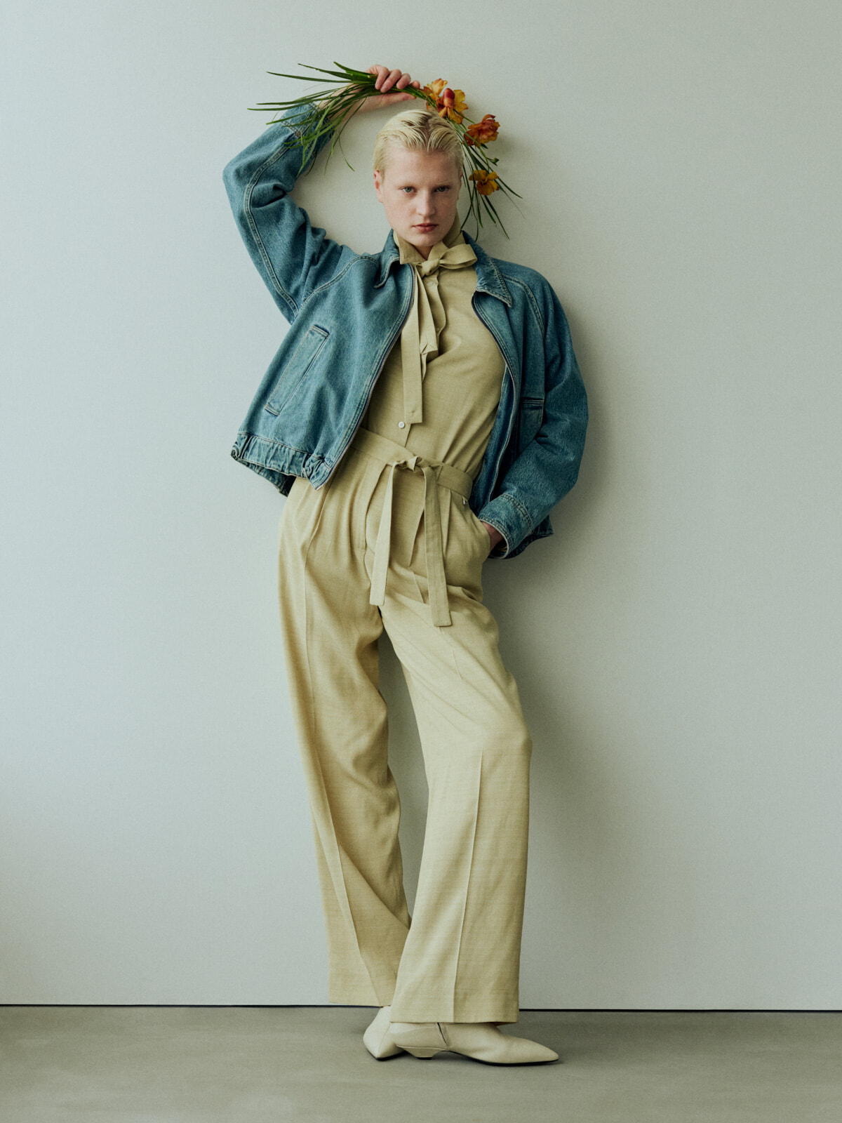 ヴィンテージのような風合いのデニムブルゾンは、ラグランスリーブでゆったりとリラックス感のあるシルエット。ジップ開閉のディテールで、クラシックになりすぎない都会的なニュアンスをもたらす。タイをあしらったベージュのセットアップをあわせて、ノーブルなムードを添えて。