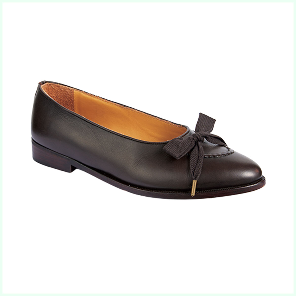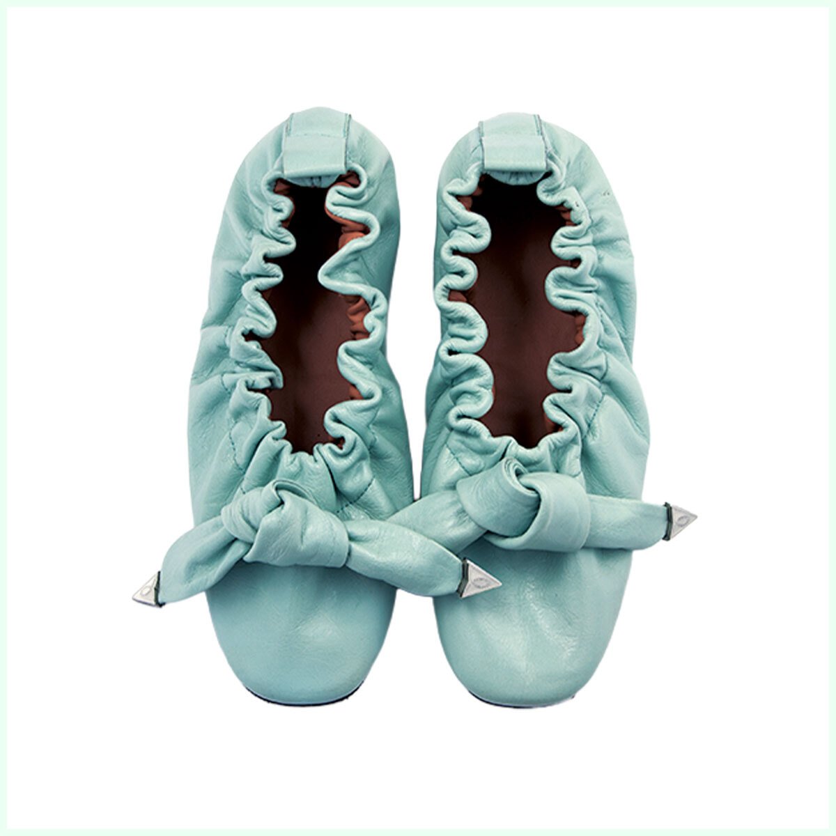 ギャザーをたっぷり施した柔らかなレザーを使用したバレエシューズは足にぴったりフィットし、足取りも軽くなる。