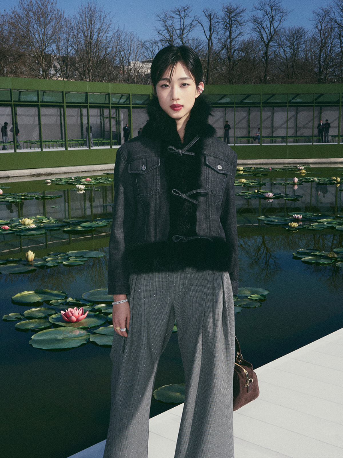そのショーに、日本からは俳優の河合優実が来場。当日はファーを効かせたデニムジャケットにワイドパンツを合わせたスタイルで登場した。フロントにあしらわれたリボンのディテールは、どこかクラシカルなニュアンスを感じさせながらも、肩の力を抜いたワイドパンツとの組み合わせによって、全体にリラックスした空気を生み出している。さらに、鮮やかな赤いリップが装いにシャープな印象を添え、スタイル全体を引き締めていた。