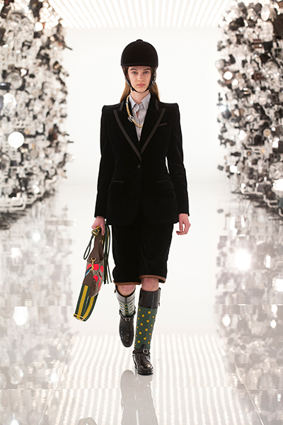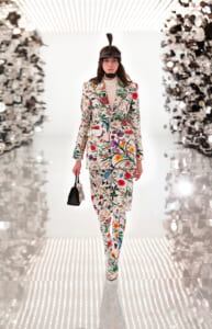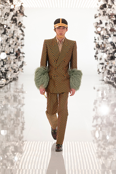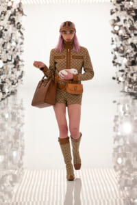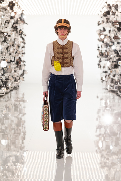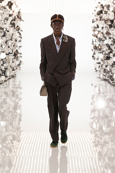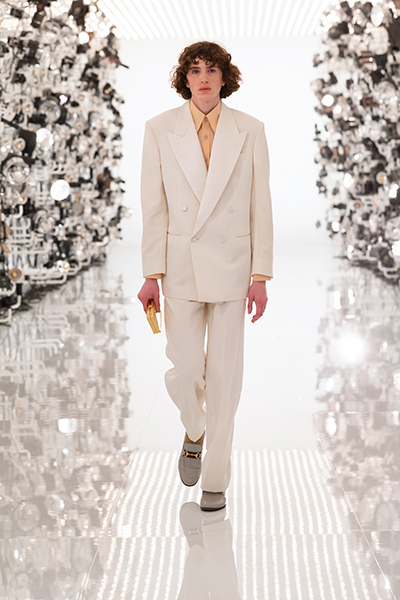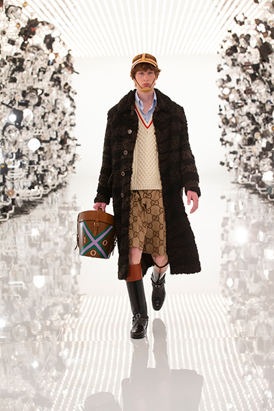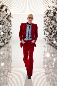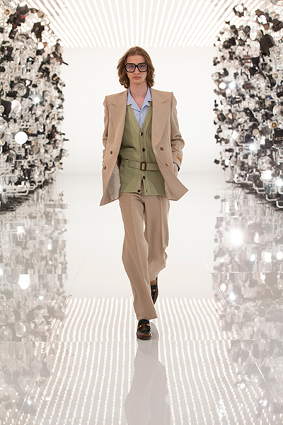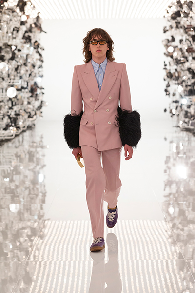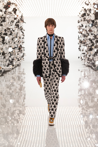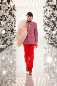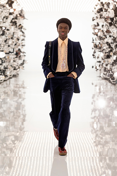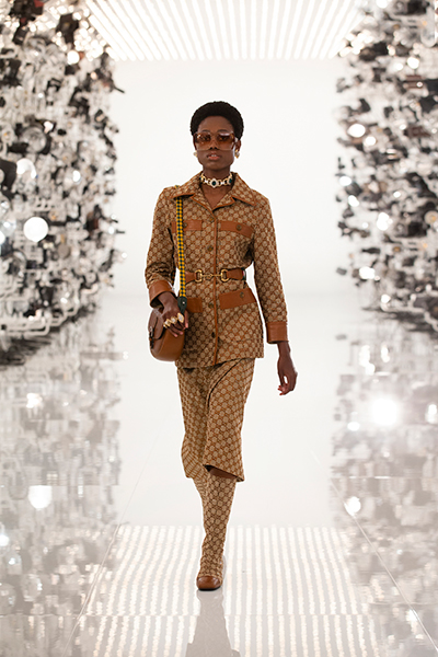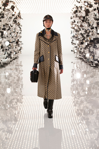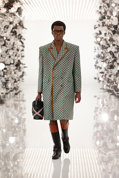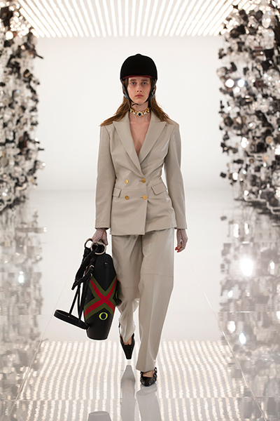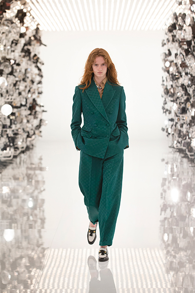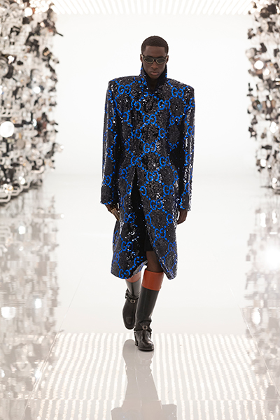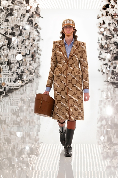 創設100年目の今年、新コレクション「ARIA(アリア)」のムービーは、ひとりの青年がネオン煌めく‟サヴォイ・クラブ”に入るシーンから始まる。無数のライトが照らし出したのは、ブランドのルーツ、乗馬の世界。ジョッキーブーツやヘルメット、ロングケープをはじめ、ホースビット ローファーなど定番の数々が登場。さらにアレッサンドロ・ミケーレは「デムナ・ヴァザリアの反逆的な精神と、トム・フォードのセクシュアルな緊張感を奪い取りました」と語り、いままでにない‟ハッキング(盗みとる)プロジェクト”を発表。バレンシアガとグッチのふたつのロゴが並んだグラフィックや、GGパターンで製作したバレンシアガの象徴的なビッグサイズのコート、左右非対称のアウターなどを披露。1990年代後半にトム・フォードがデザインし一世を風靡したグッチのベルベットスーツも蘇らせた。