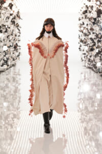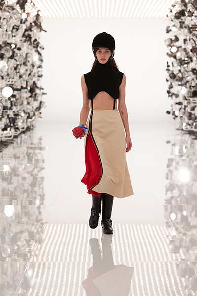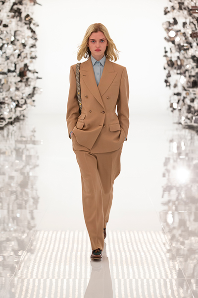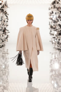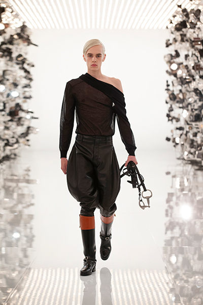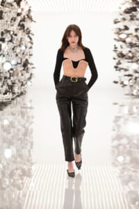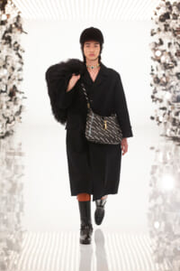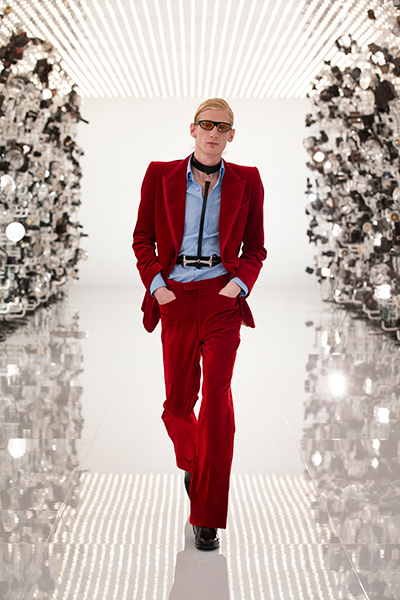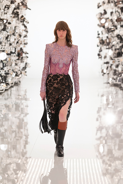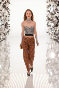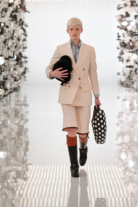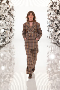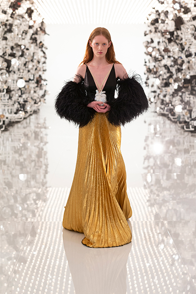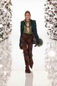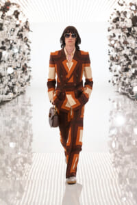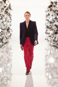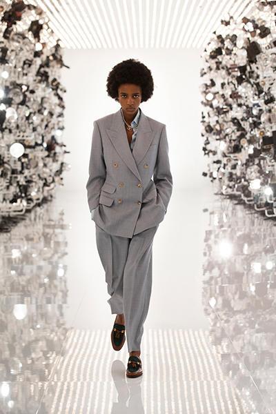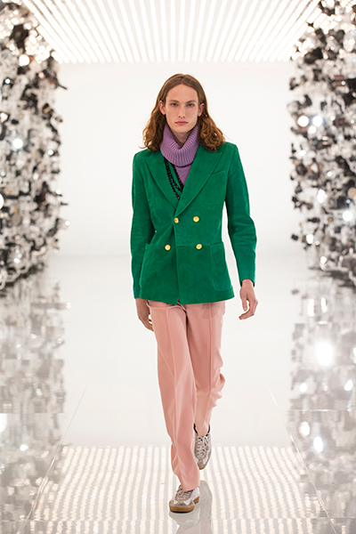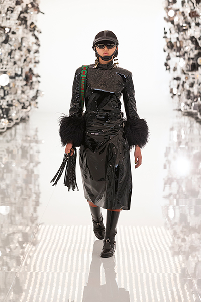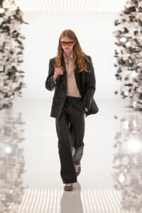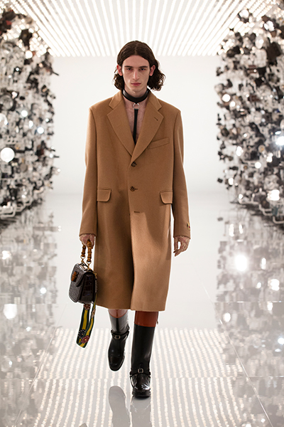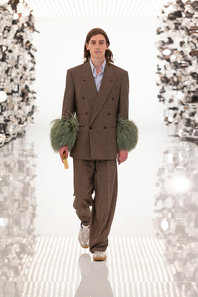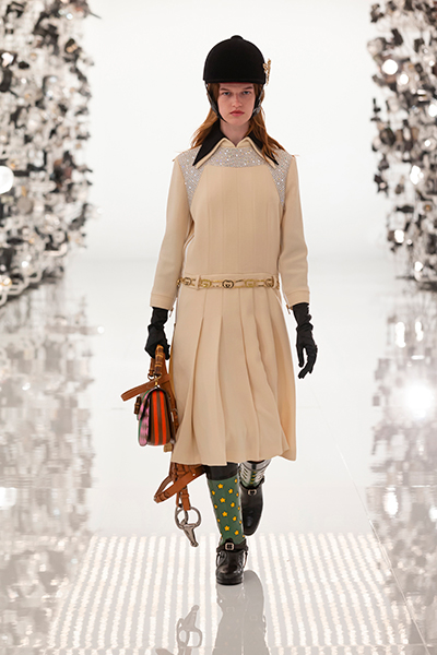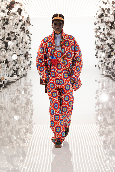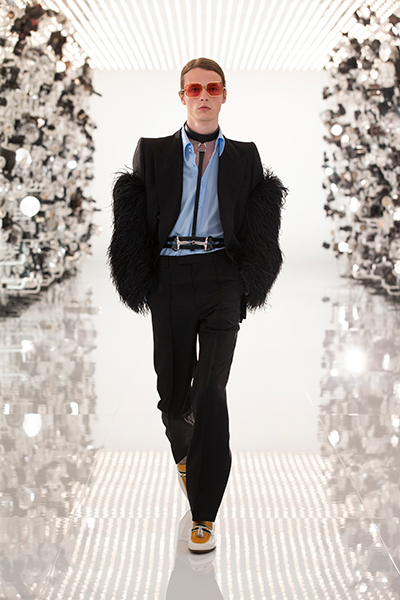 創設100年目の今年、新コレクション「ARIA(アリア)」のムービーは、ひとりの青年がネオン煌めく‟サヴォイ・クラブ”に入るシーンから始まる。無数のライトが照らし出したのは、ブランドのルーツ、乗馬の世界。ジョッキーブーツやヘルメット、ロングケープをはじめ、ホースビット ローファーなど定番の数々が登場。さらにアレッサンドロ・ミケーレは「デムナ・ヴァザリアの反逆的な精神と、トム・フォードのセクシュアルな緊張感を奪い取りました」と語り、いままでにない‟ハッキング(盗みとる)プロジェクト”を発表。バレンシアガとグッチのふたつのロゴが並んだグラフィックや、GGパターンで製作したバレンシアガの象徴的なビッグサイズのコート、左右非対称のアウターなどを披露。1990年代後半にトム・フォードがデザインし一世を風靡したグッチのベルベットスーツも蘇らせた。