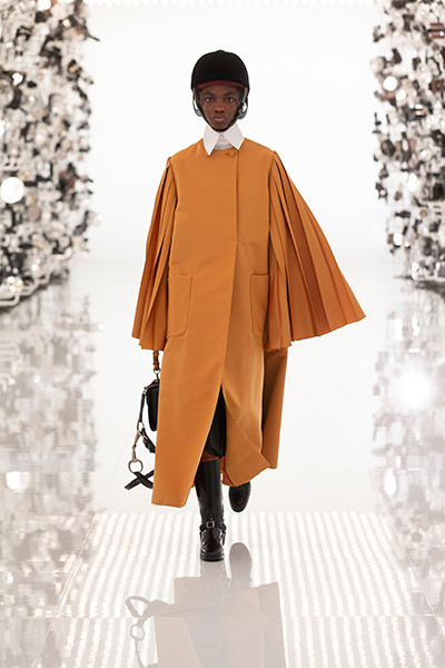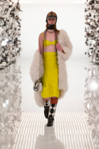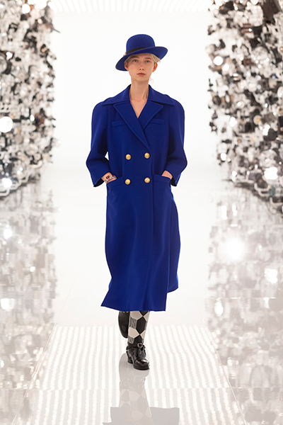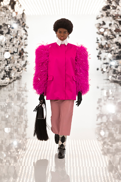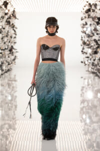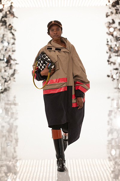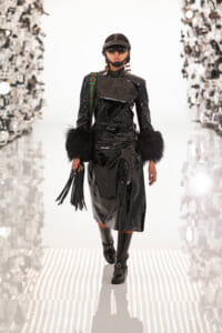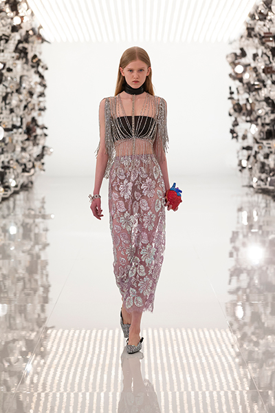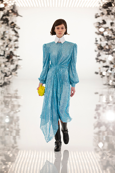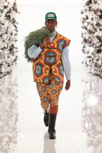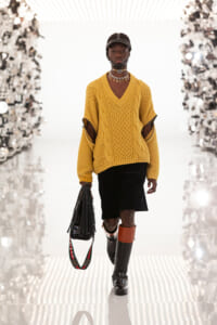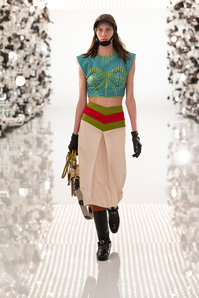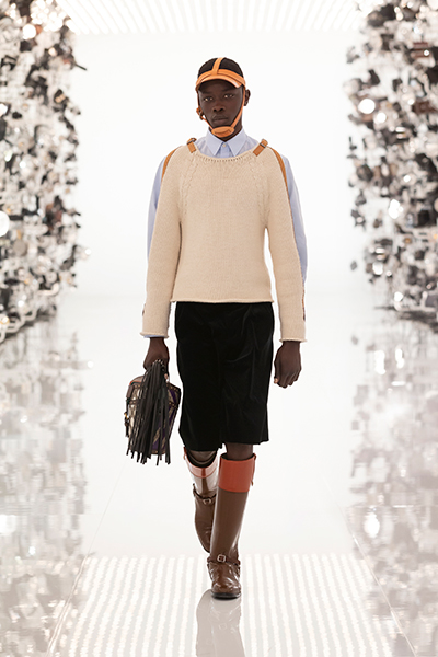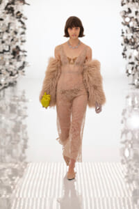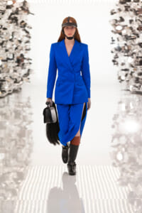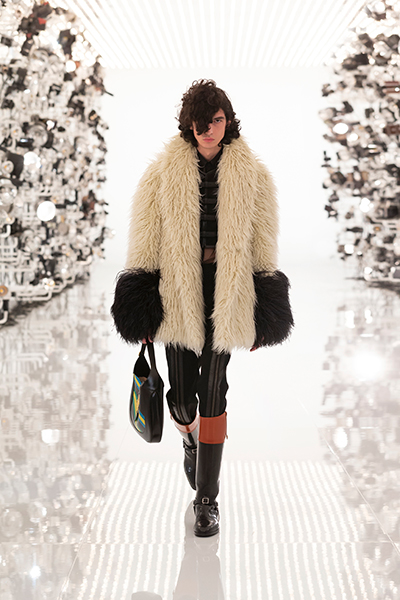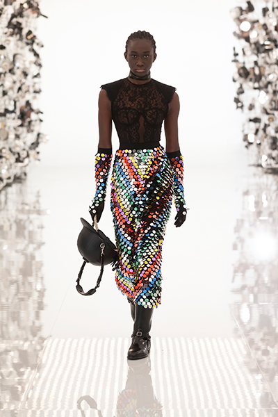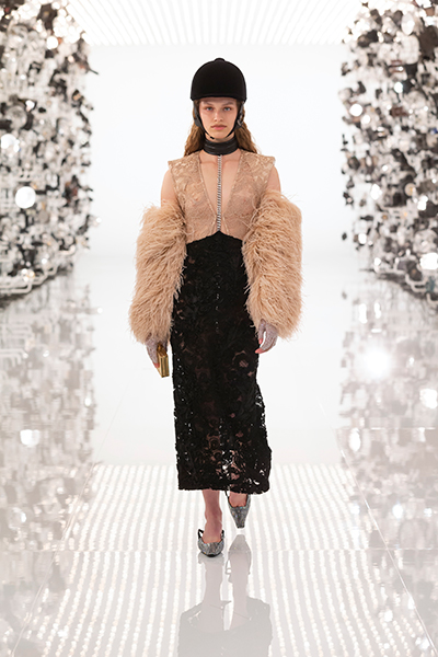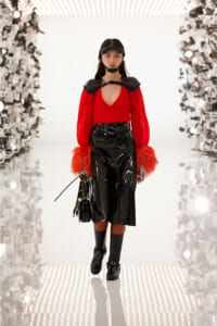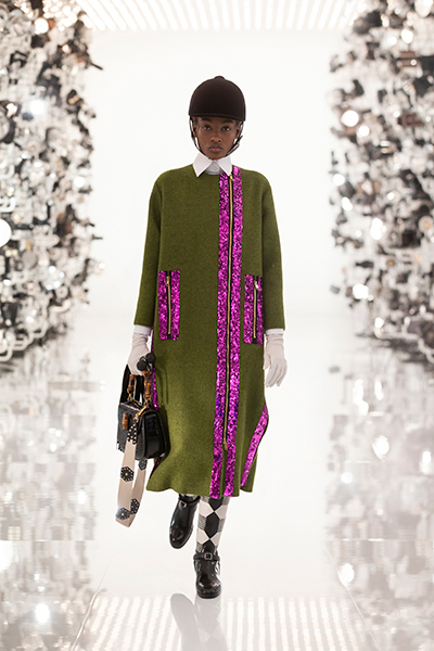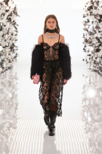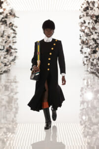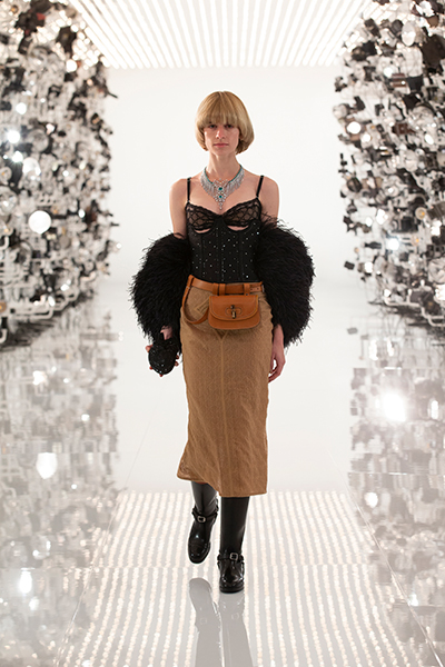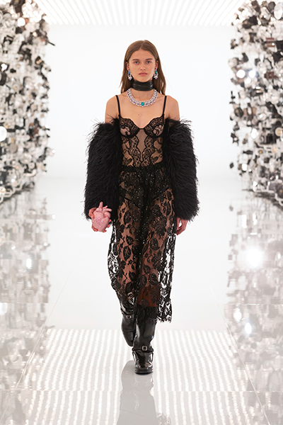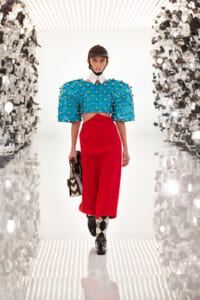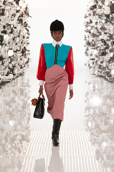創設100年目の今年、新コレクション「ARIA(アリア)」のムービーは、ひとりの青年がネオン煌めく‟サヴォイ・クラブ”に入るシーンから始まる。無数のライトが照らし出したのは、ブランドのルーツ、乗馬の世界。ジョッキーブーツやヘルメット、ロングケープをはじめ、ホースビット ローファーなど定番の数々が登場。さらにアレッサンドロ・ミケーレは「デムナ・ヴァザリアの反逆的な精神と、トム・フォードのセクシュアルな緊張感を奪い取りました」と語り、いままでにない‟ハッキング(盗みとる)プロジェクト”を発表。バレンシアガとグッチのふたつのロゴが並んだグラフィックや、GGパターンで製作したバレンシアガの象徴的なビッグサイズのコート、左右非対称のアウターなどを披露。1990年代後半にトム・フォードがデザインし一世を風靡したグッチのベルベットスーツも蘇らせた。