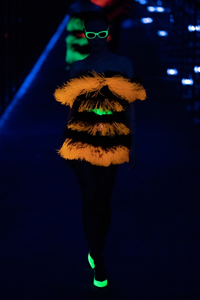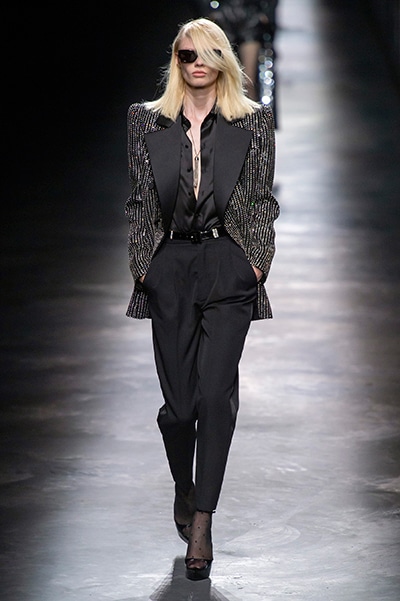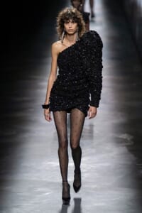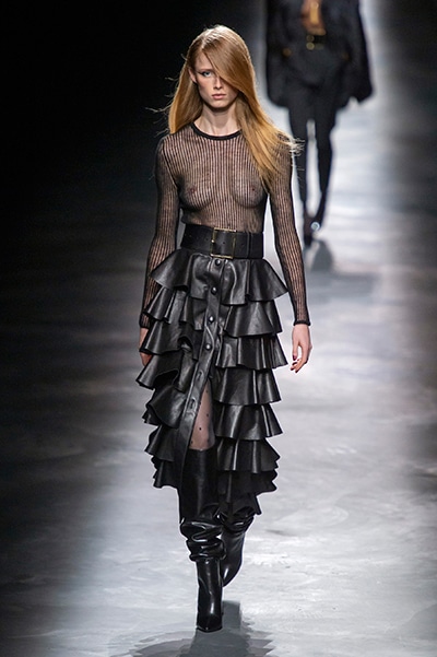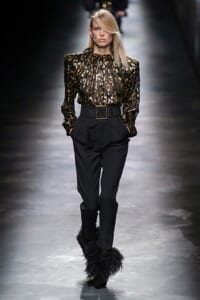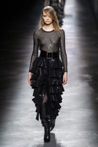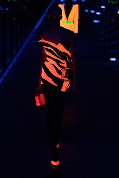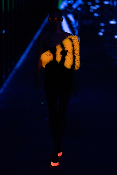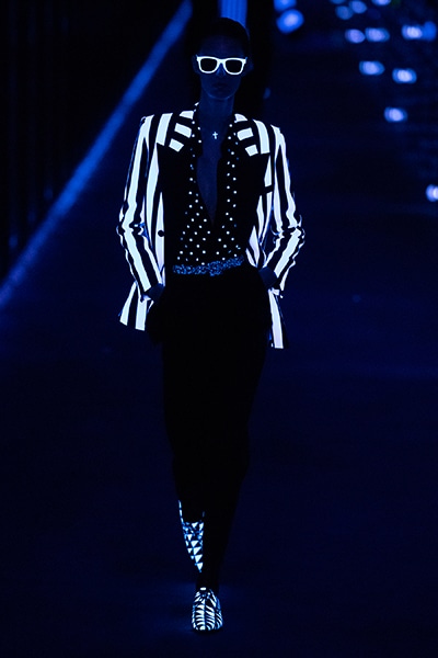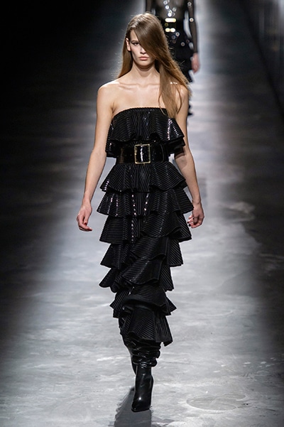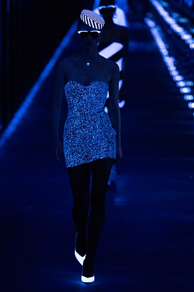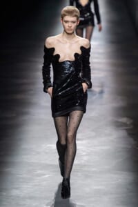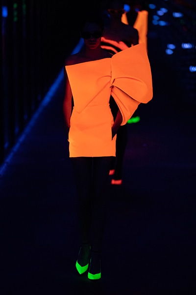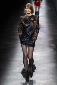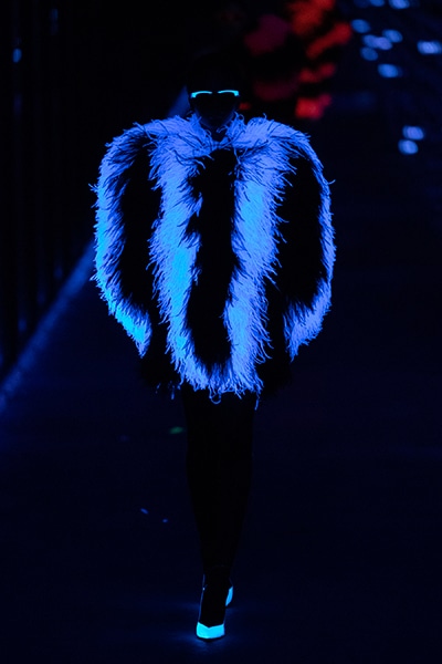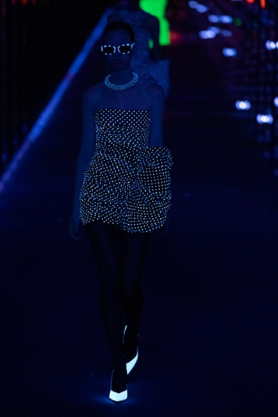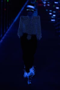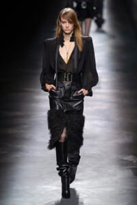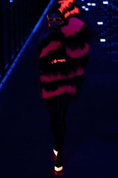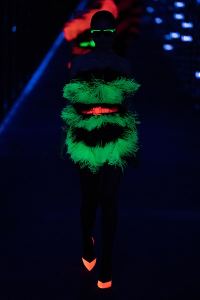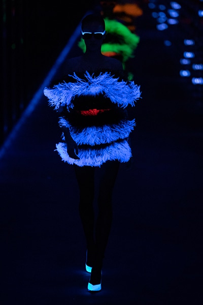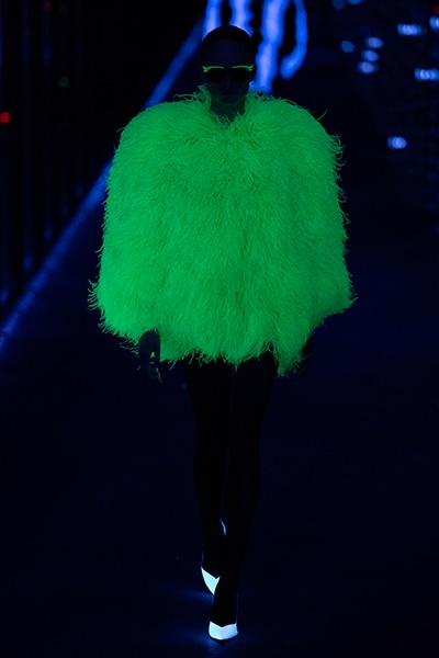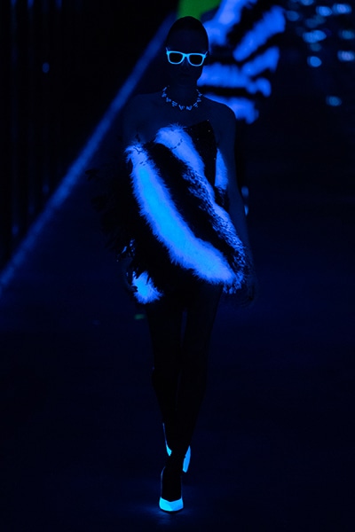 2019-20年秋冬コレクションも、エッフェル塔の目の前、パリのトロカデロ広場を舞台にショーを行ったサンローラン。ブラックをメインにしたスタイルで、スクエアショルダーのコートに胸元を大きく開けたトップ、サテンのカマーベルト付きパンツを合わせたマニッシュなスタイルなどを提案。またミニ丈のスカートやミニドレスのデザインが多かったアンソニー・ヴァカレロだが今季は、ティアードスカートやファー付きの膝下丈スカートも提案し、よりシックで大人っぽい女性像に。ラストは、ブラックライトの演出でネオンカラーに発光するウエアや小物で魅せた。
