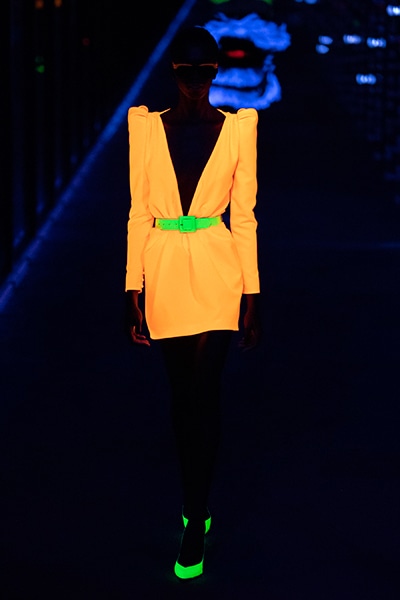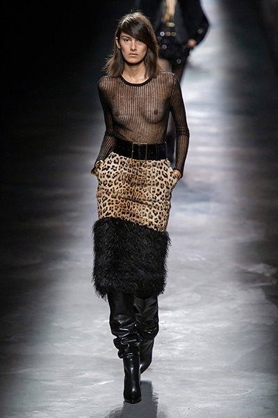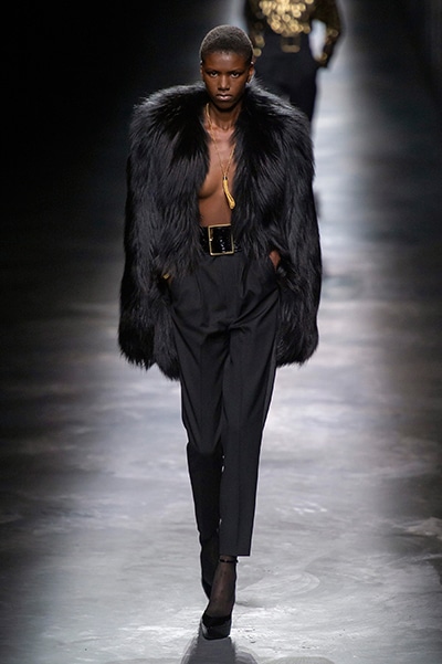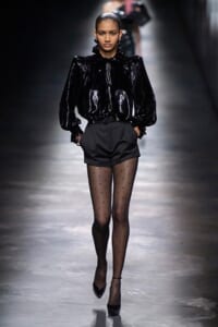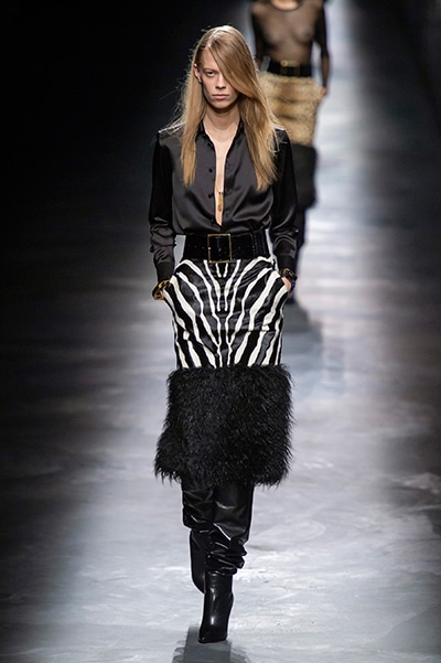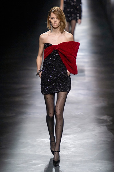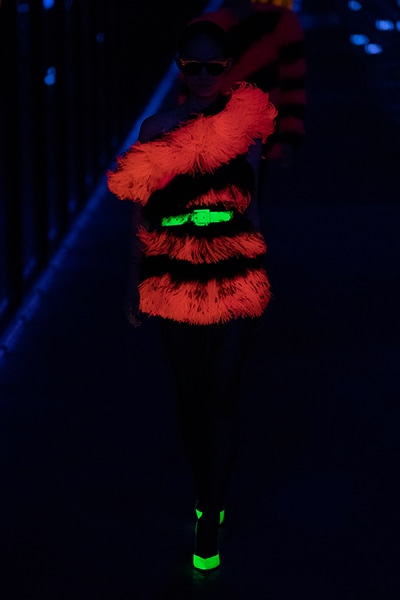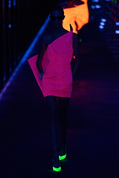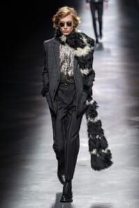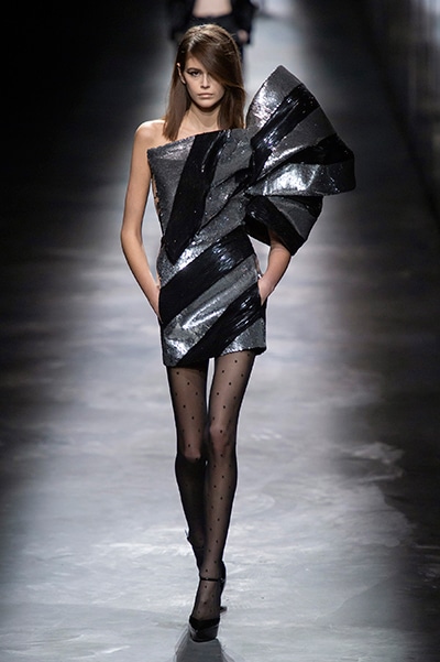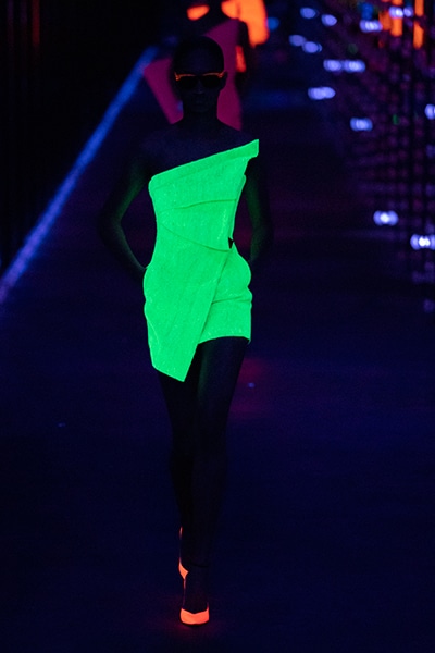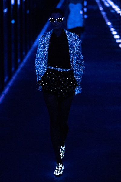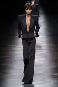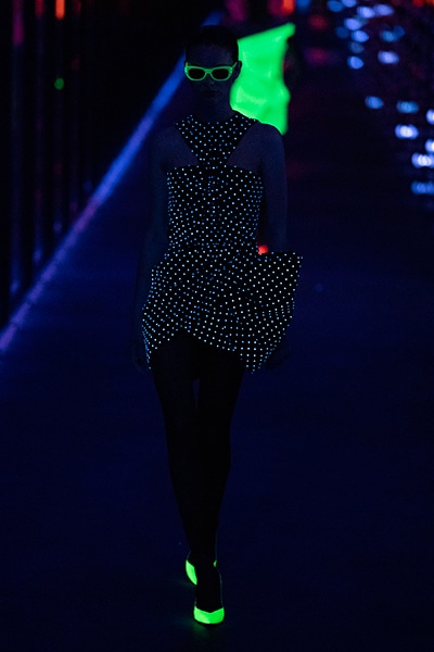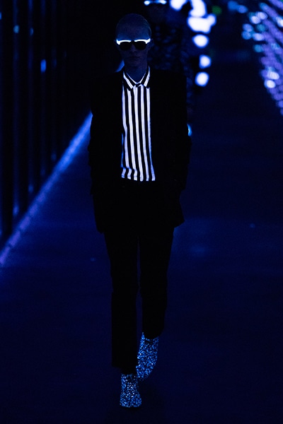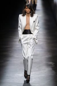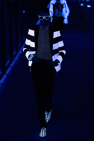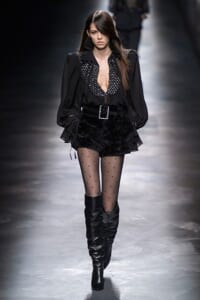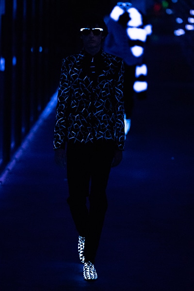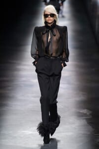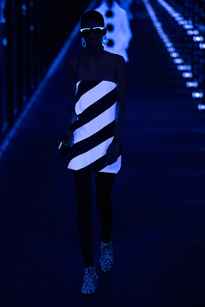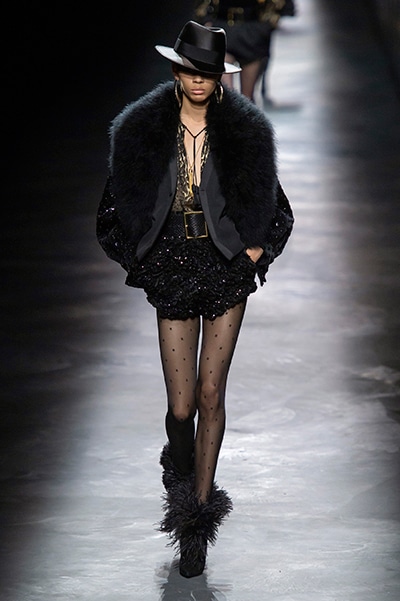 2019-20年秋冬コレクションも、エッフェル塔の目の前、パリのトロカデロ広場を舞台にショーを行ったサンローラン。ブラックをメインにしたスタイルで、スクエアショルダーのコートに胸元を大きく開けたトップ、サテンのカマーベルト付きパンツを合わせたマニッシュなスタイルなどを提案。またミニ丈のスカートやミニドレスのデザインが多かったアンソニー・ヴァカレロだが今季は、ティアードスカートやファー付きの膝下丈スカートも提案し、よりシックで大人っぽい女性像に。ラストは、ブラックライトの演出でネオンカラーに発光するウエアや小物で魅せた。