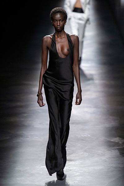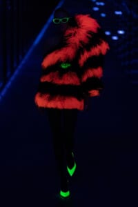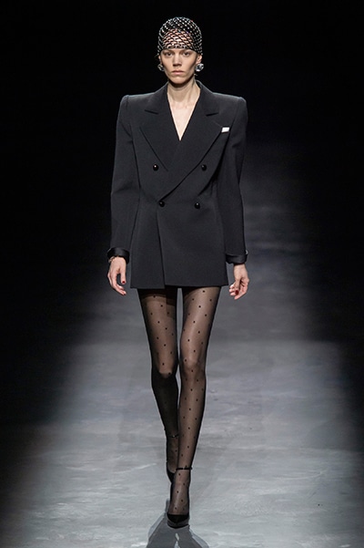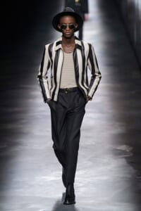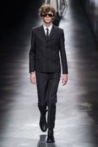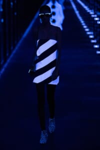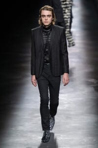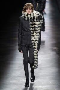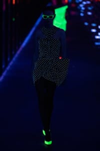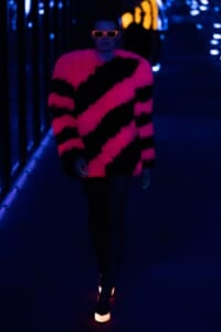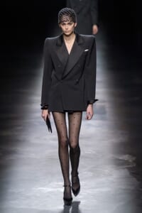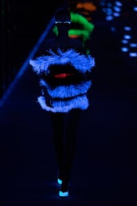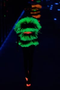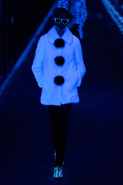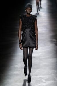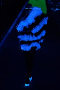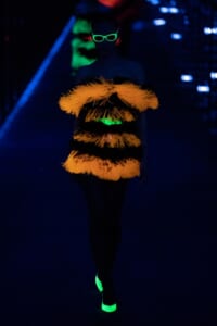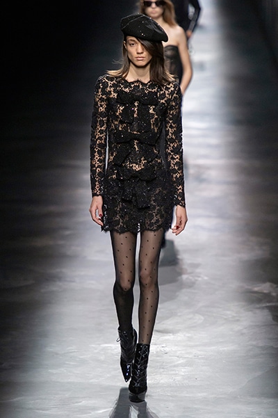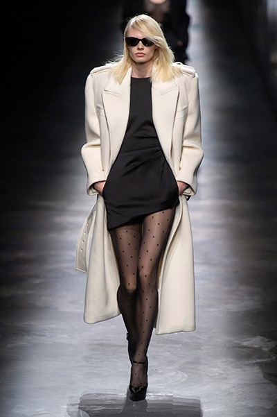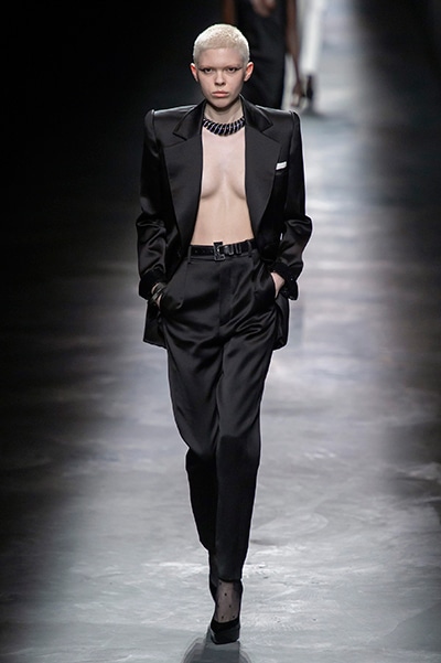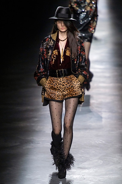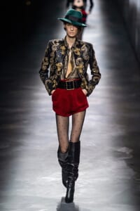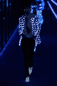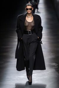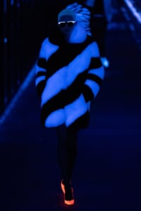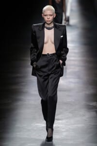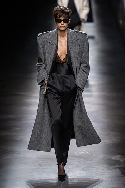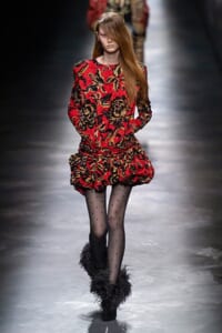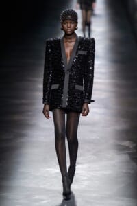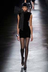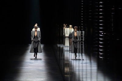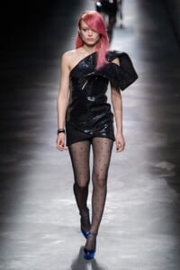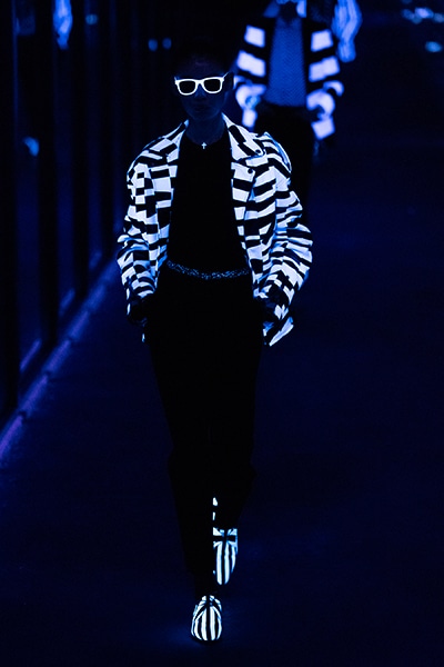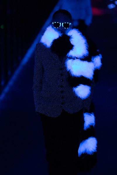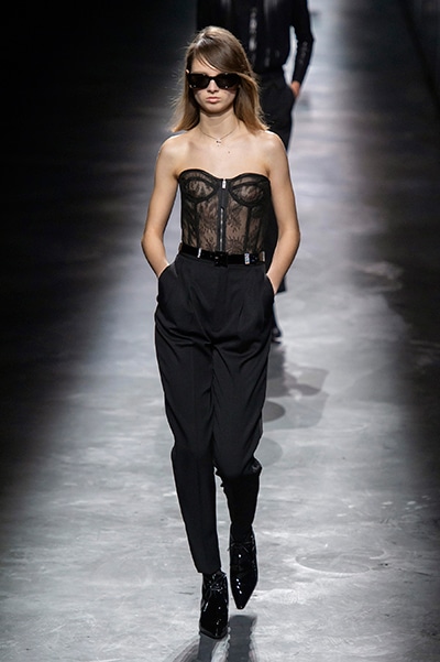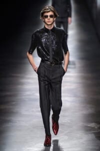 2019-20年秋冬コレクションも、エッフェル塔の目の前、パリのトロカデロ広場を舞台にショーを行ったサンローラン。ブラックをメインにしたスタイルで、スクエアショルダーのコートに胸元を大きく開けたトップ、サテンのカマーベルト付きパンツを合わせたマニッシュなスタイルなどを提案。またミニ丈のスカートやミニドレスのデザインが多かったアンソニー・ヴァカレロだが今季は、ティアードスカートやファー付きの膝下丈スカートも提案し、よりシックで大人っぽい女性像に。ラストは、ブラックライトの演出でネオンカラーに発光するウエアや小物で魅せた。