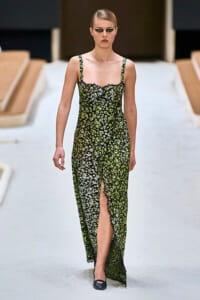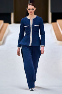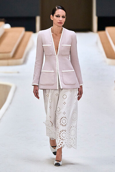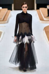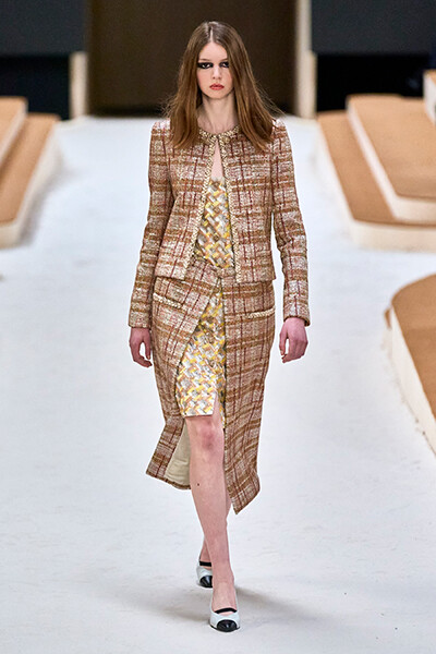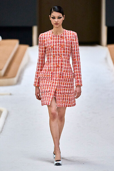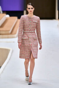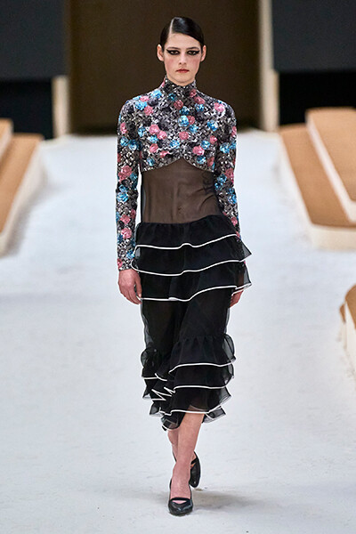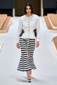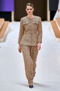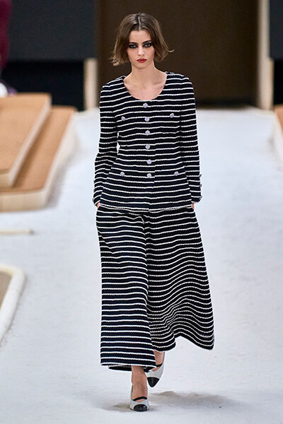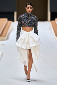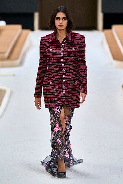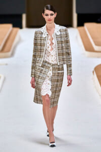 幕開けは、ツイードのジャケットを着たシャルロット・カシラギが馬で登場する幻想的なシーン。続いて、20年代アバンギャルドの空気を感じさせる、モダンなルックをまとったモデルたちが次々と登場した。ツイードや刺繍にはジオメトリックなモチーフが登場し、メゾンを象徴するカメリアも構成主義的なデザインに。印象派の女性たちを描いた先シーズンとは一変したイメージで、メゾンのコードとスタイルに、また新しい息吹を吹き込んだ。