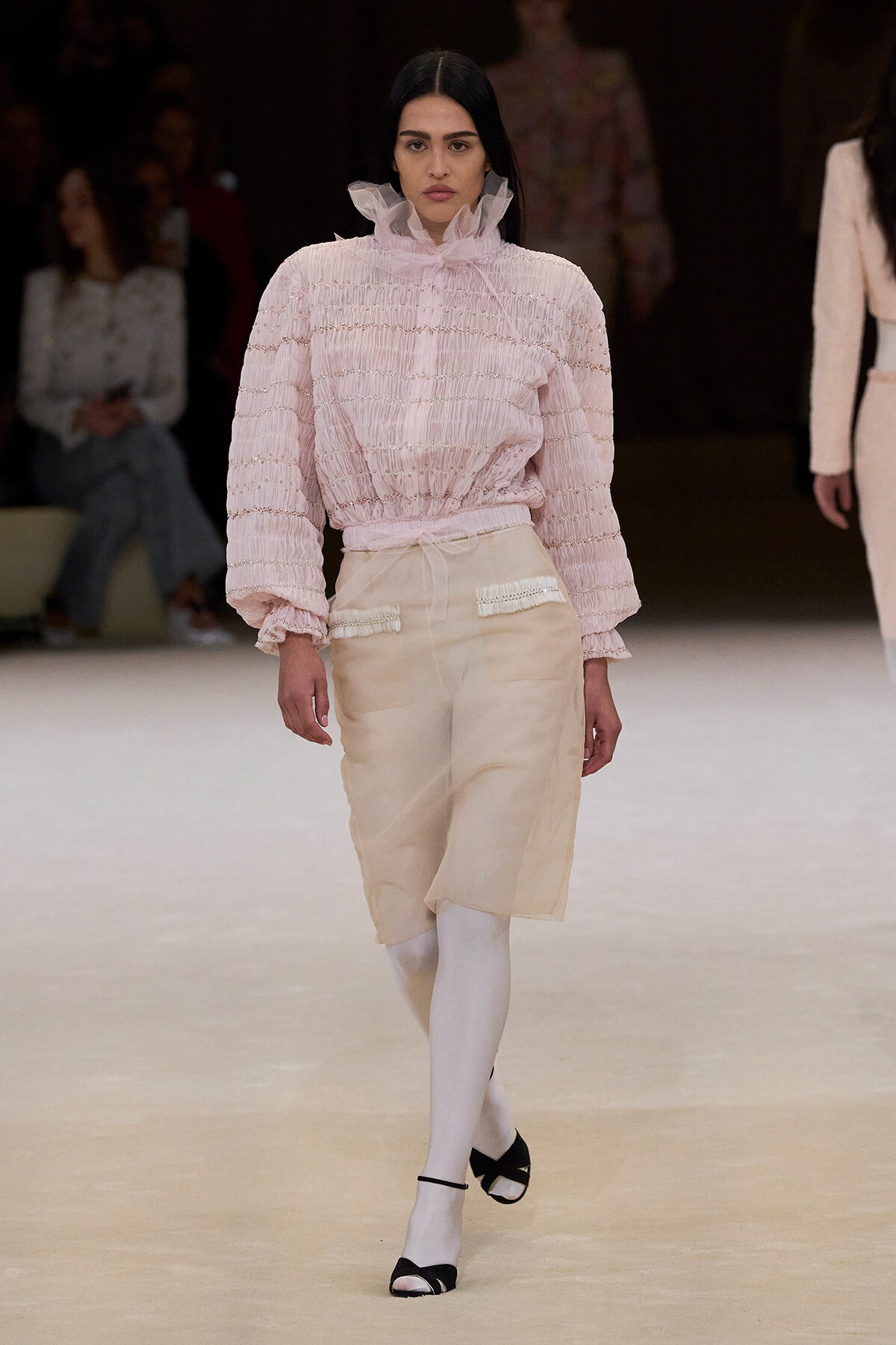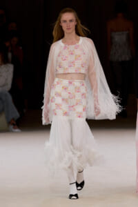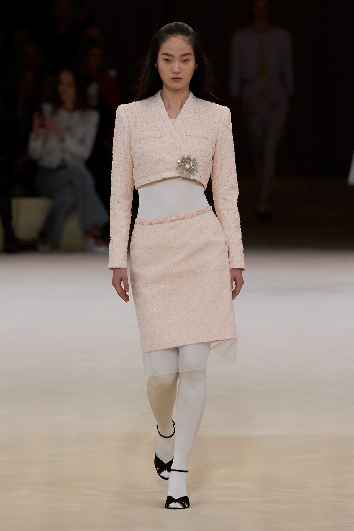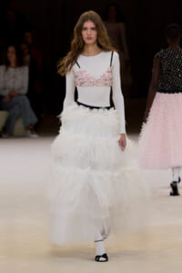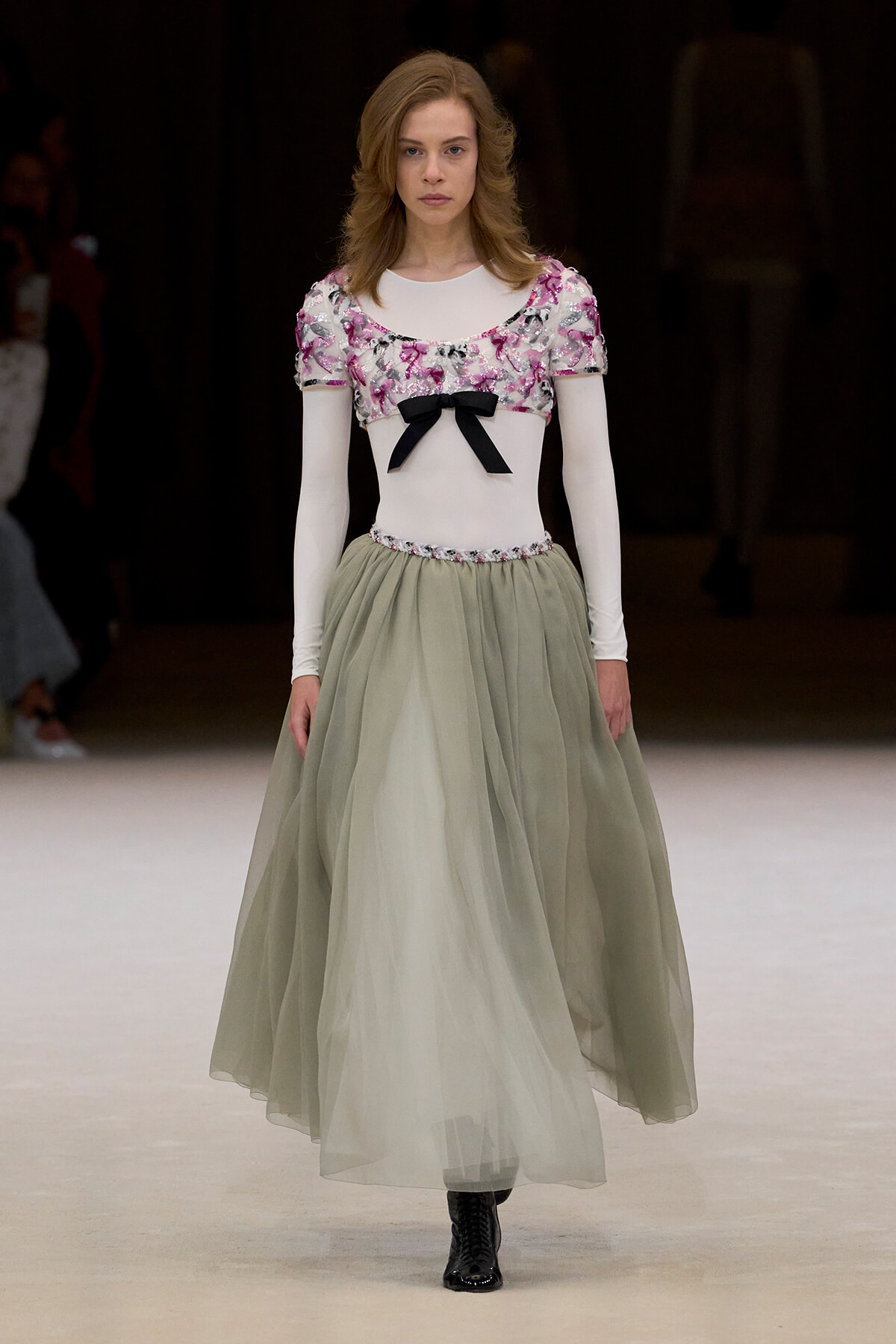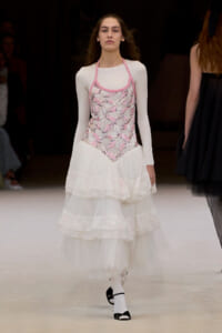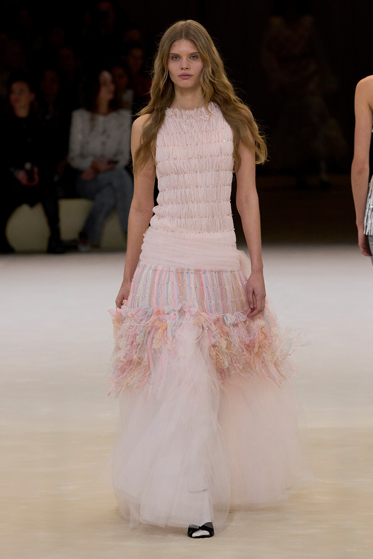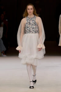 2024年は、ガブリエル・シャネルが初めてバレエ衣装をデザインしてから一世紀を迎え、メゾンとダンスの絆の強さを再認識する一年。ヴィルジニーは「ダンスはシャネルにとって重要ですし、このテーマについて思いを巡らせることもしばしばあります。メゾンは、ダンス業界や振付師、ダンサーたちと友好な関係を築いており、バレエ衣装も制作しています。私たちは身体と衣装が持つ力と優雅さを、チュールやフリル。プリーツ、レースで構成された、極めて軽やかなで優美なコレクションに集約させてみようと試みました」と話す。まるで水彩で描いたようなピンクやホワイトを基調にしたコレクションは、優雅で自由。そして女性たちのあらゆる動きに寄り添う精巧なクリエーションは、シャネルが誇る高いサヴォアフェールの力が遺憾無く発揮されている。