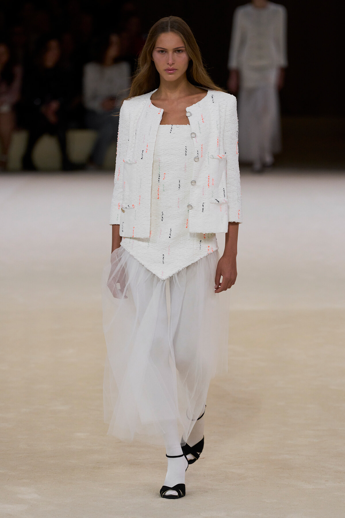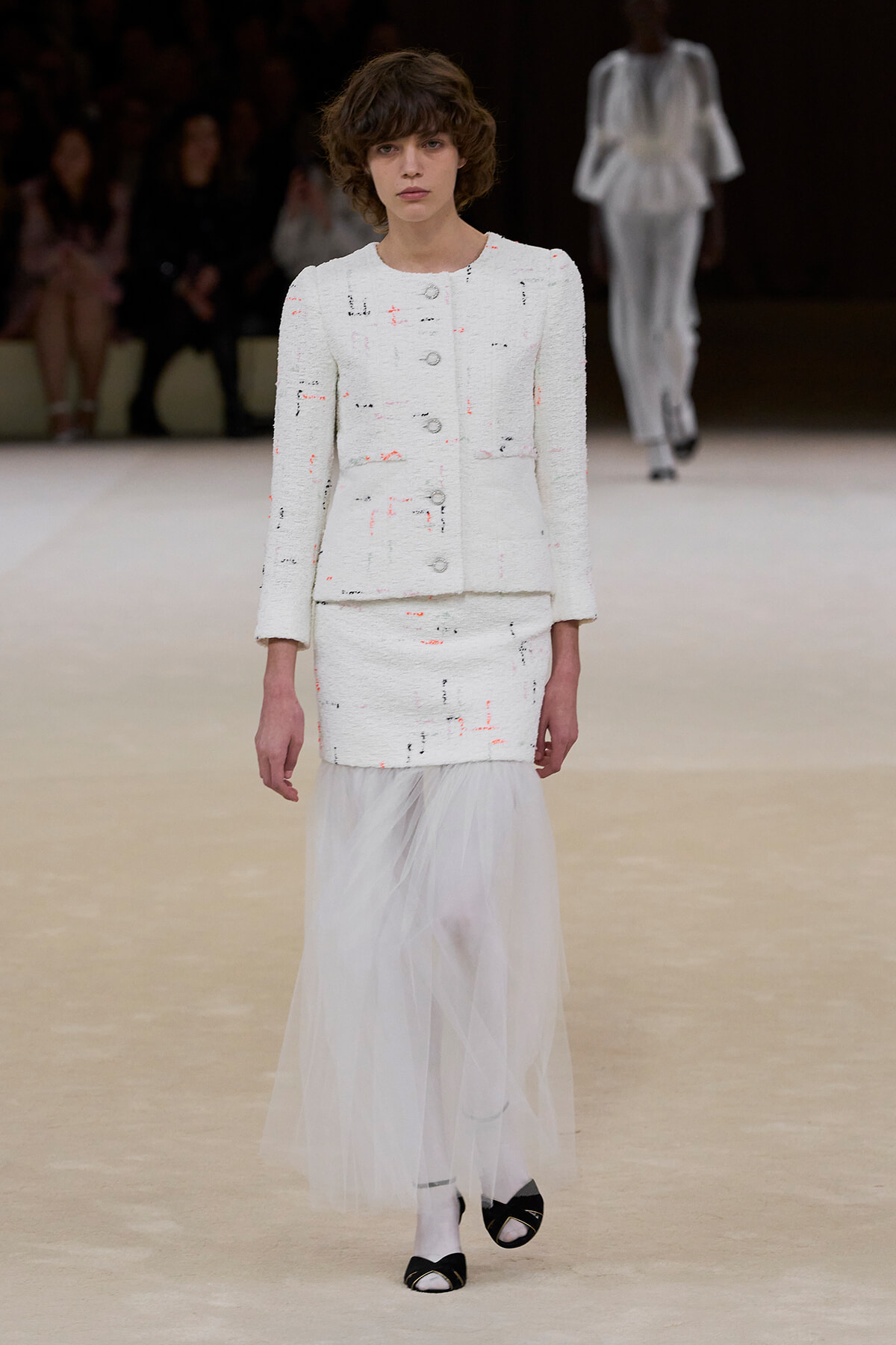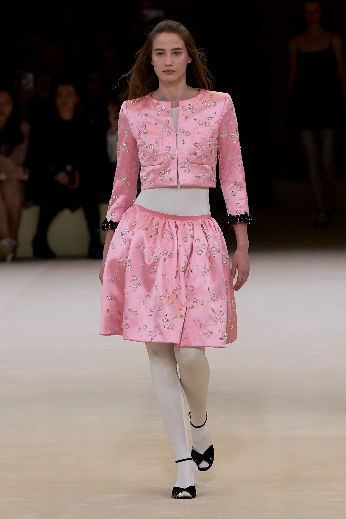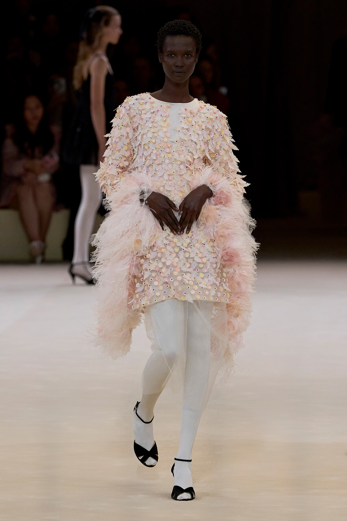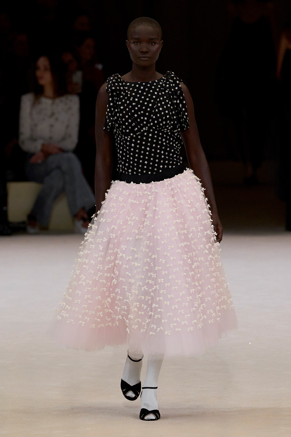 2024年は、ガブリエル・シャネルが初めてバレエ衣装をデザインしてから一世紀を迎え、メゾンとダンスの絆の強さを再認識する一年。ヴィルジニーは「ダンスはシャネルにとって重要ですし、このテーマについて思いを巡らせることもしばしばあります。メゾンは、ダンス業界や振付師、ダンサーたちと友好な関係を築いており、バレエ衣装も制作しています。私たちは身体と衣装が持つ力と優雅さを、チュールやフリル。プリーツ、レースで構成された、極めて軽やかなで優美なコレクションに集約させてみようと試みました」と話す。まるで水彩で描いたようなピンクやホワイトを基調にしたコレクションは、優雅で自由。そして女性たちのあらゆる動きに寄り添う精巧なクリエーションは、シャネルが誇る高いサヴォアフェールの力が遺憾無く発揮されている。