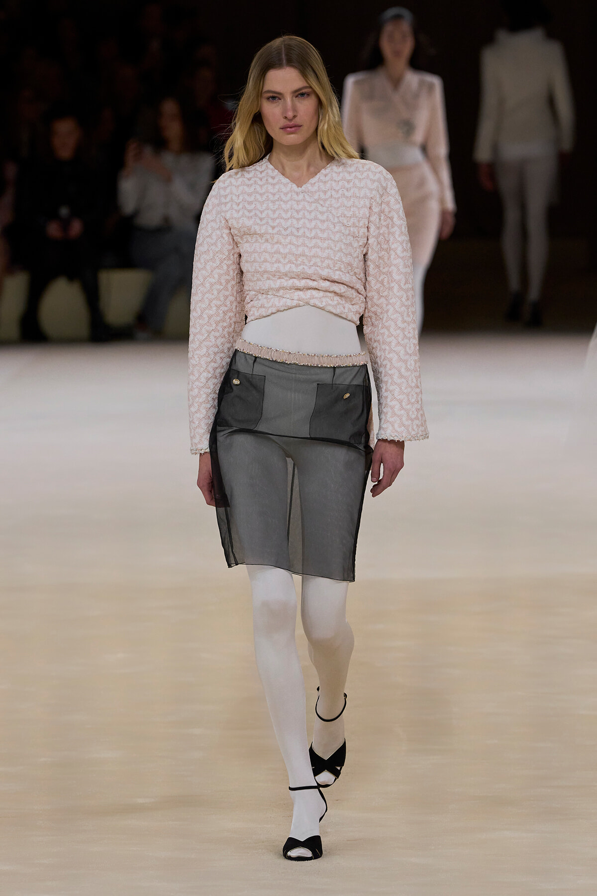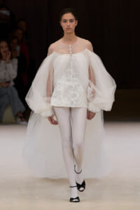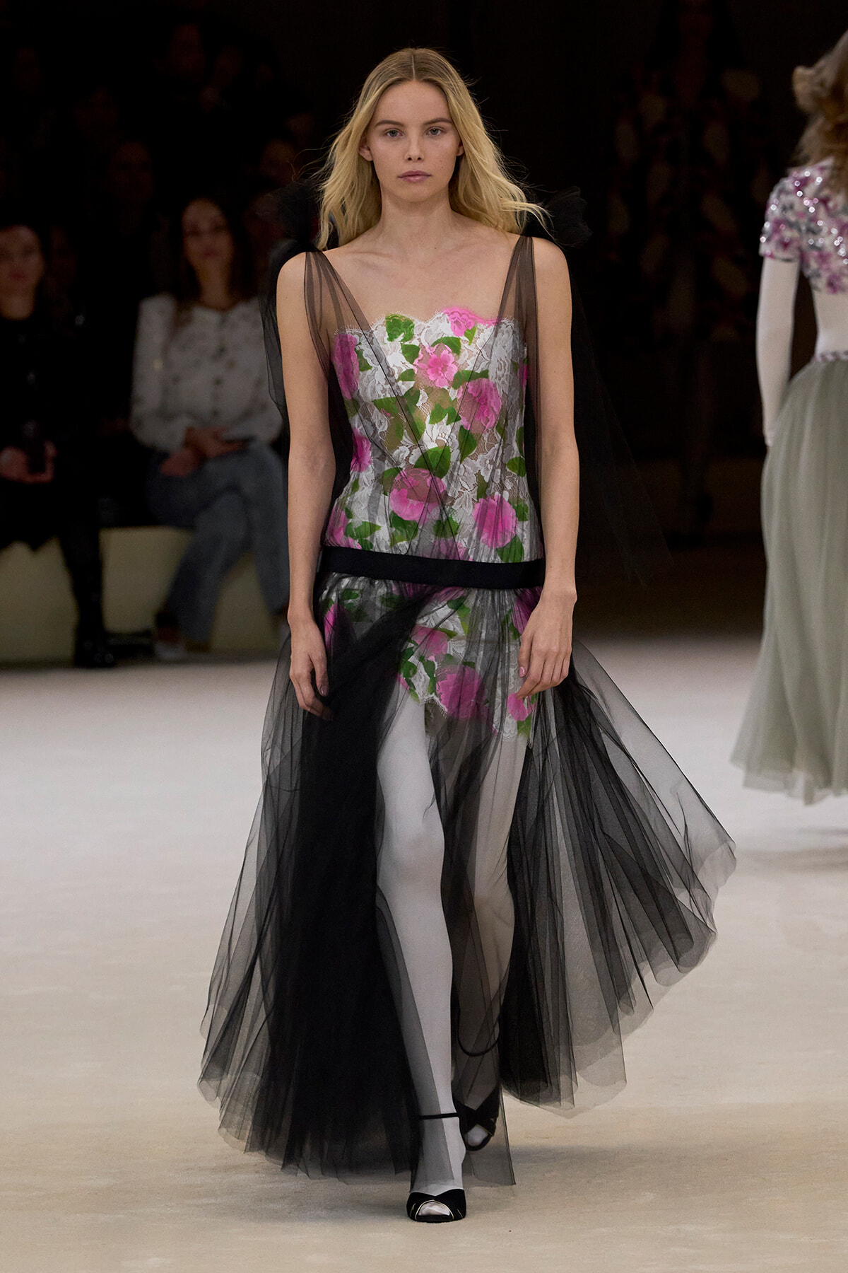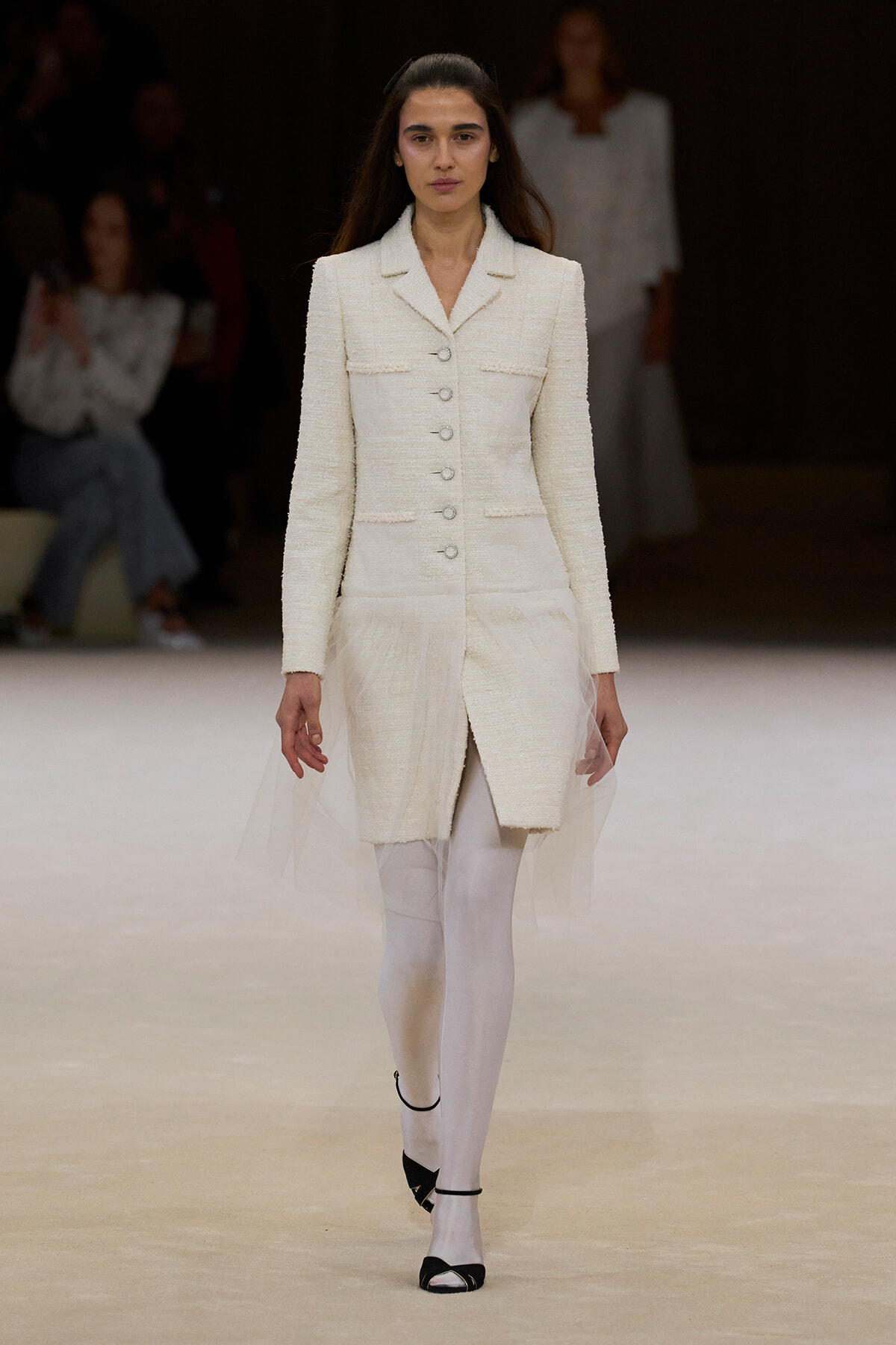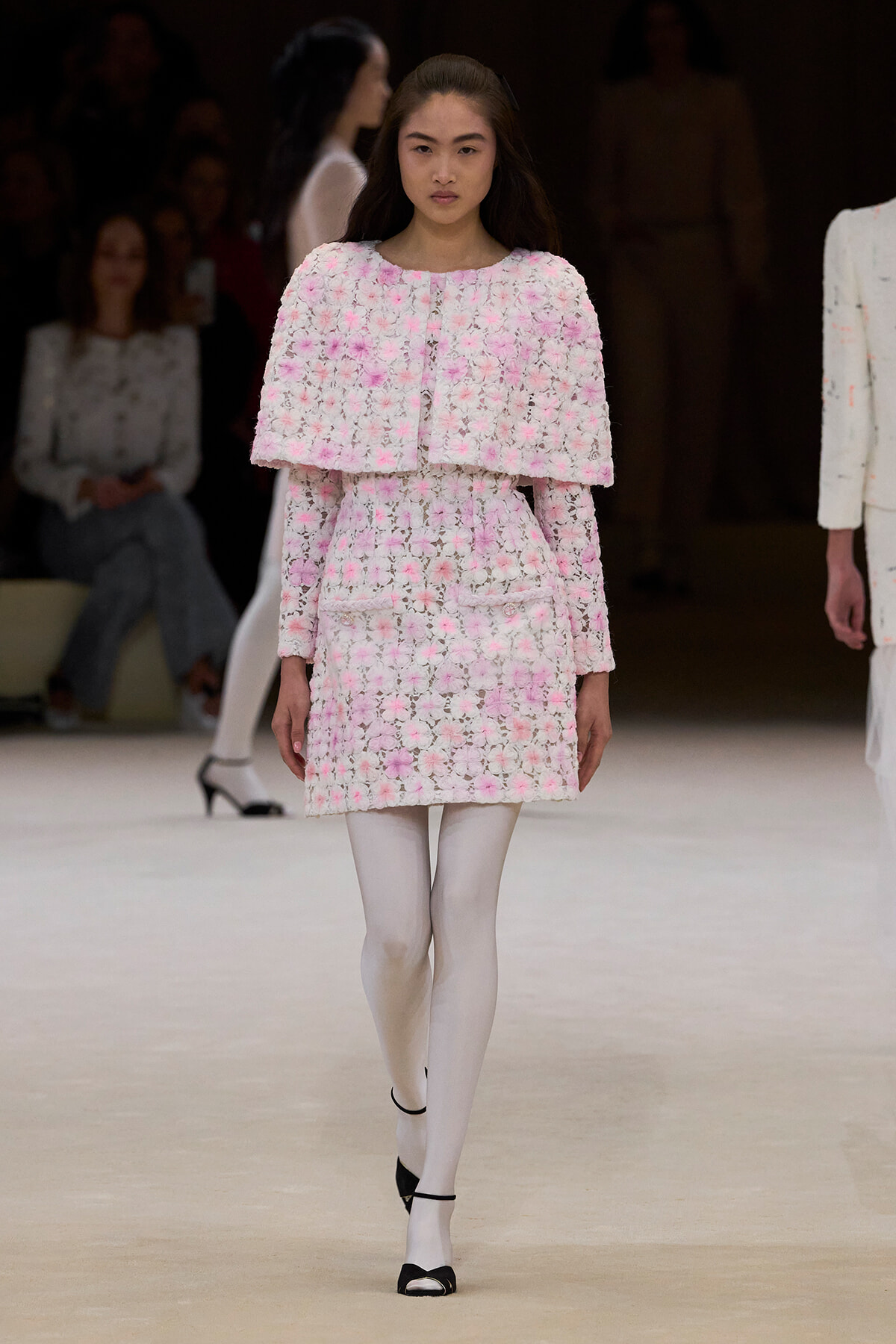 2024年は、ガブリエル・シャネルが初めてバレエ衣装をデザインしてから一世紀を迎え、メゾンとダンスの絆の強さを再認識する一年。ヴィルジニーは「ダンスはシャネルにとって重要ですし、このテーマについて思いを巡らせることもしばしばあります。メゾンは、ダンス業界や振付師、ダンサーたちと友好な関係を築いており、バレエ衣装も制作しています。私たちは身体と衣装が持つ力と優雅さを、チュールやフリル。プリーツ、レースで構成された、極めて軽やかなで優美なコレクションに集約させてみようと試みました」と話す。まるで水彩で描いたようなピンクやホワイトを基調にしたコレクションは、優雅で自由。そして女性たちのあらゆる動きに寄り添う精巧なクリエーションは、シャネルが誇る高いサヴォアフェールの力が遺憾無く発揮されている。
