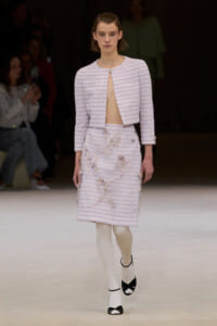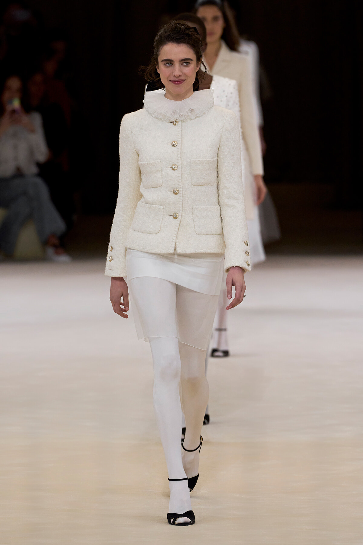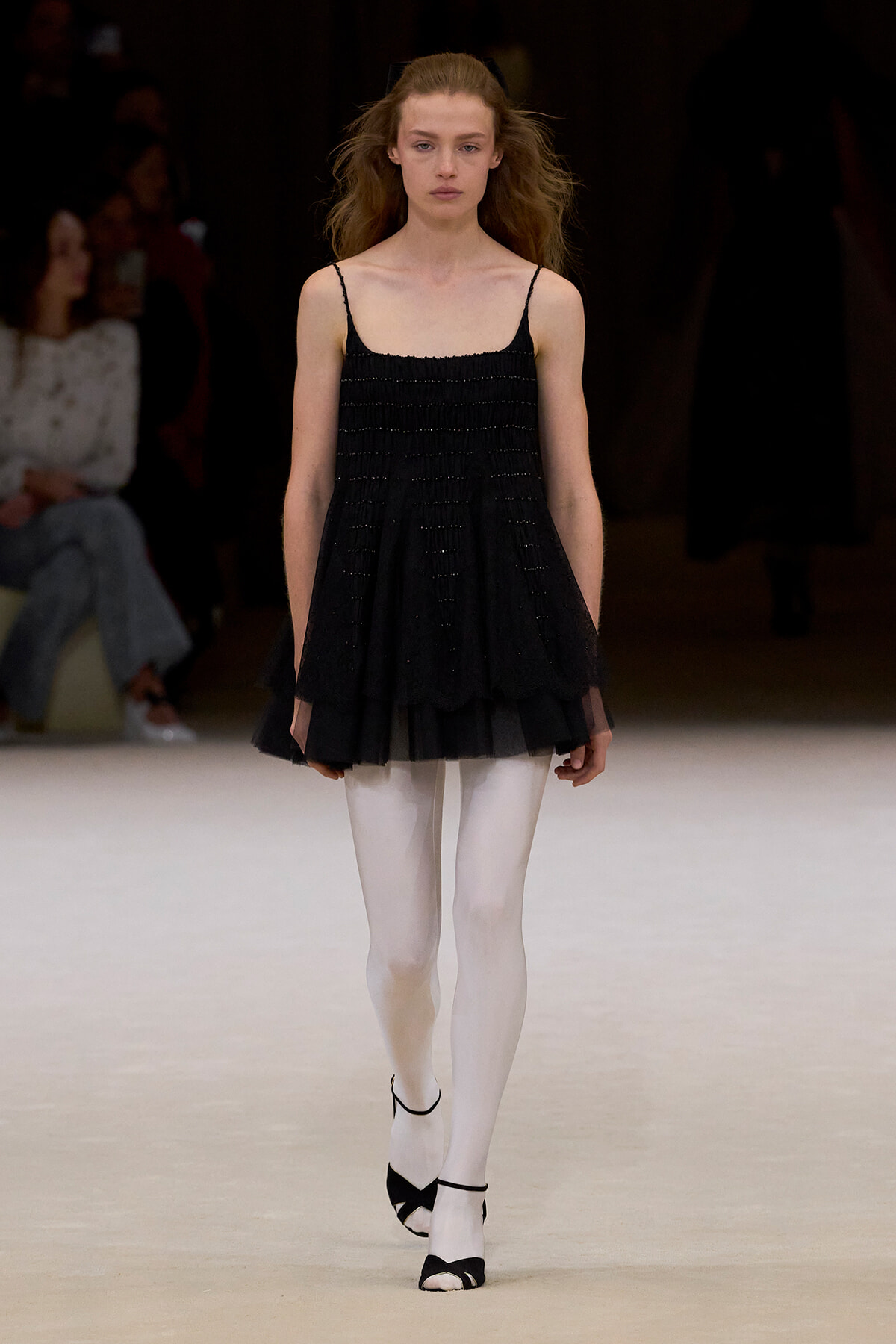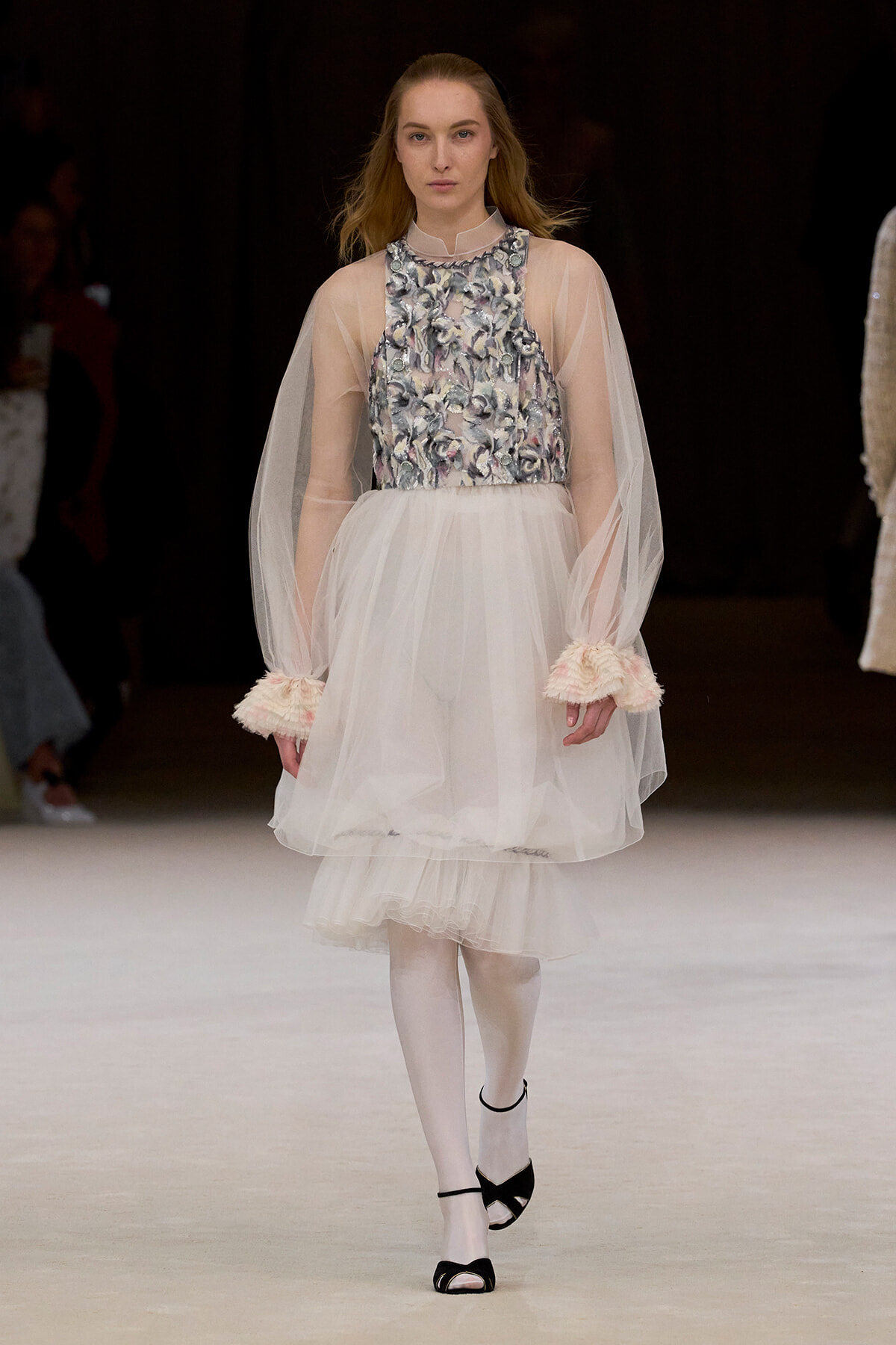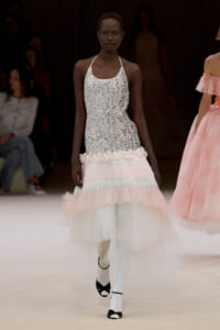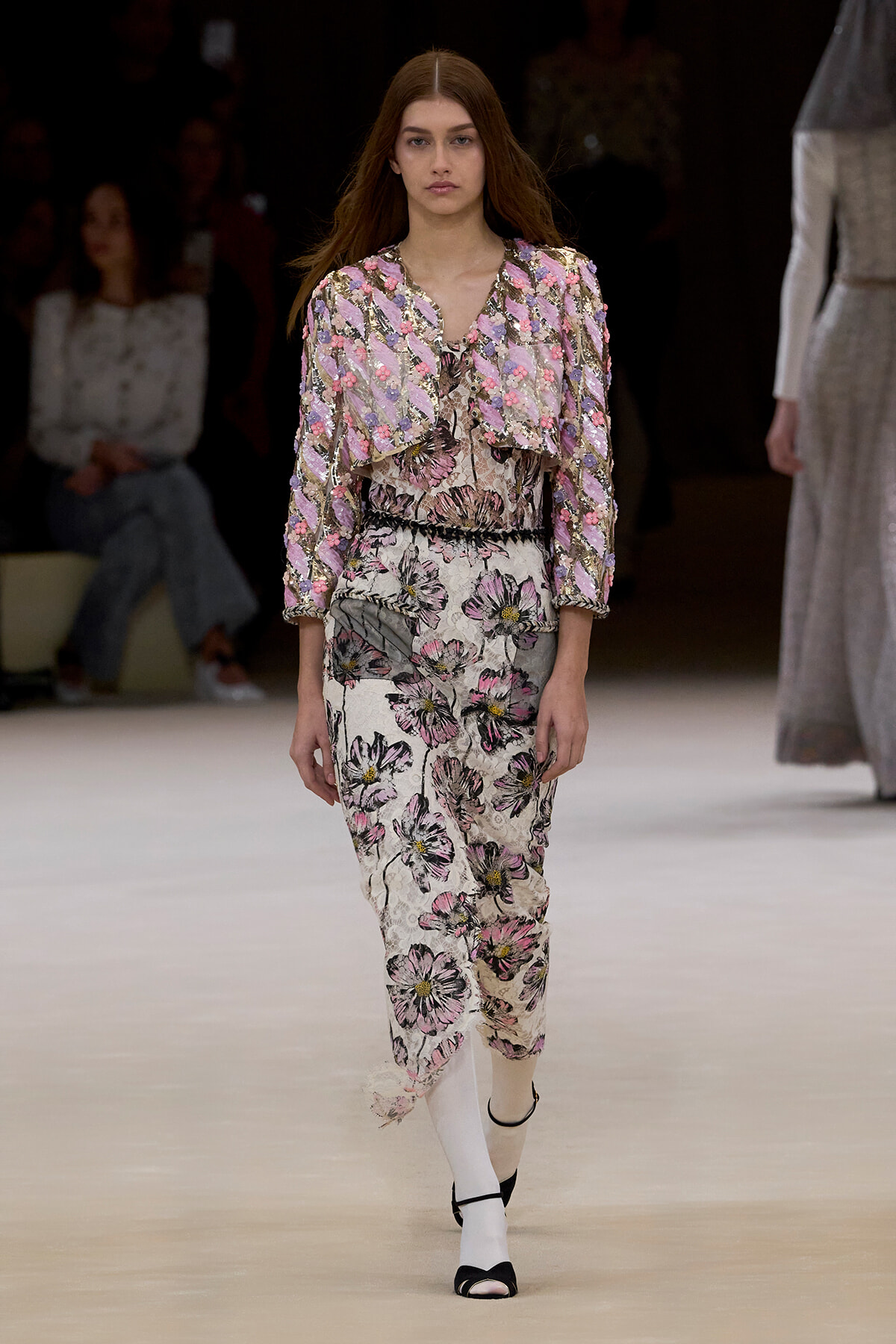 2024年は、ガブリエル・シャネルが初めてバレエ衣装をデザインしてから一世紀を迎え、メゾンとダンスの絆の強さを再認識する一年。ヴィルジニーは「ダンスはシャネルにとって重要ですし、このテーマについて思いを巡らせることもしばしばあります。メゾンは、ダンス業界や振付師、ダンサーたちと友好な関係を築いており、バレエ衣装も制作しています。私たちは身体と衣装が持つ力と優雅さを、チュールやフリル。プリーツ、レースで構成された、極めて軽やかなで優美なコレクションに集約させてみようと試みました」と話す。まるで水彩で描いたようなピンクやホワイトを基調にしたコレクションは、優雅で自由。そして女性たちのあらゆる動きに寄り添う精巧なクリエーションは、シャネルが誇る高いサヴォアフェールの力が遺憾無く発揮されている。