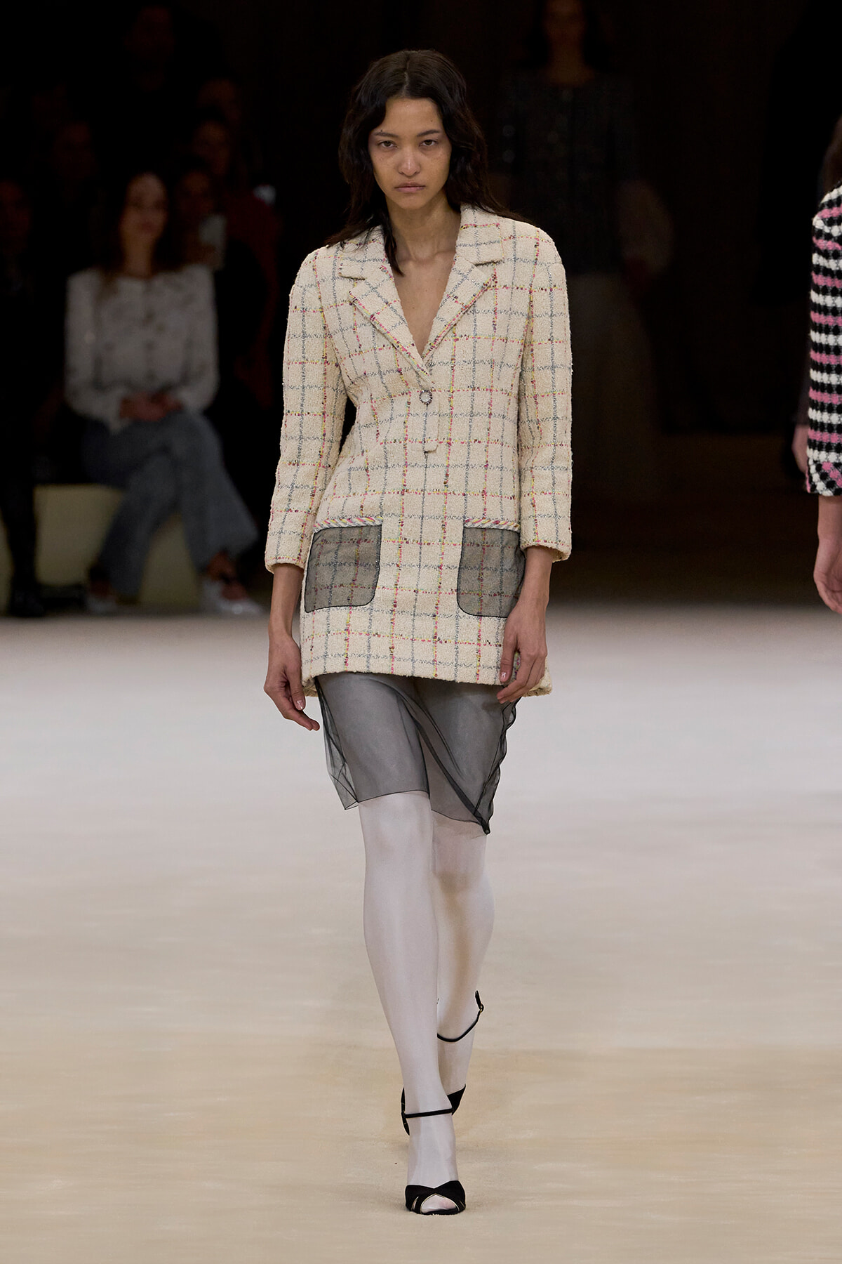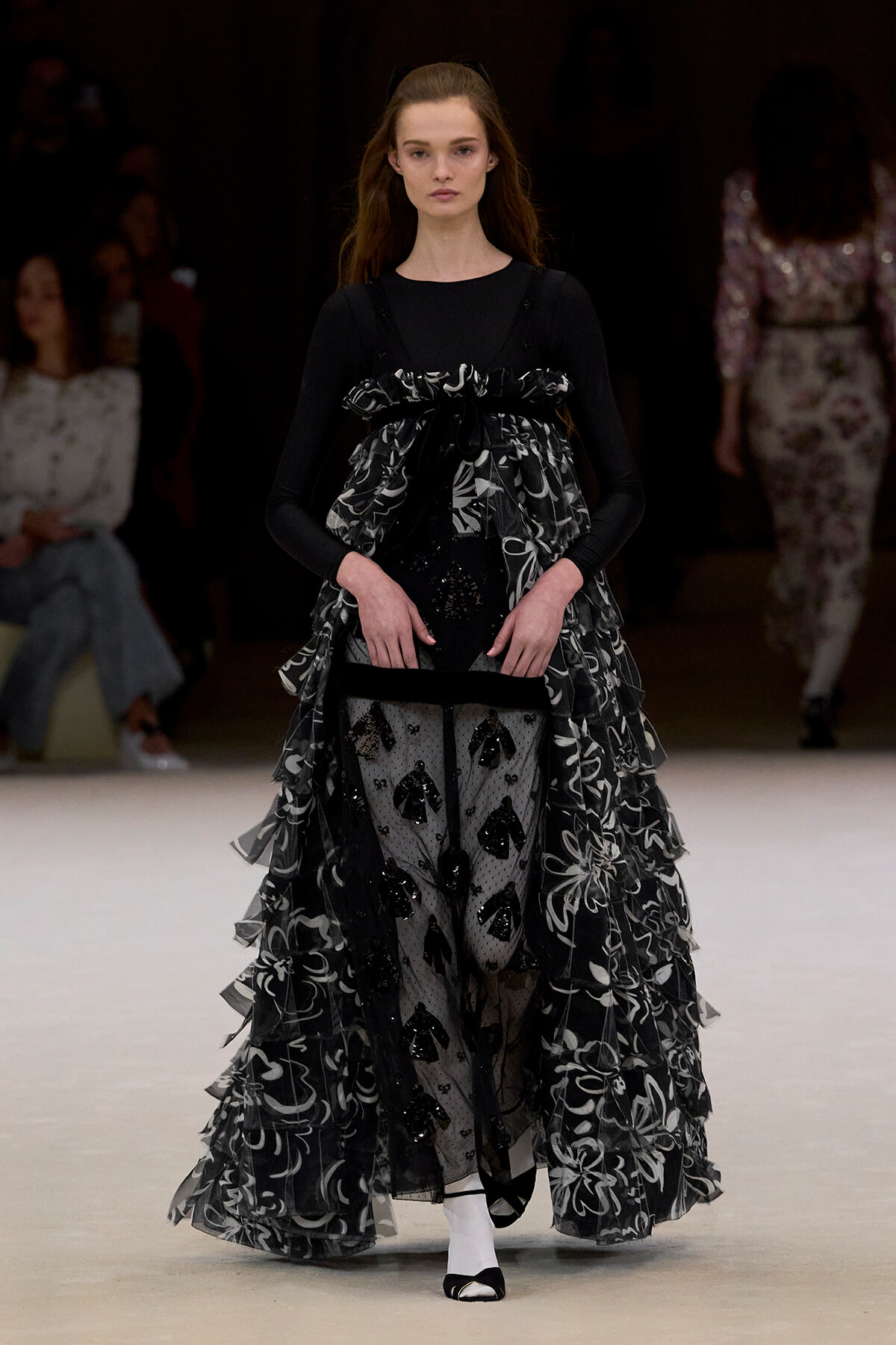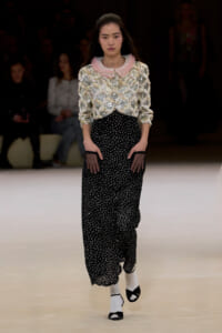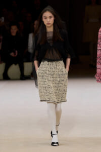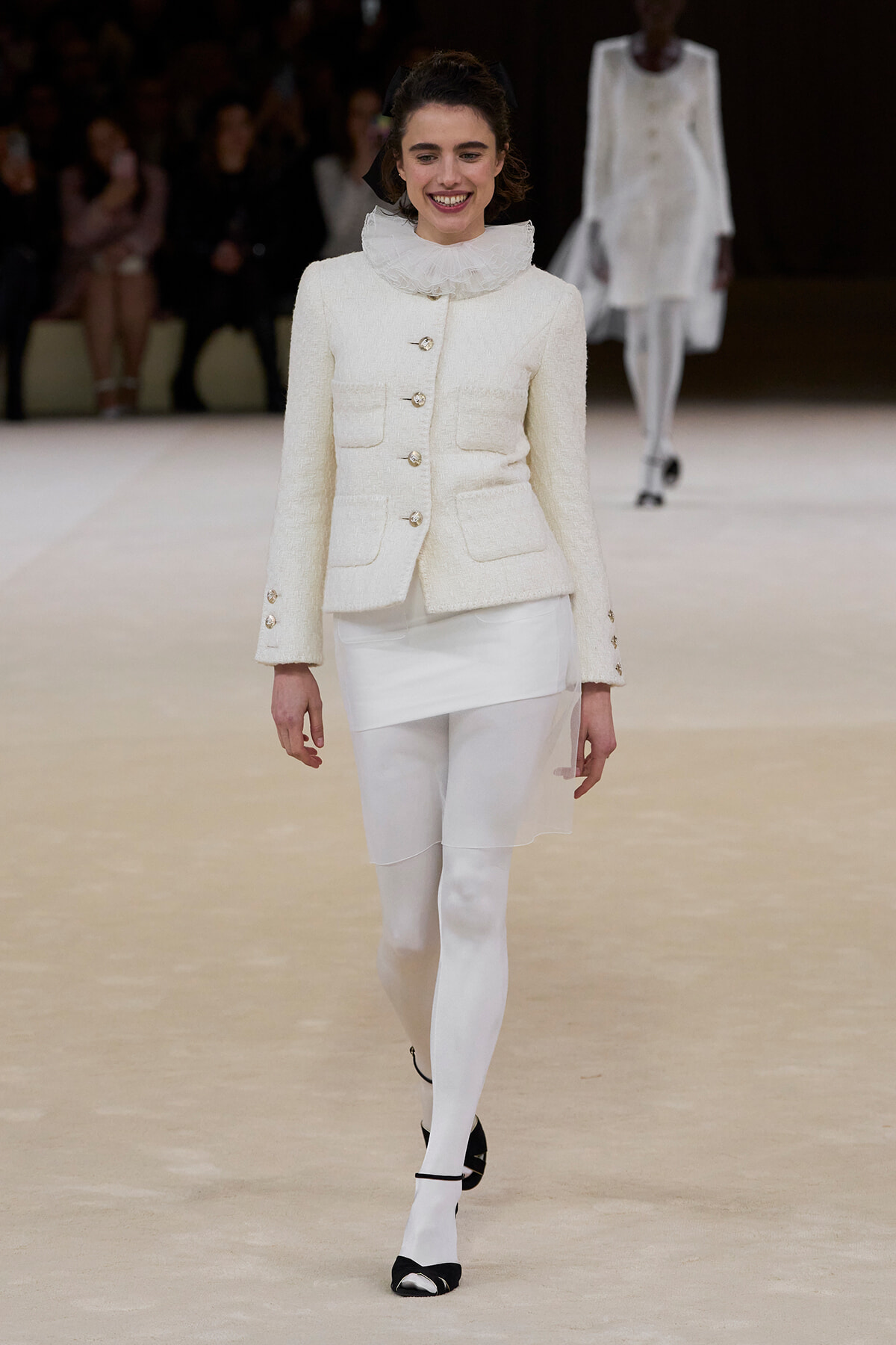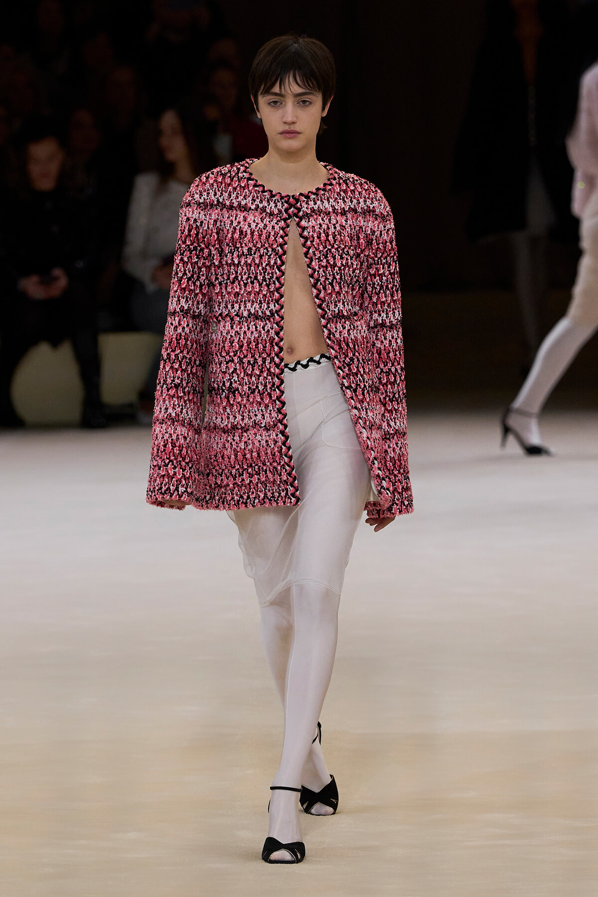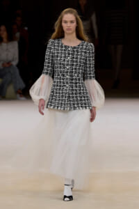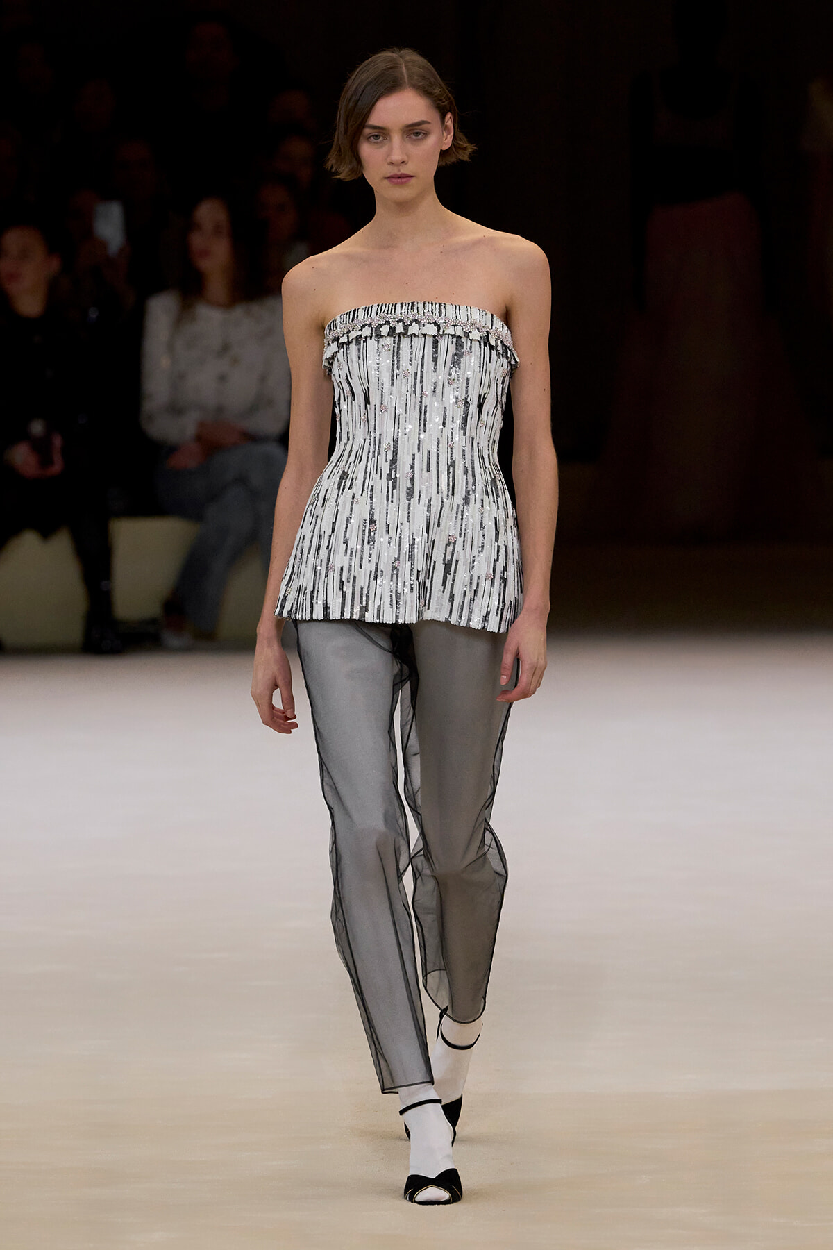 2024年は、ガブリエル・シャネルが初めてバレエ衣装をデザインしてから一世紀を迎え、メゾンとダンスの絆の強さを再認識する一年。ヴィルジニーは「ダンスはシャネルにとって重要ですし、このテーマについて思いを巡らせることもしばしばあります。メゾンは、ダンス業界や振付師、ダンサーたちと友好な関係を築いており、バレエ衣装も制作しています。私たちは身体と衣装が持つ力と優雅さを、チュールやフリル。プリーツ、レースで構成された、極めて軽やかなで優美なコレクションに集約させてみようと試みました」と話す。まるで水彩で描いたようなピンクやホワイトを基調にしたコレクションは、優雅で自由。そして女性たちのあらゆる動きに寄り添う精巧なクリエーションは、シャネルが誇る高いサヴォアフェールの力が遺憾無く発揮されている。