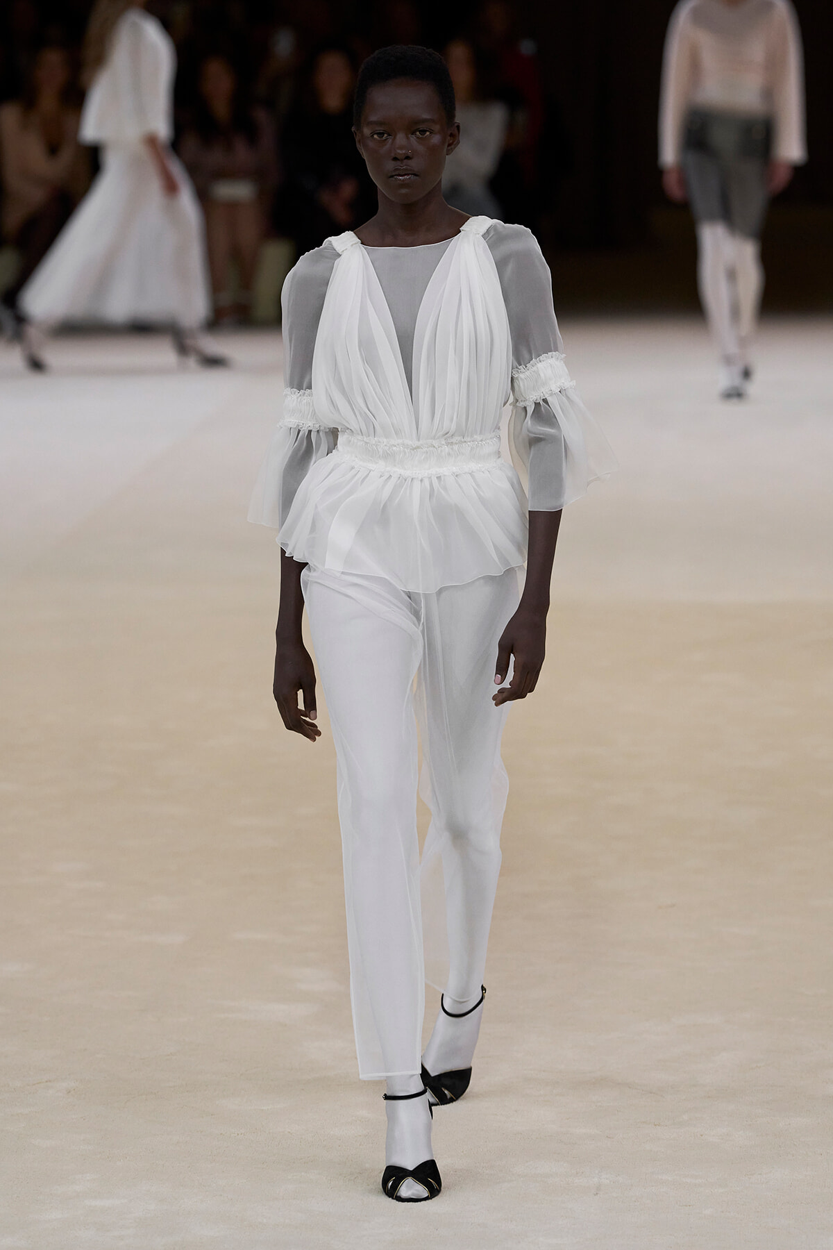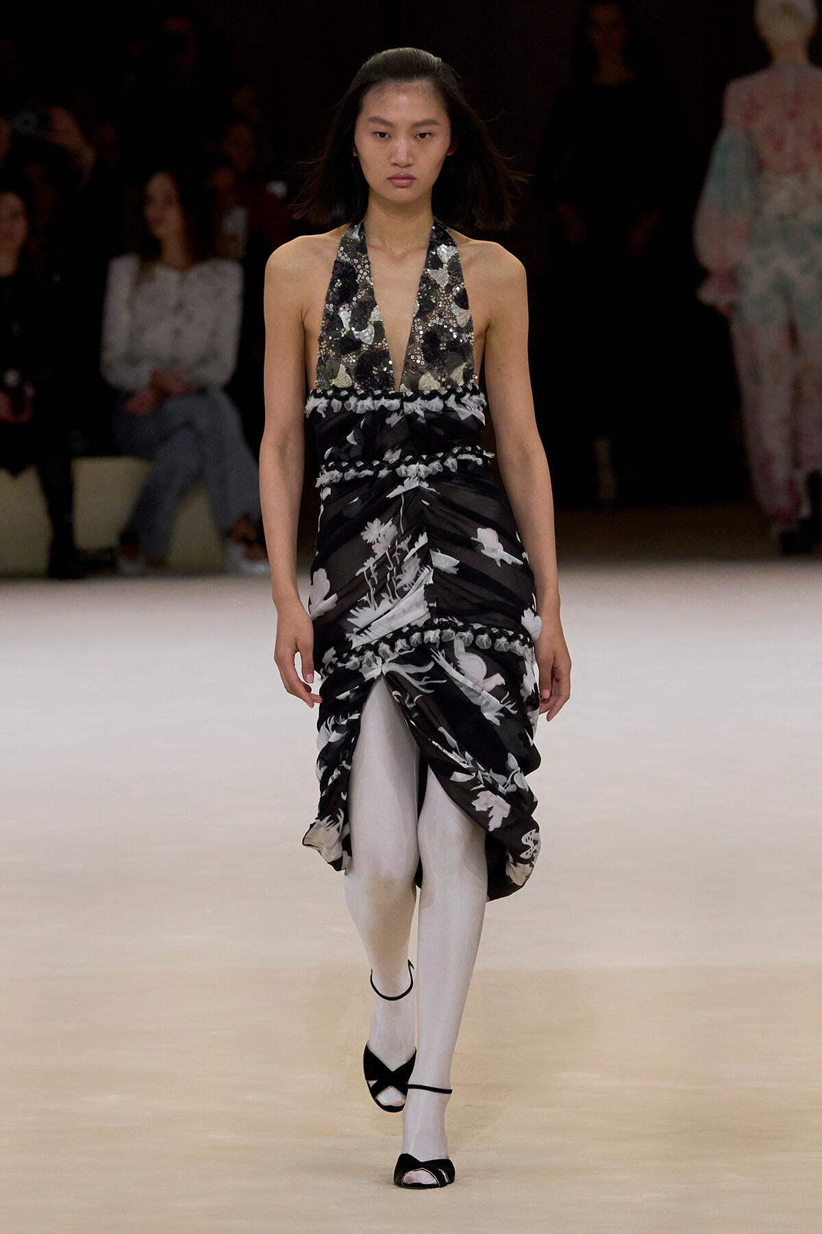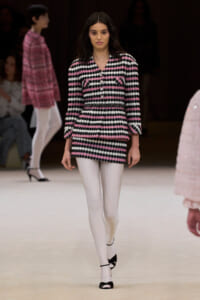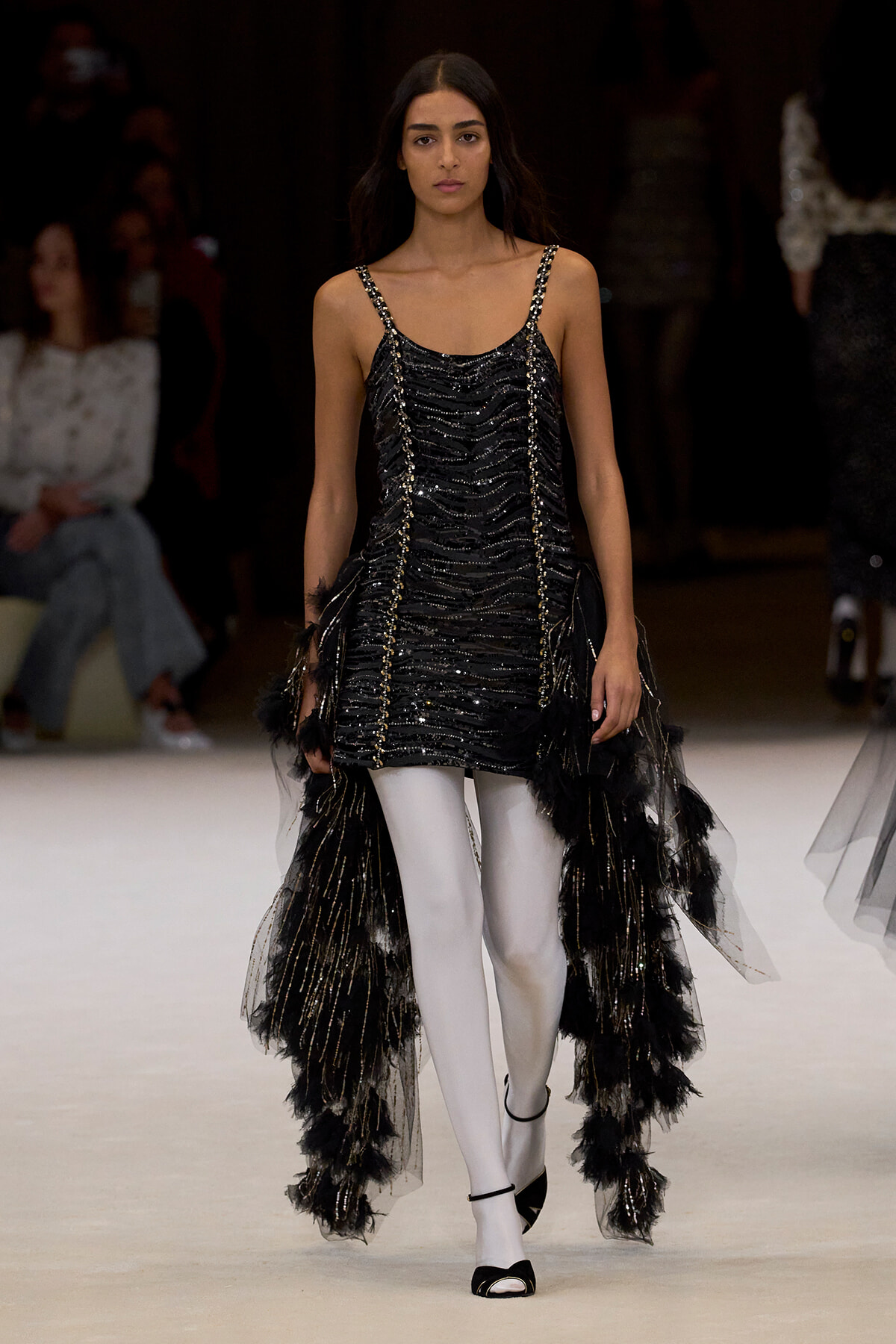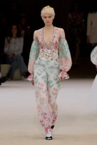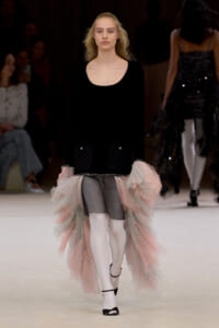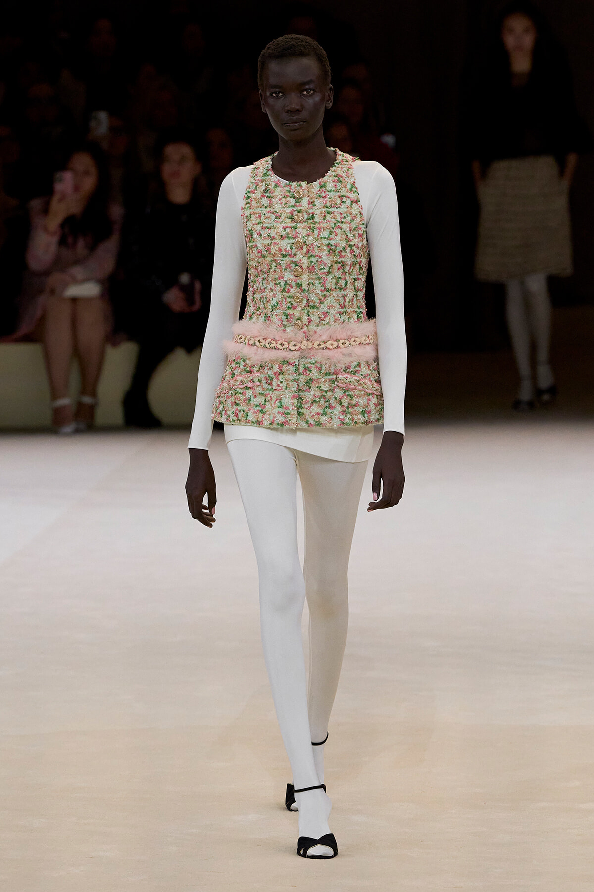 2024年は、ガブリエル・シャネルが初めてバレエ衣装をデザインしてから一世紀を迎え、メゾンとダンスの絆の強さを再認識する一年。ヴィルジニーは「ダンスはシャネルにとって重要ですし、このテーマについて思いを巡らせることもしばしばあります。メゾンは、ダンス業界や振付師、ダンサーたちと友好な関係を築いており、バレエ衣装も制作しています。私たちは身体と衣装が持つ力と優雅さを、チュールやフリル。プリーツ、レースで構成された、極めて軽やかなで優美なコレクションに集約させてみようと試みました」と話す。まるで水彩で描いたようなピンクやホワイトを基調にしたコレクションは、優雅で自由。そして女性たちのあらゆる動きに寄り添う精巧なクリエーションは、シャネルが誇る高いサヴォアフェールの力が遺憾無く発揮されている。