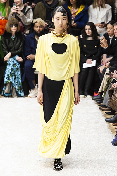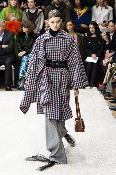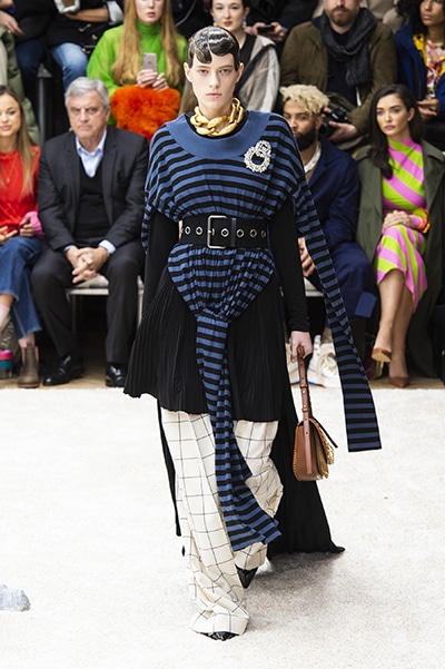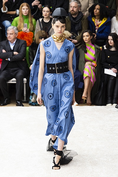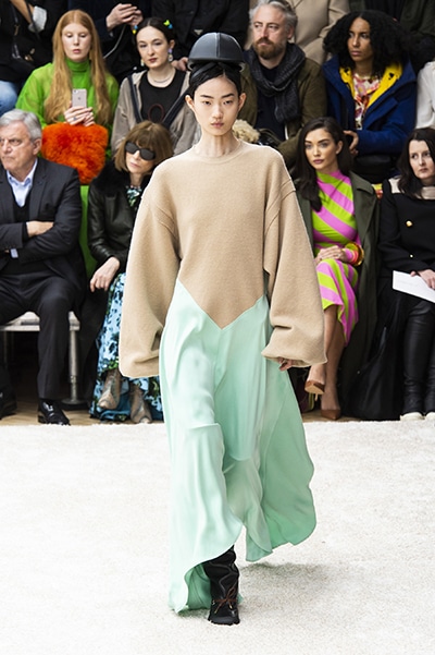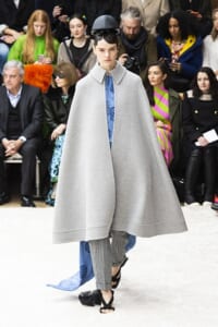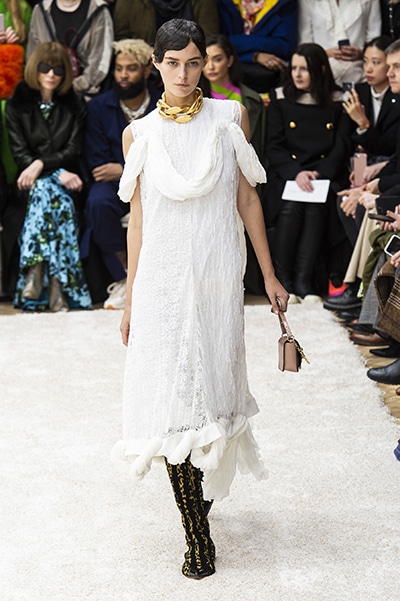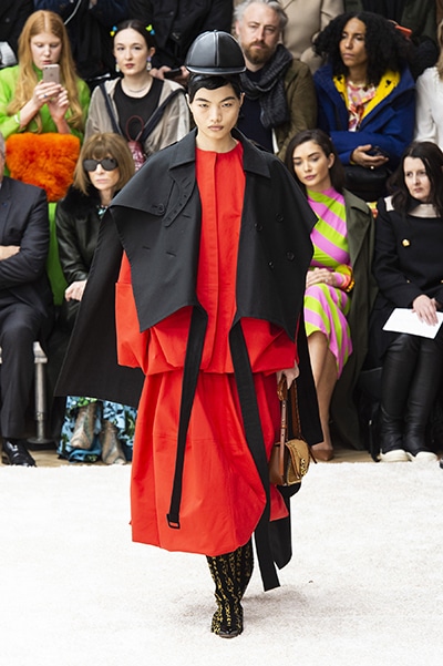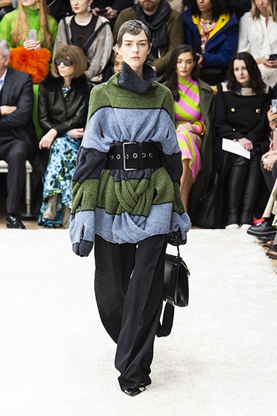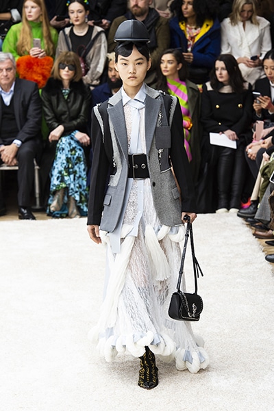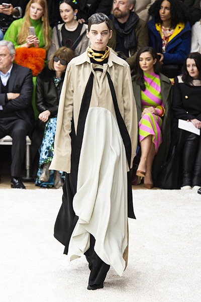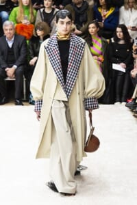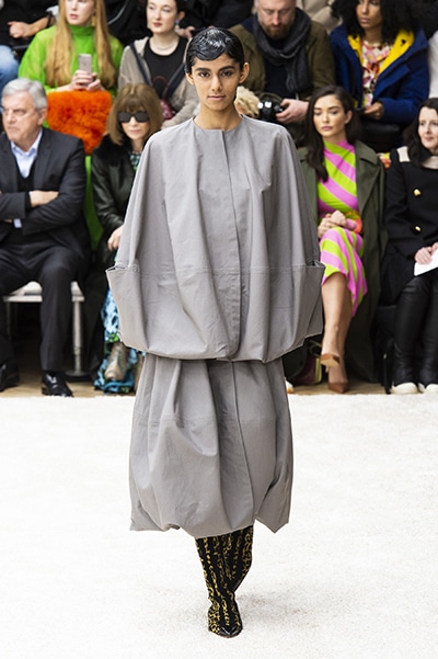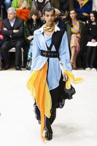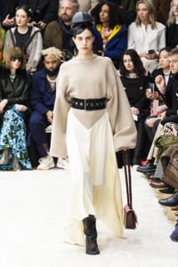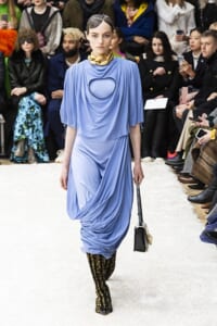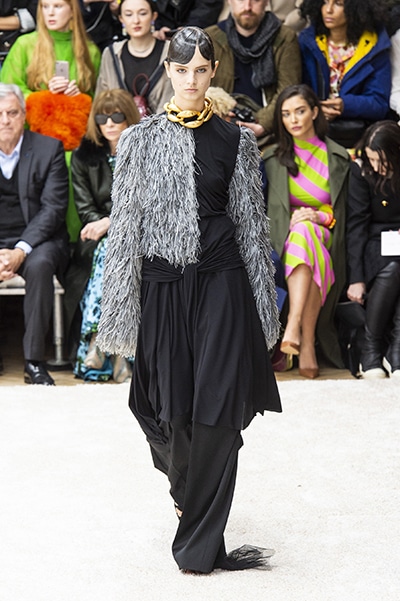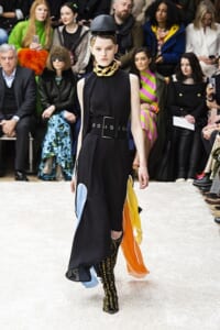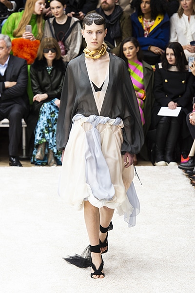 立体的なフォルム、太いベルトでのウエストマーク、極太のチェーンネックレス。シルエットプレイが目立った2019年秋冬のジェイ・ダブリュー・アンダーソン。チュールをアンクルに巻き付けたようなシューズや穴の間を揺れ動くストール状の布、コンセプチュアルなテイストとポップアートのような軽やかさが融合。