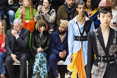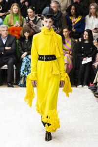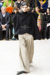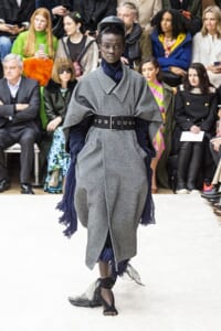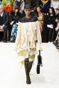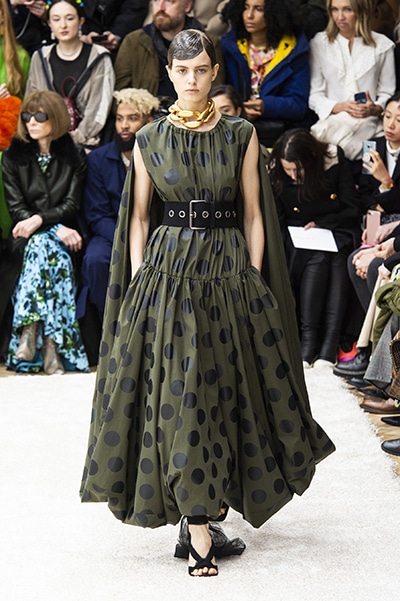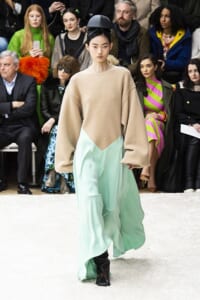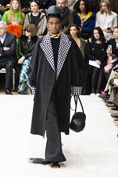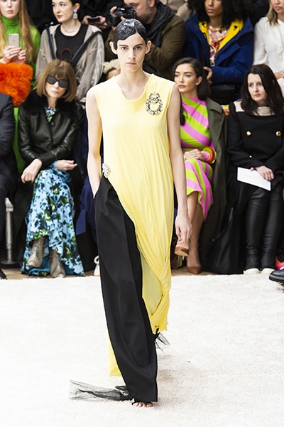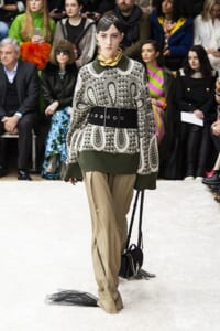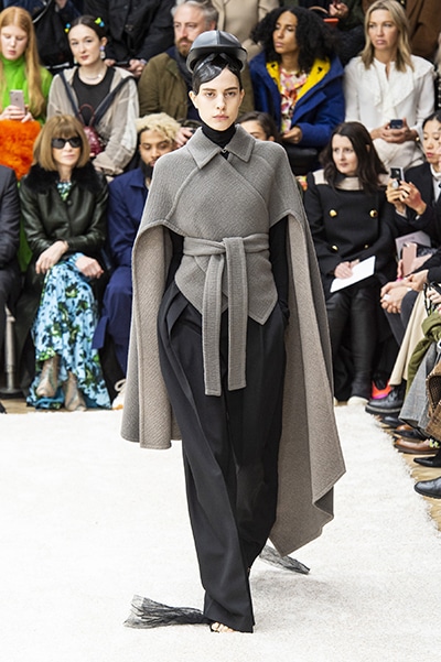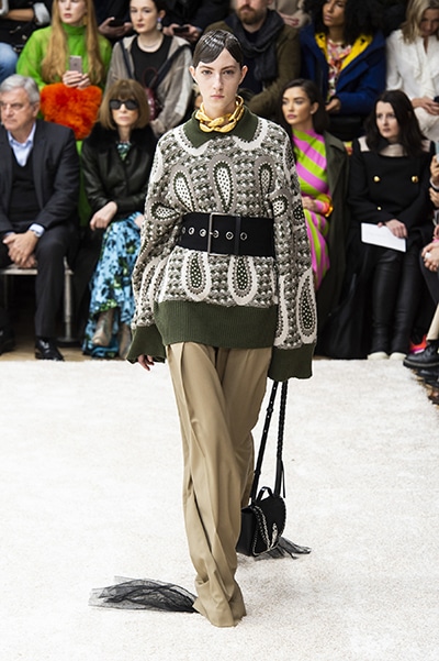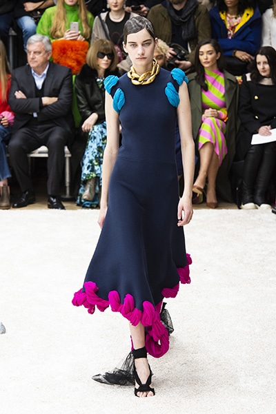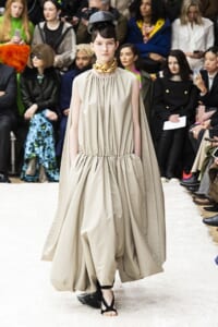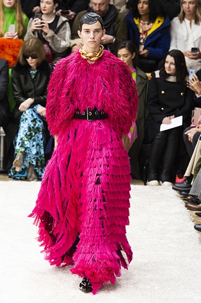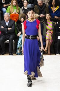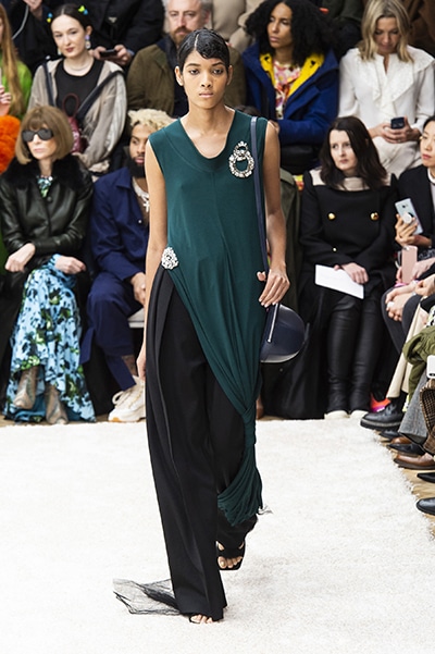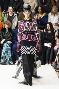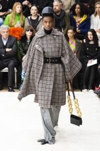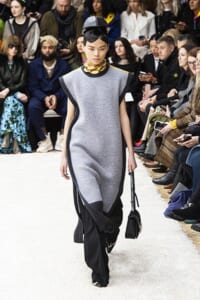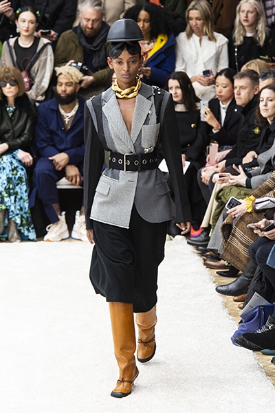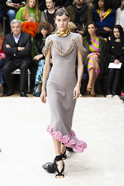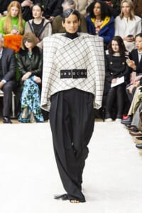 立体的なフォルム、太いベルトでのウエストマーク、極太のチェーンネックレス。シルエットプレイが目立った2019年秋冬のジェイ・ダブリュー・アンダーソン。チュールをアンクルに巻き付けたようなシューズや穴の間を揺れ動くストール状の布、コンセプチュアルなテイストとポップアートのような軽やかさが融合。