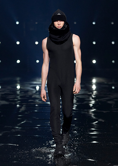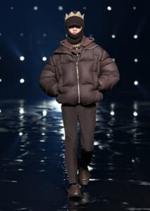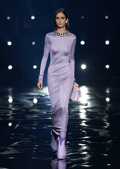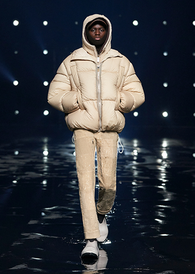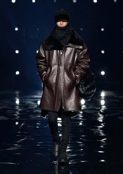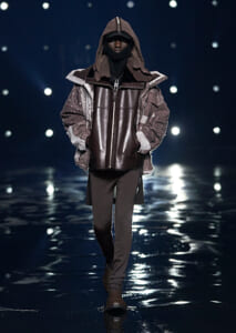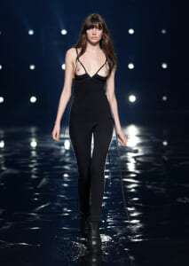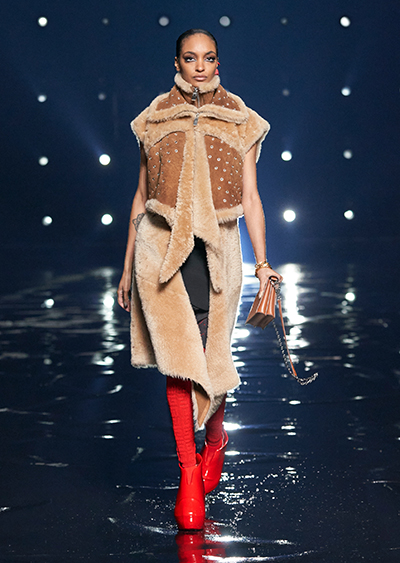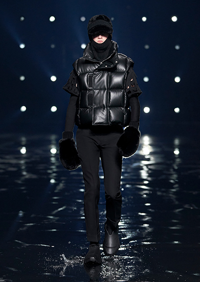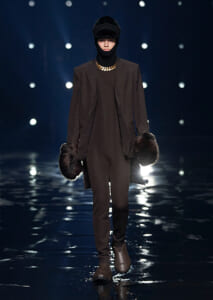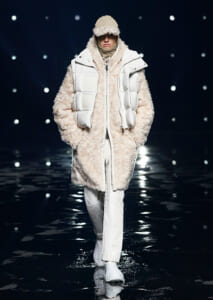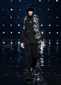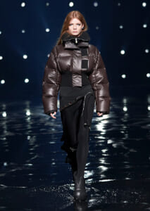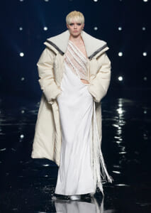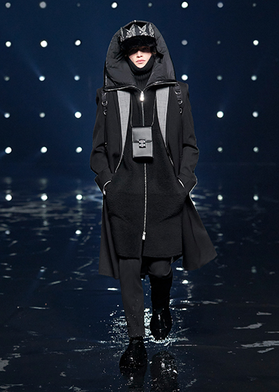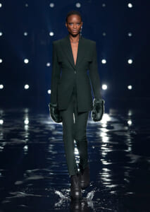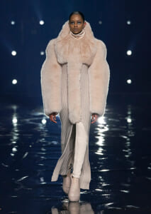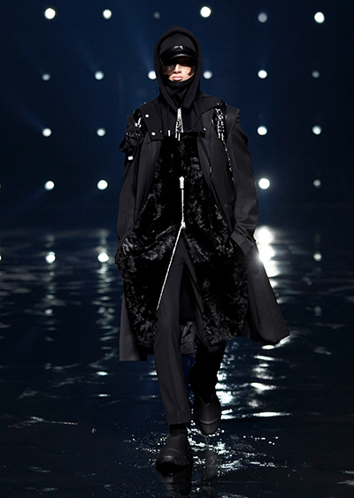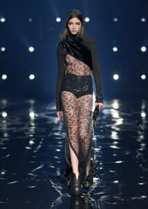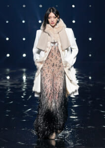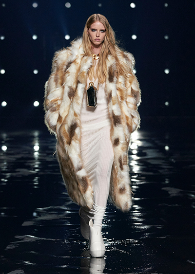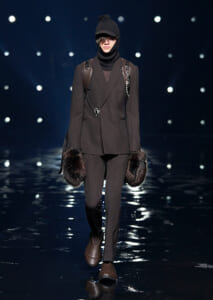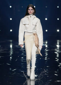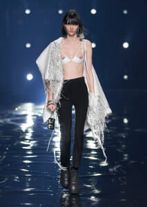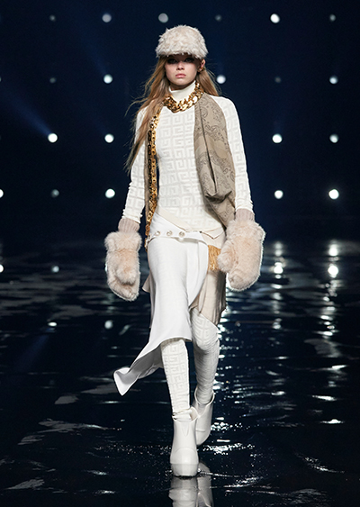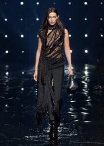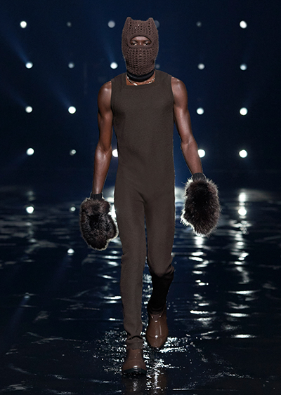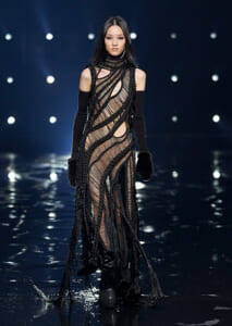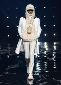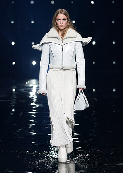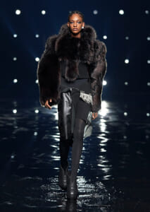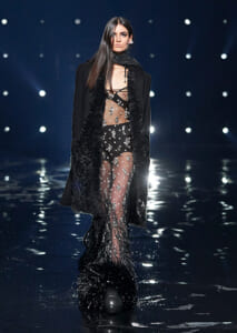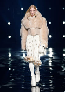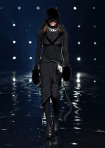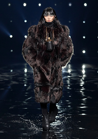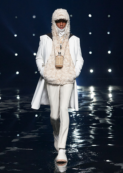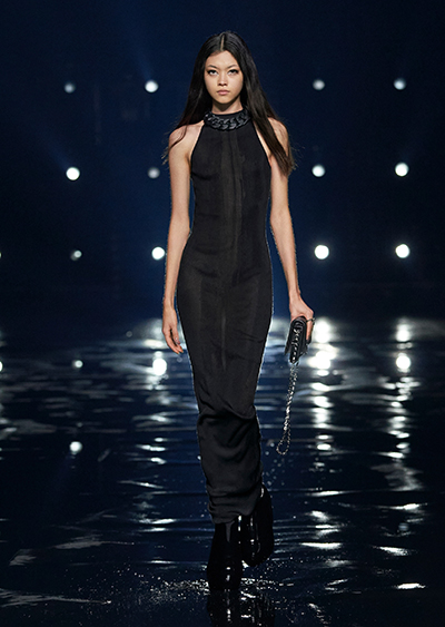 視線を虜にしたのは「マシュマロ」ソールと名付けられたシューズ。ネーミング通り、丸みを帯びたオブジェのような一足で、今季のジバンシィのシルエットを作るキーアイテム。また、身を守る防具のようなファーグローブや、首から下げたチェーン使いのボトルケースなど、キャッチーなアクセサリーの宝庫。ショーの音楽は、ミュージシャンのロバート・フッドが‟オーガナイズされたカオス”という言葉に着想を得て製作。水しぶきを上げてモデルが歩く演出とテクノミュージックがコレクションをグラマラスに演出した。