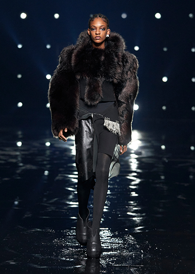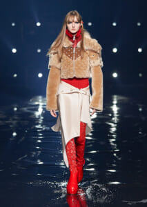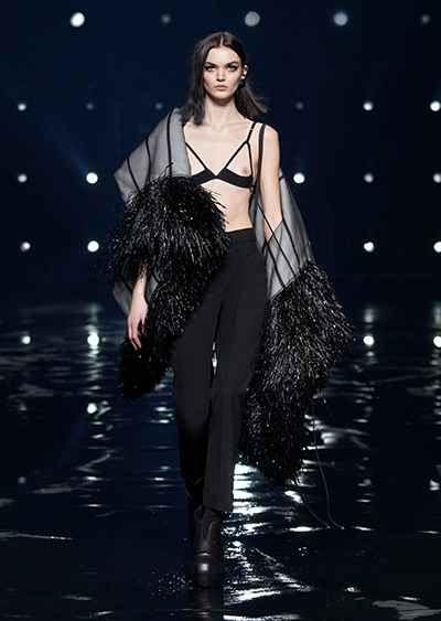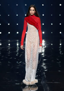 無数のライトに照らされた会場で発表されたのは、黒や赤、ベージュなどで彩られた、緊張感のあるシルエット。ジバンシィのアトリエの技術に裏打ちされた、構築的なテーラードジャケットには、流れるようなシースルー素材をレイヤード。ニットとファーの異素材コートには、繊細なビジューとオーストリッチの羽を飾ったドレスを合わせて、素材のコントラストを際立てる。シアリング(刈り込んだ羊毛)やフェイクファーを使い、袖やネックラインにボリュームを出したアウターは、ロング&リーンなドレスを合わせて、シルエットを大胆に遊んだ。