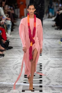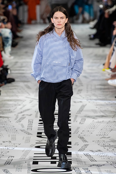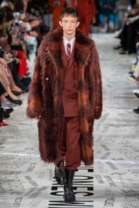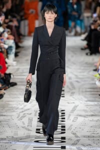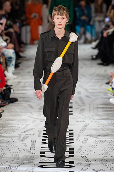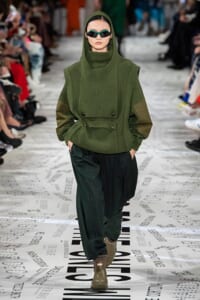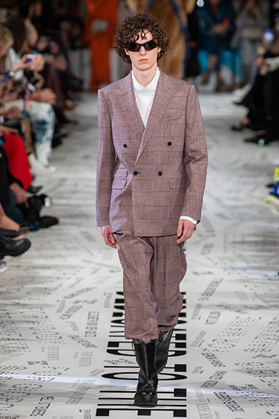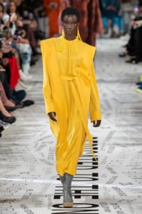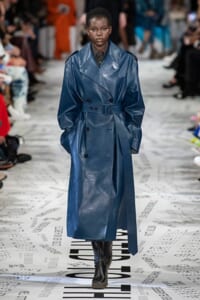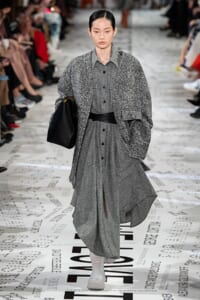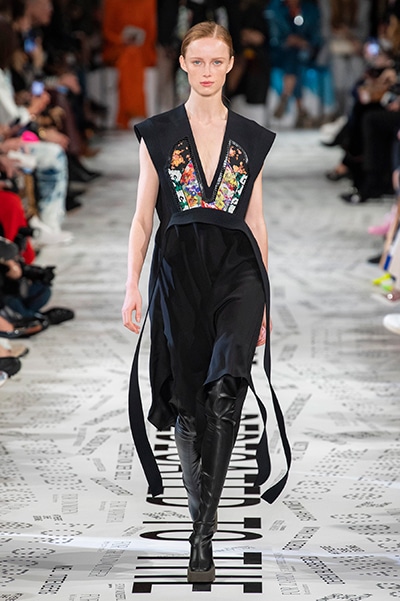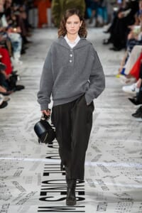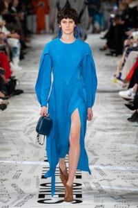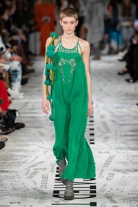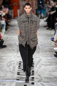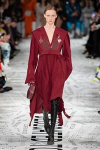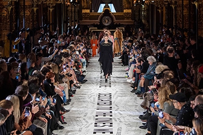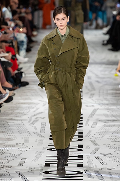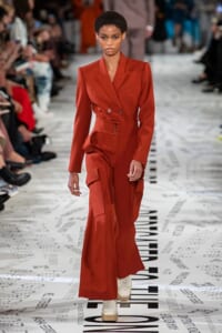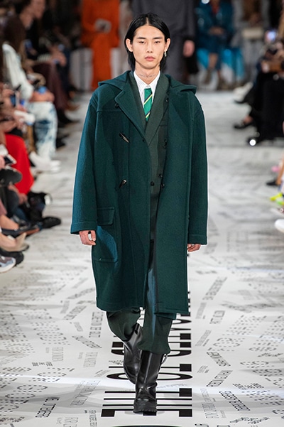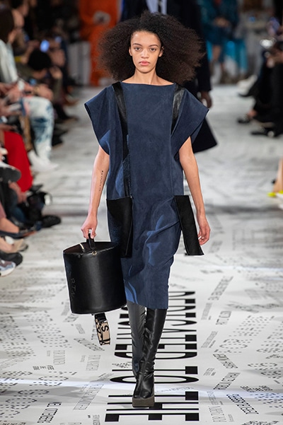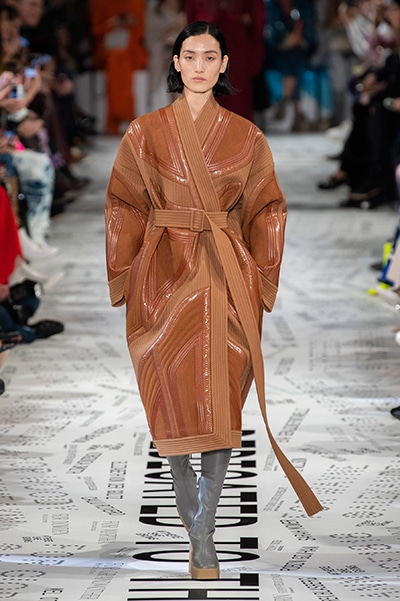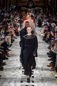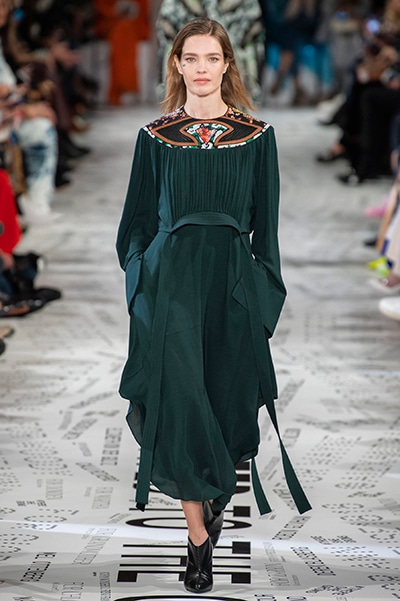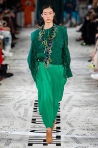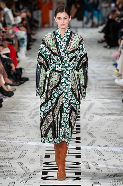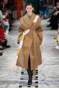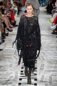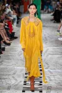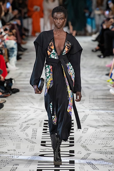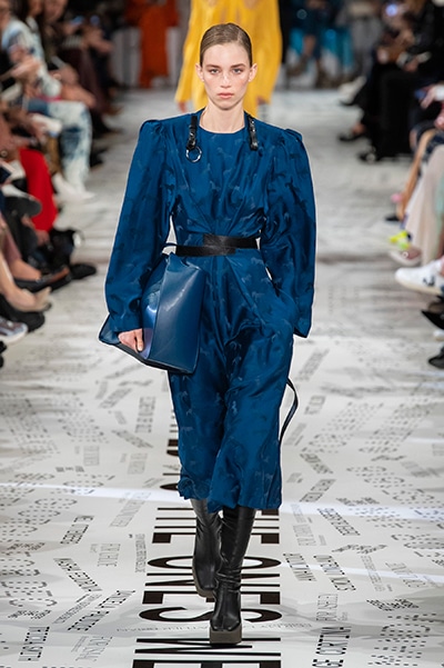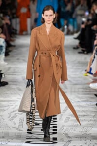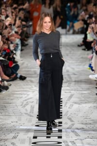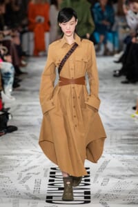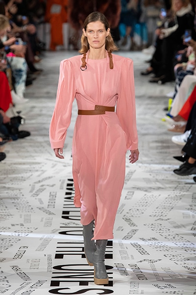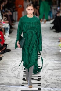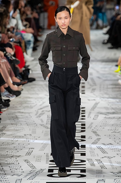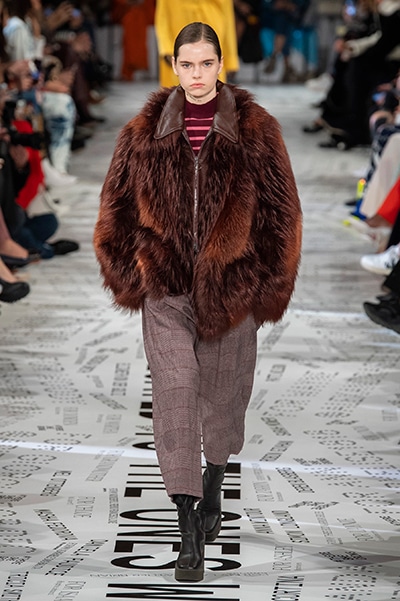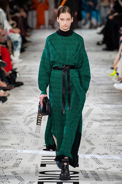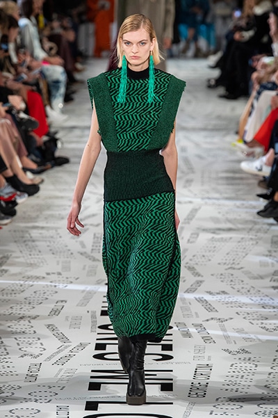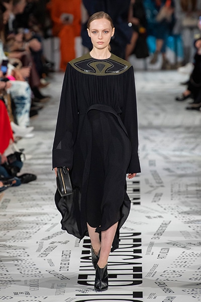 1960年代後半から70年代にかけてイギリスで流行ったクラブカルチャー「ノーザン・ソウル」からインスパイアされたという、2019年秋冬のステラ マッカートニー。ランウェイには、絶滅危機にあるインドネシア・スマトラ島の森林保護区を救うためのキャンペーン「#ThereSheGrows」にまつわるメッセージで覆われた。コレクションはトライバルな力強さとソフトなタッチが軽やかにミックス。ビスケットブラウン、ボトルグリーン、バーガンディ、イエローなどのカラーパレットに彩られた、ワイドレッグパンツやビッグショルダーのテーラリングの冴えるコートやドレス、クリーンなのに心地いいルックが揃う。全体を通して、オーガニックコットンはもちろんエコキャンバスやサステナブルビスコースが用いられている。またナチュラルラバーを使用したハンターとのコラボレーションにより誕生したサステナブルなブーツにも注目だ。