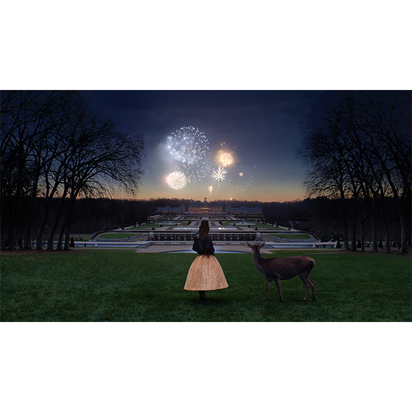 フィナーレは、ベースボールキャップを被りクリノリンで着飾った少女が、遠くの夜空に打ちあがった花火を見て涙する。フェアリーテール(おとぎ話)を表現したというコレクションは、現実を忘れる、服のファンタジーに満ちている。