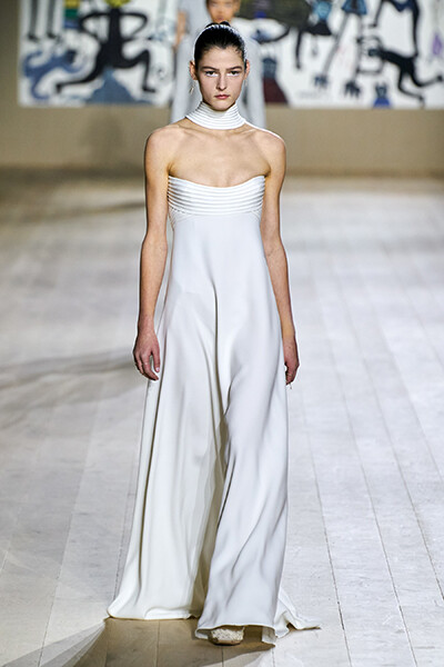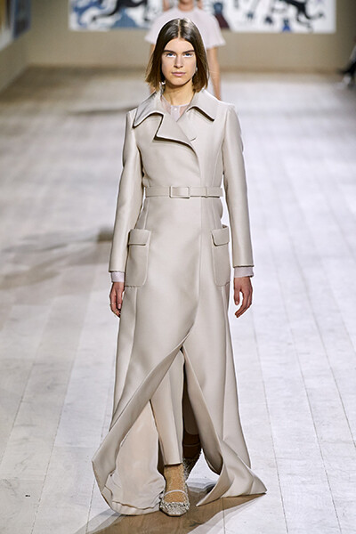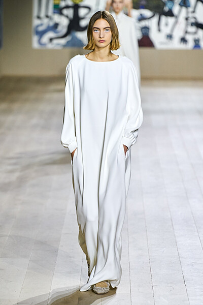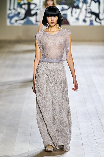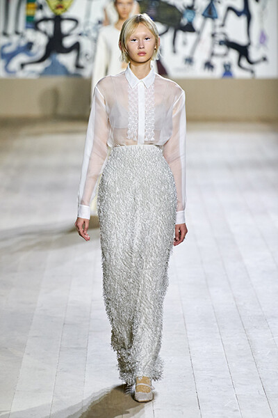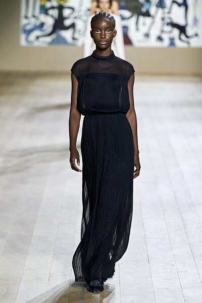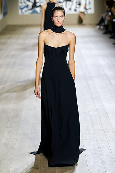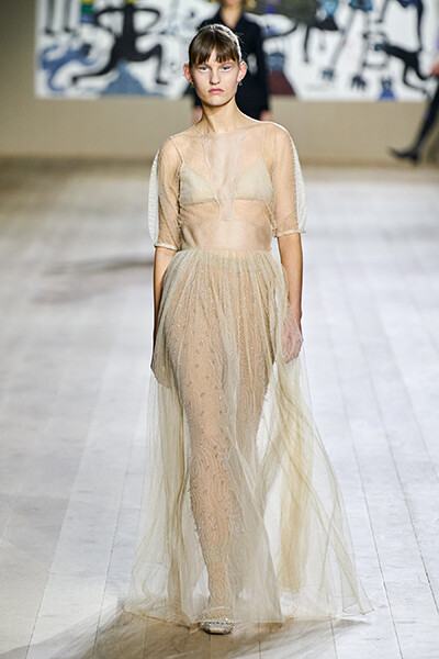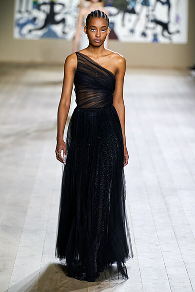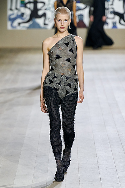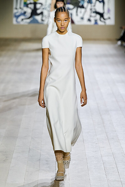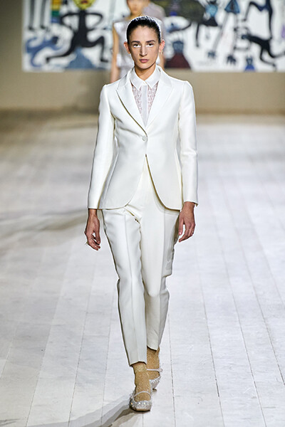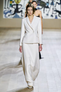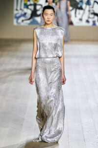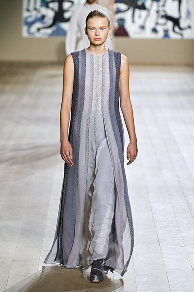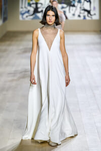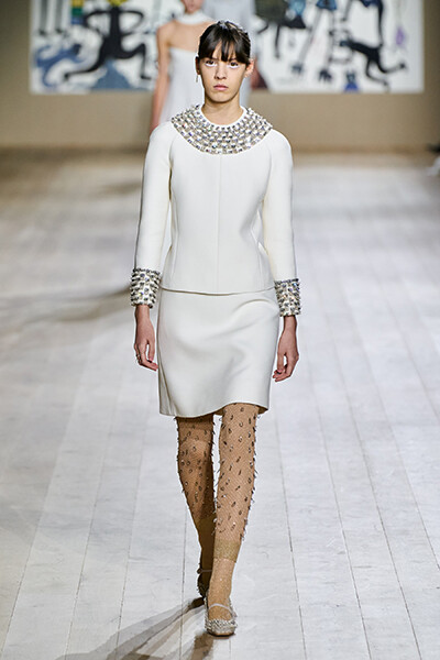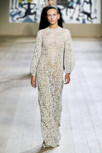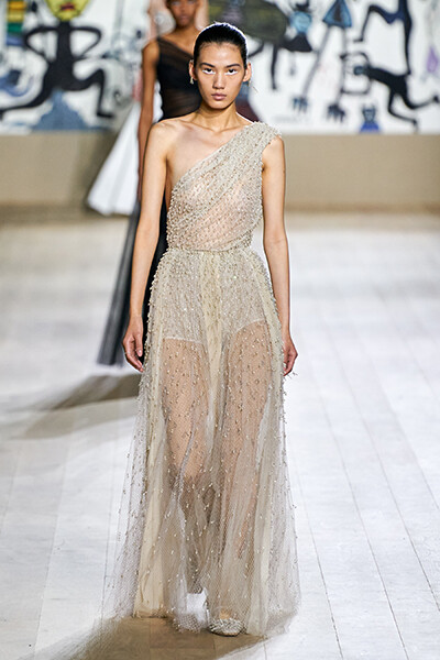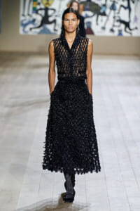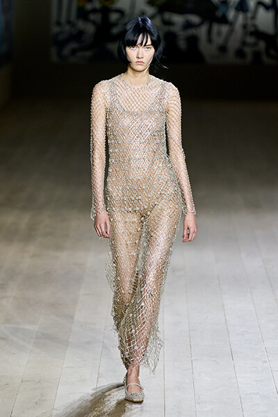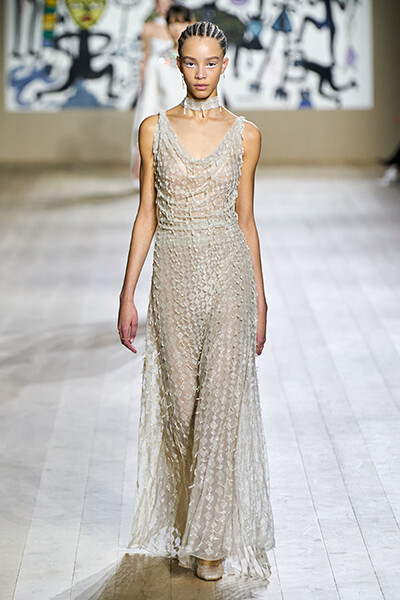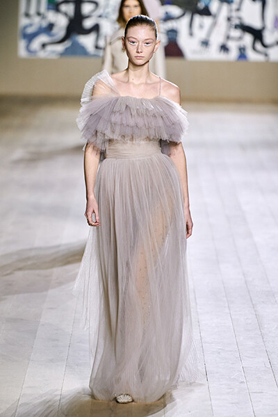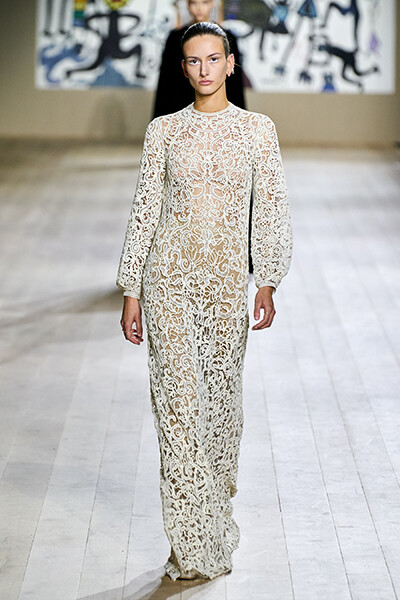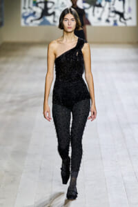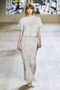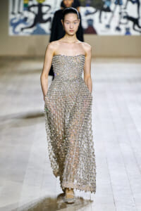 今シーズンのオートクチュールで、マリア・グラツィア・キウリは、アトリエのサヴォワールフェールの代表、刺繍への想いを表現した。色とりどりの刺繍に囲まれた会場に登場したのは、反対に、黒、白、グレージュ、シルバーをまとったモデルたちだった。クリスタルチューブやリボン、ビーズなど、様々なテクニックの刺繍が布地と同色で施され、ドレープやトレーン、デコルテと響き合う、エレガントなコレクションだ。ディテールや装飾の域を超え、布の動きを司り、テクスチャーとなり、フォルムの一部となる刺繍。足元のタイツやシューズにもビーズ刺繍があしらわれ、主役級の存在となった。