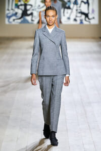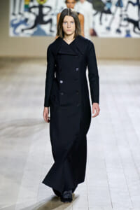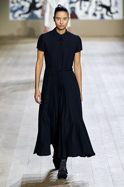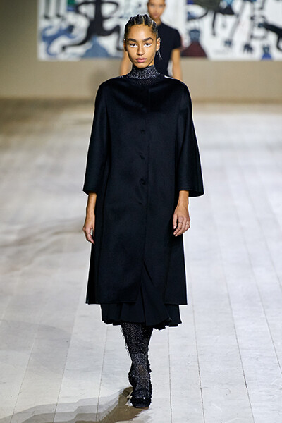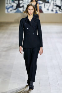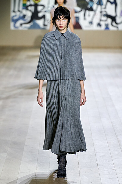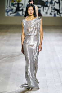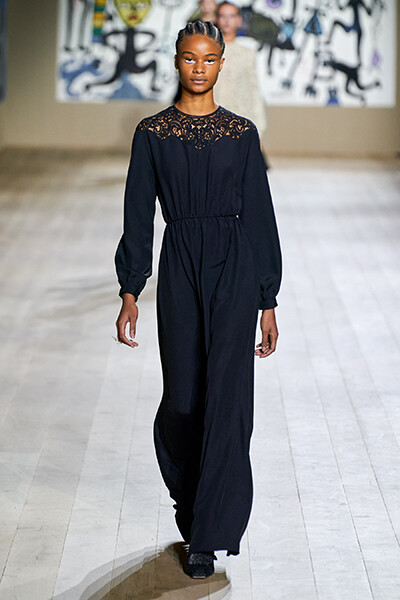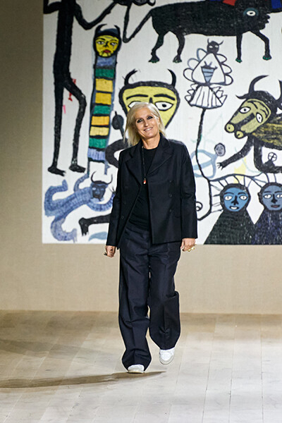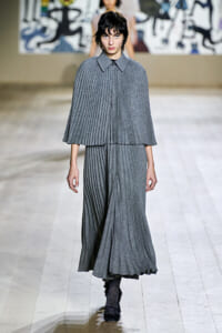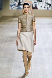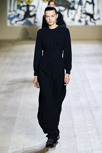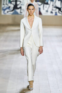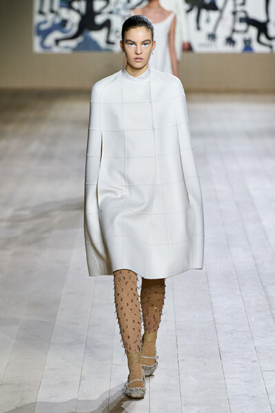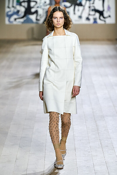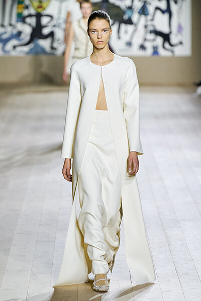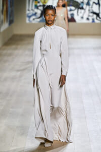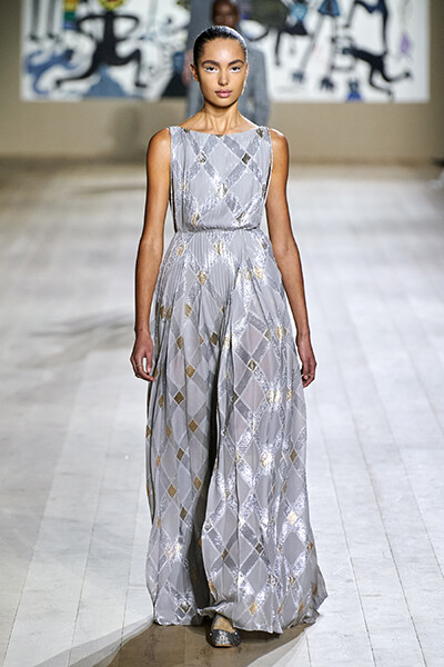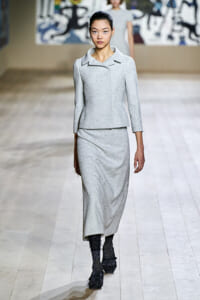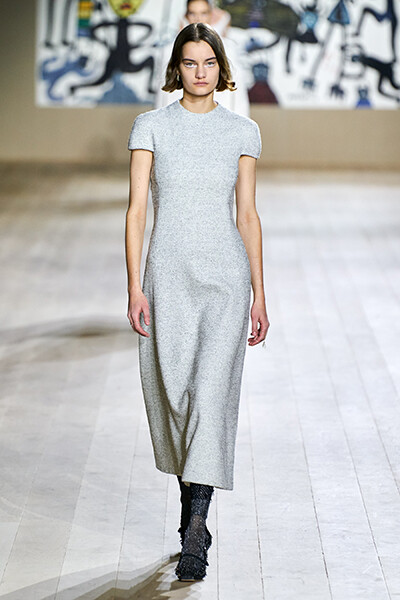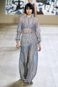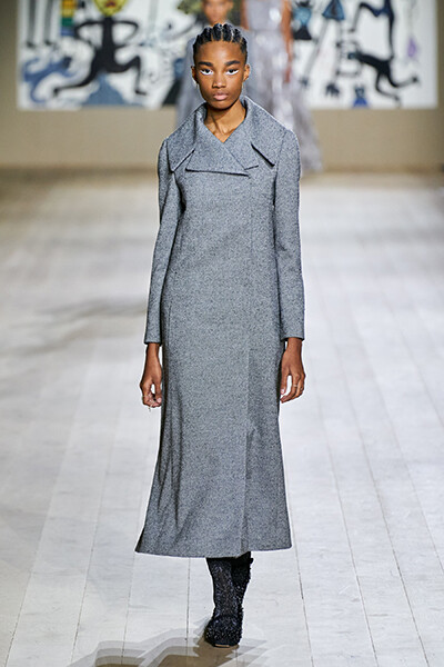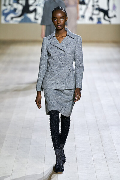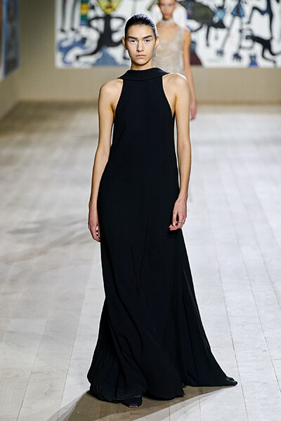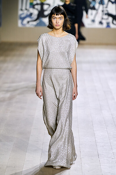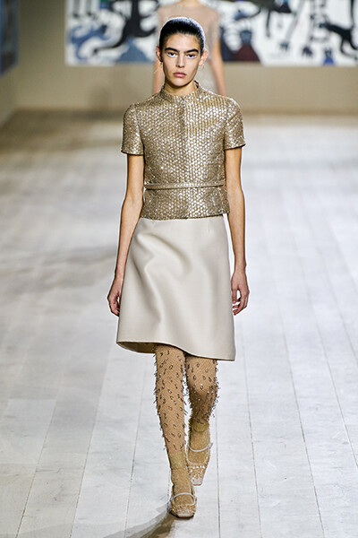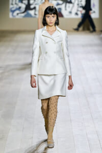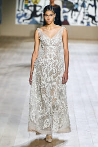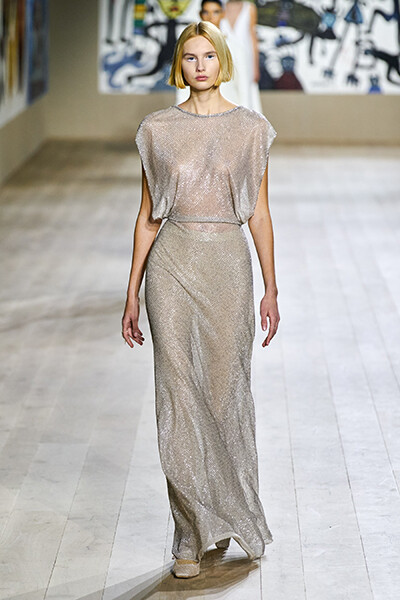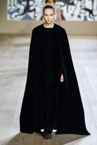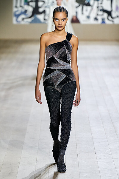今シーズンのオートクチュールで、マリア・グラツィア・キウリは、アトリエのサヴォワールフェールの代表、刺繍への想いを表現した。色とりどりの刺繍に囲まれた会場に登場したのは、反対に、黒、白、グレージュ、シルバーをまとったモデルたちだった。クリスタルチューブやリボン、ビーズなど、様々なテクニックの刺繍が布地と同色で施され、ドレープやトレーン、デコルテと響き合う、エレガントなコレクションだ。ディテールや装飾の域を超え、布の動きを司り、テクスチャーとなり、フォルムの一部となる刺繍。足元のタイツやシューズにもビーズ刺繍があしらわれ、主役級の存在となった。