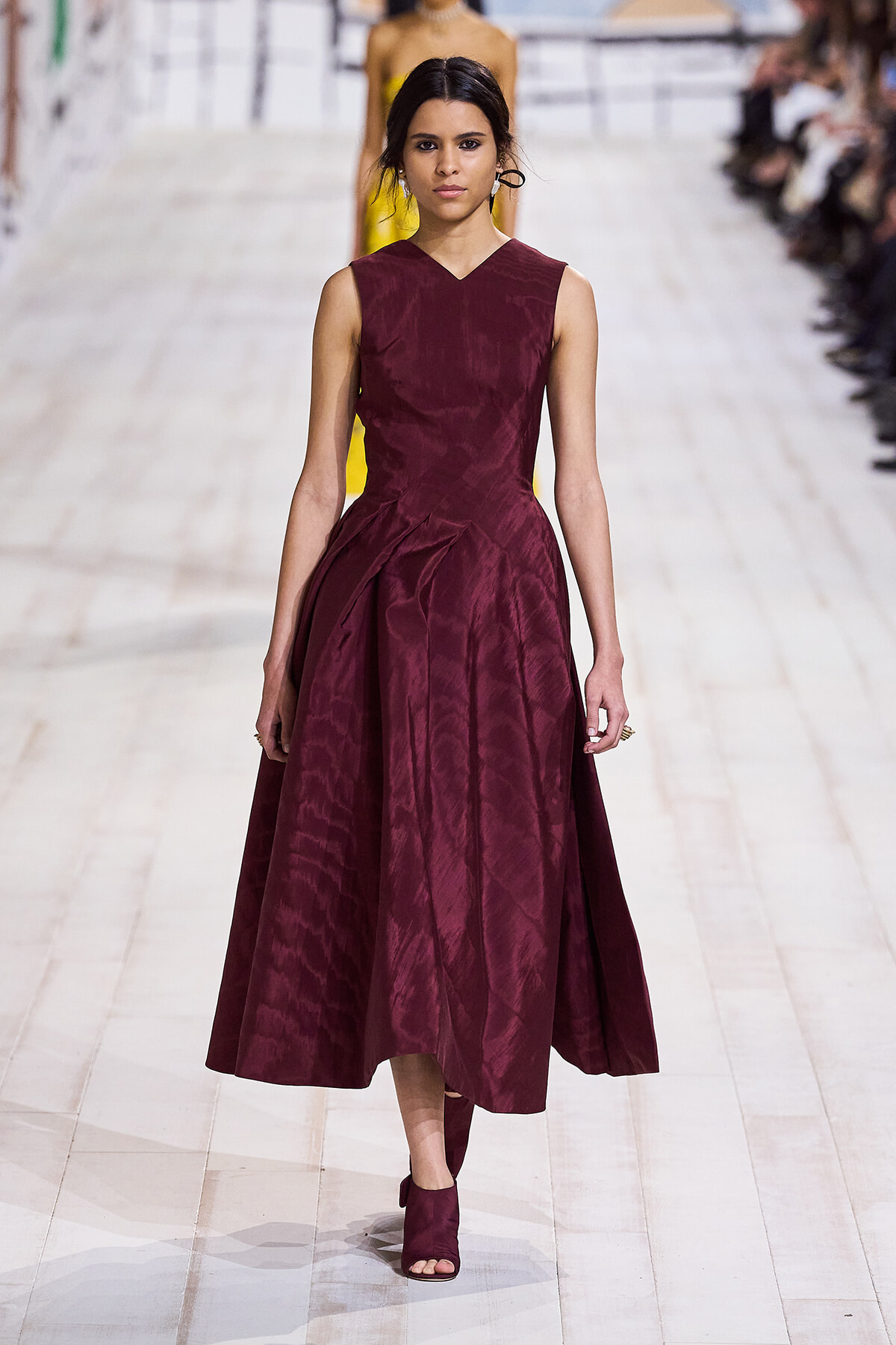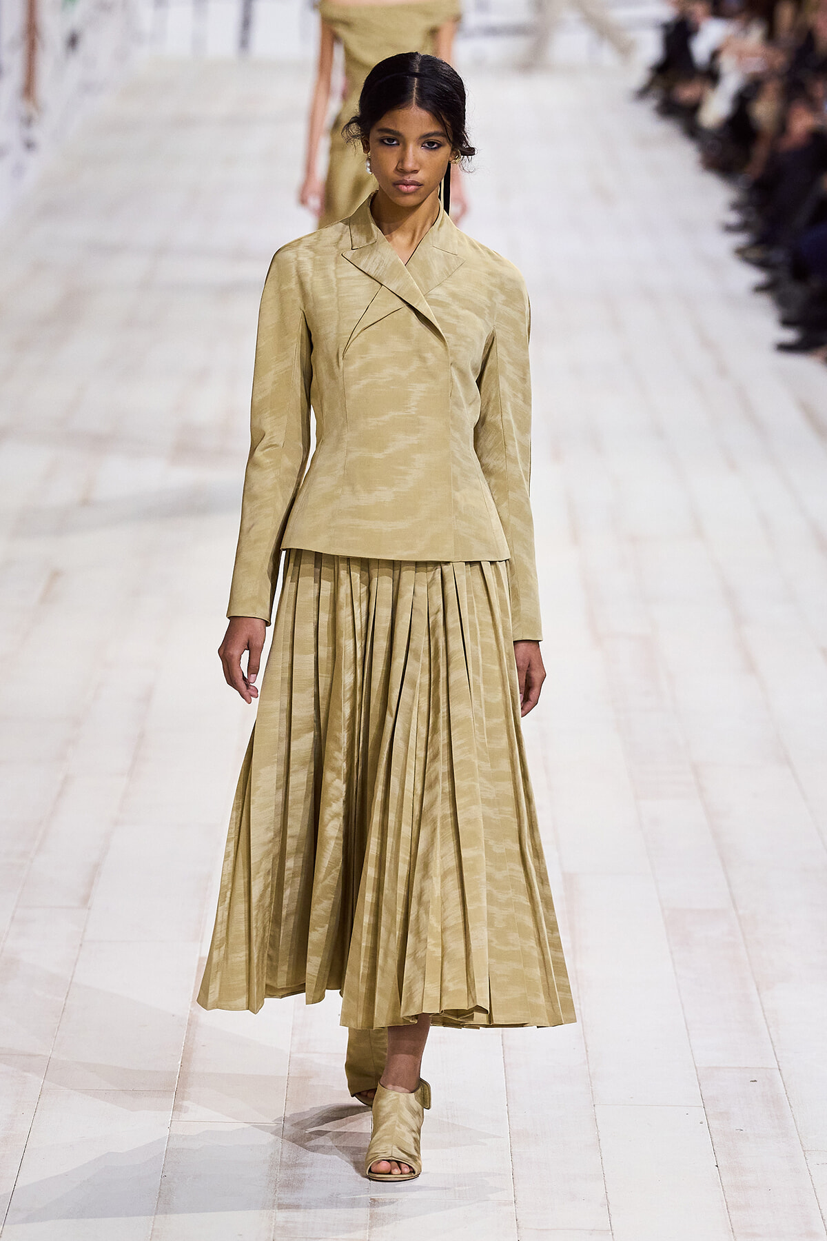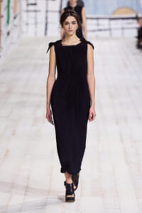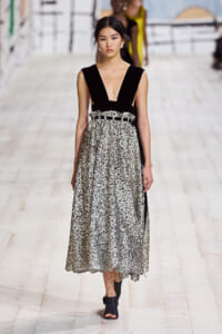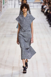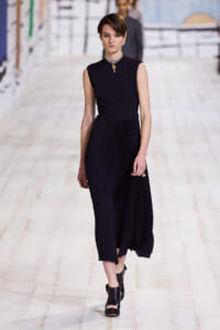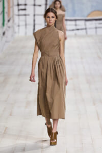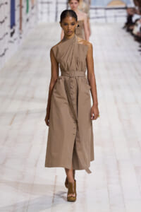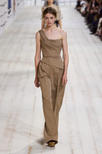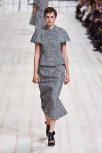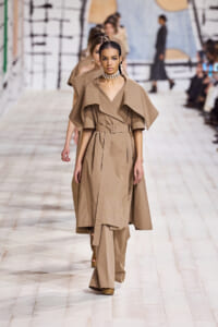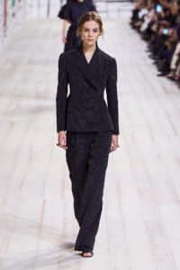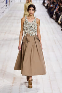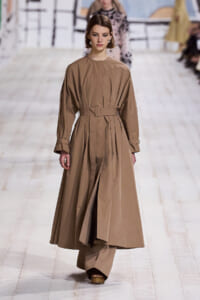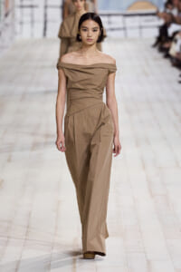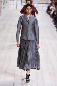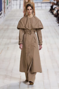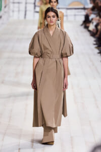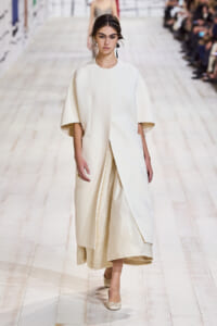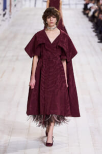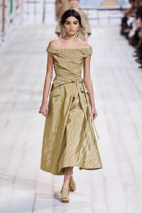 今回のコレクションで、マリア・グラウィア=キウリは、オートクチュールの持つオーラに視線を向けた。インスピレーション源となったのは、ムッシュー・ディオールが1952年秋冬のコレクションでデザインした「ラ シガール」ドレス。モワレ生地がカッティングの立体的な美しさを際立たせたこのアーカイブのドレスは、彼女の手によりコンテンポラリーなシルエットに蘇る。肩を丸く包み込むショールのような襟や、胸元が折り紙のように畳まれたバージャケット、腰回りを誇張したワイドなスカートなどを、ベージュや黒、モスグリーン、チェリーレッドのアーティザナルなモワレ生地で提案。ムッシュ―・ディオールも好んだこの素材が、1点1点のシルエットを際立たせた。