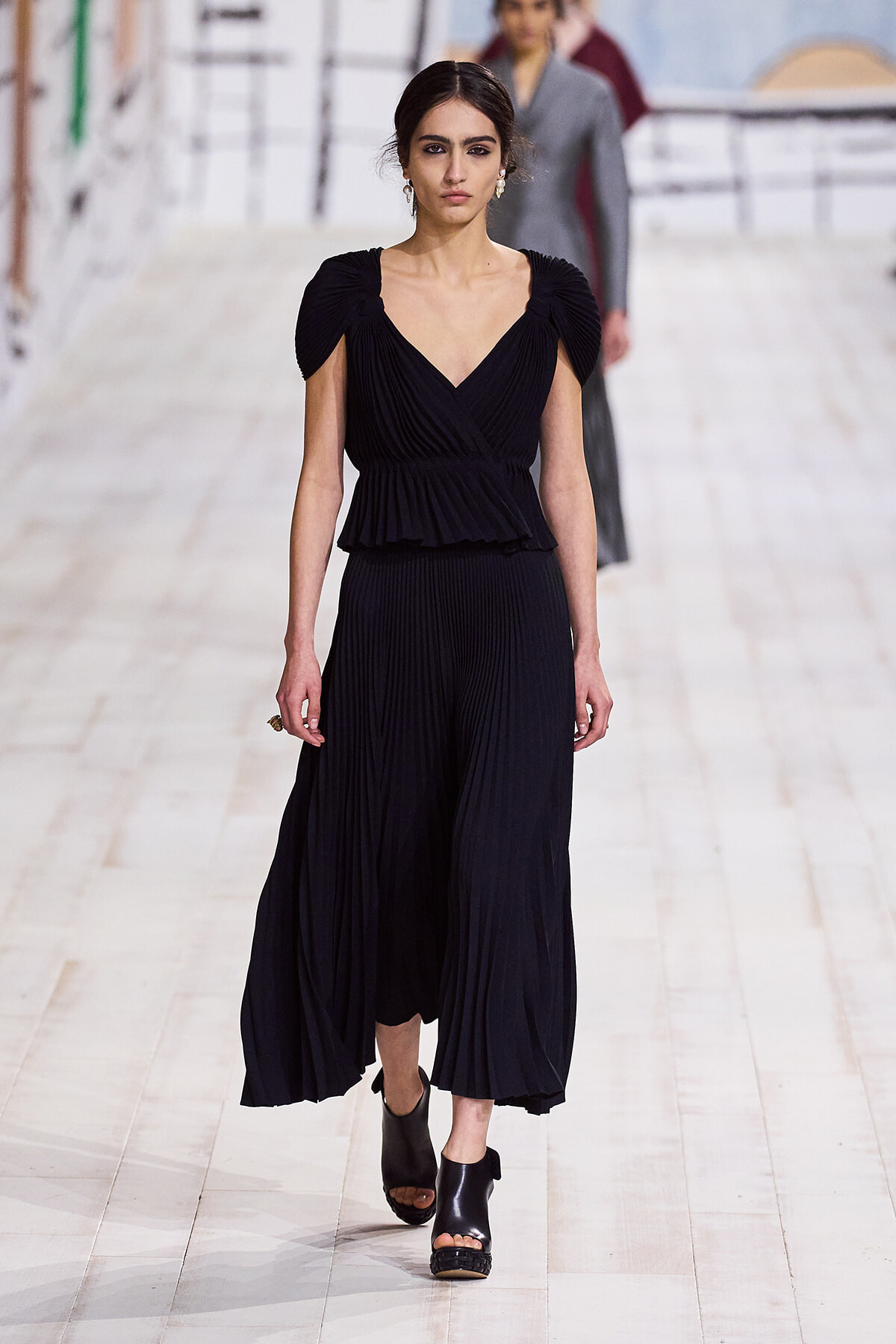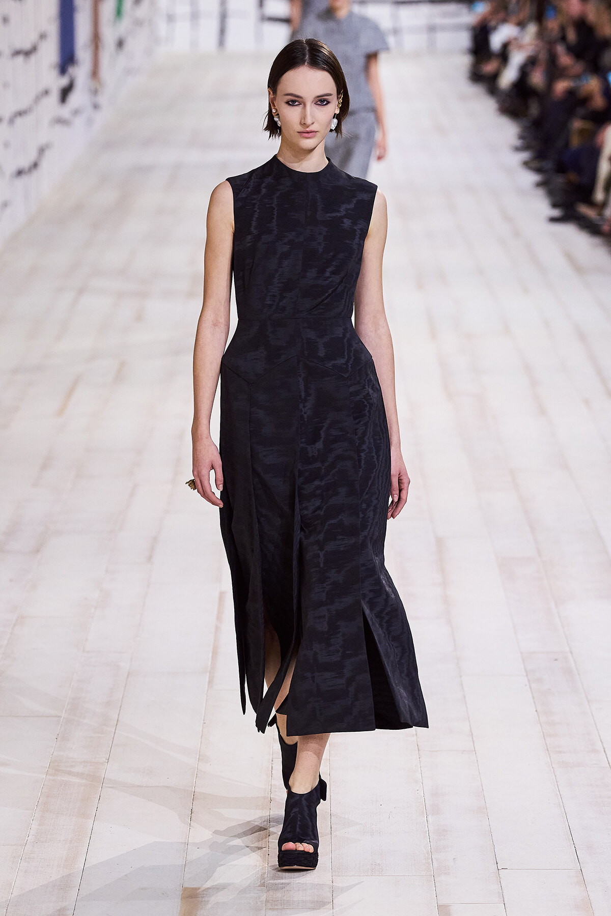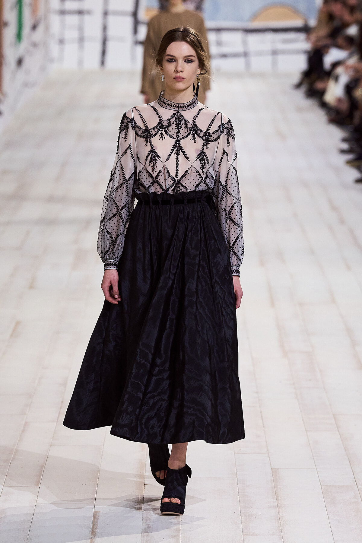 今回のコレクションで、マリア・グラウィア=キウリは、オートクチュールの持つオーラに視線を向けた。インスピレーション源となったのは、ムッシュー・ディオールが1952年秋冬のコレクションでデザインした「ラ シガール」ドレス。モワレ生地がカッティングの立体的な美しさを際立たせたこのアーカイブのドレスは、彼女の手によりコンテンポラリーなシルエットに蘇る。肩を丸く包み込むショールのような襟や、胸元が折り紙のように畳まれたバージャケット、腰回りを誇張したワイドなスカートなどを、ベージュや黒、モスグリーン、チェリーレッドのアーティザナルなモワレ生地で提案。ムッシュ―・ディオールも好んだこの素材が、1点1点のシルエットを際立たせた。