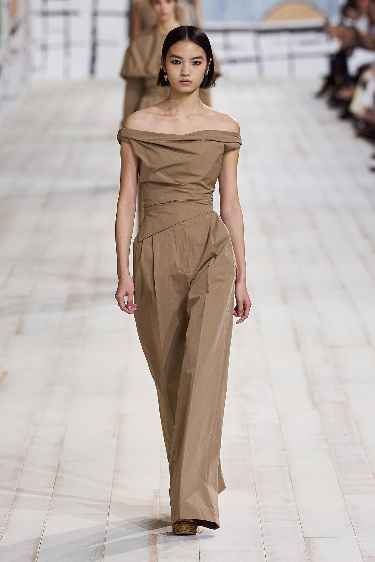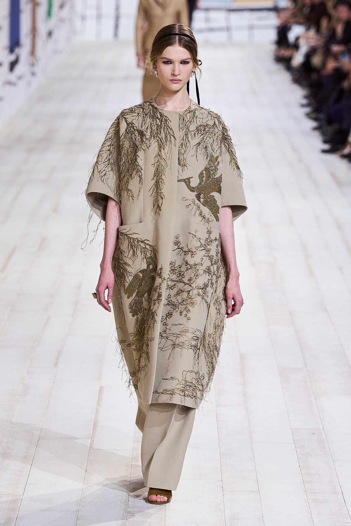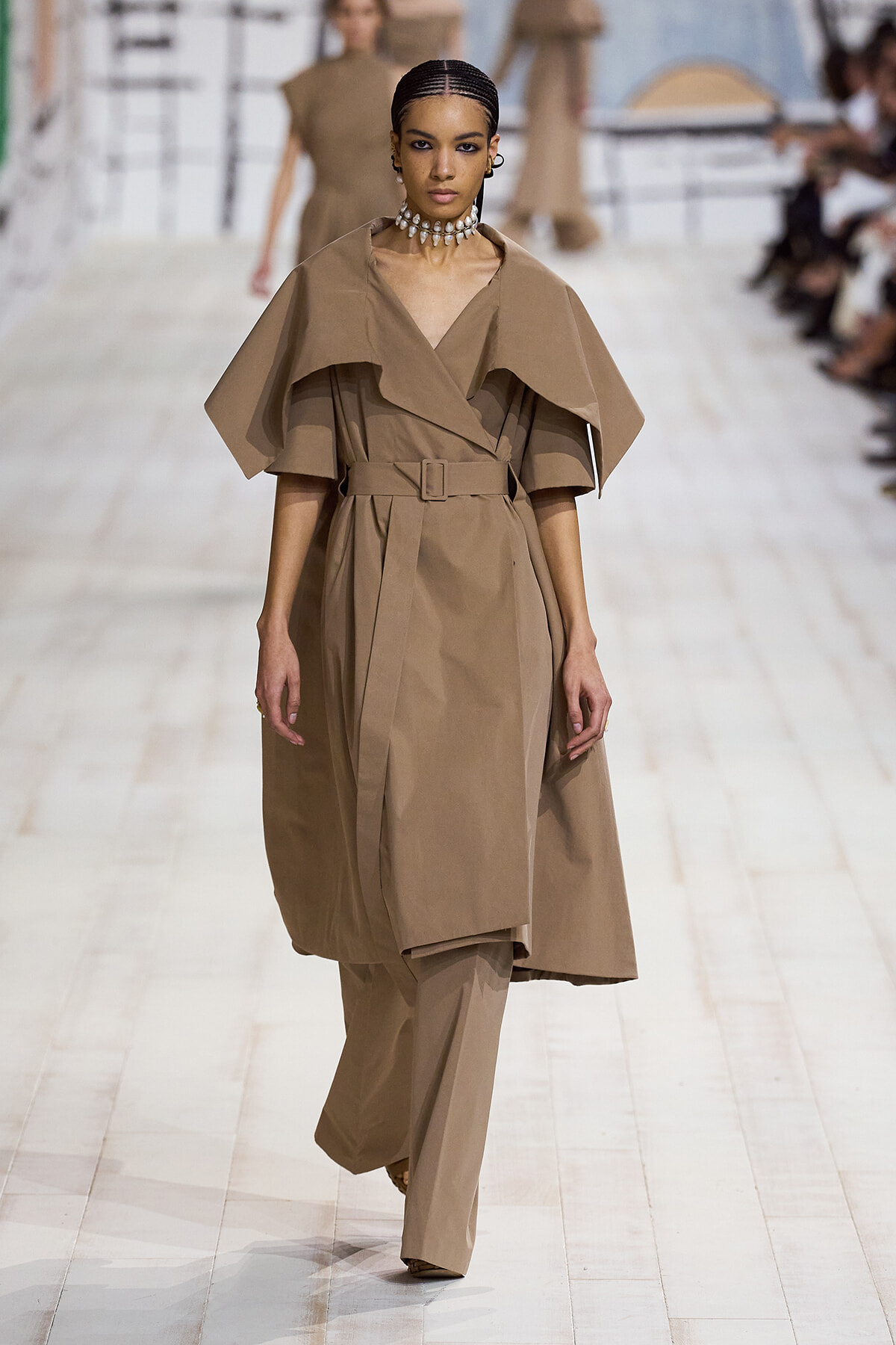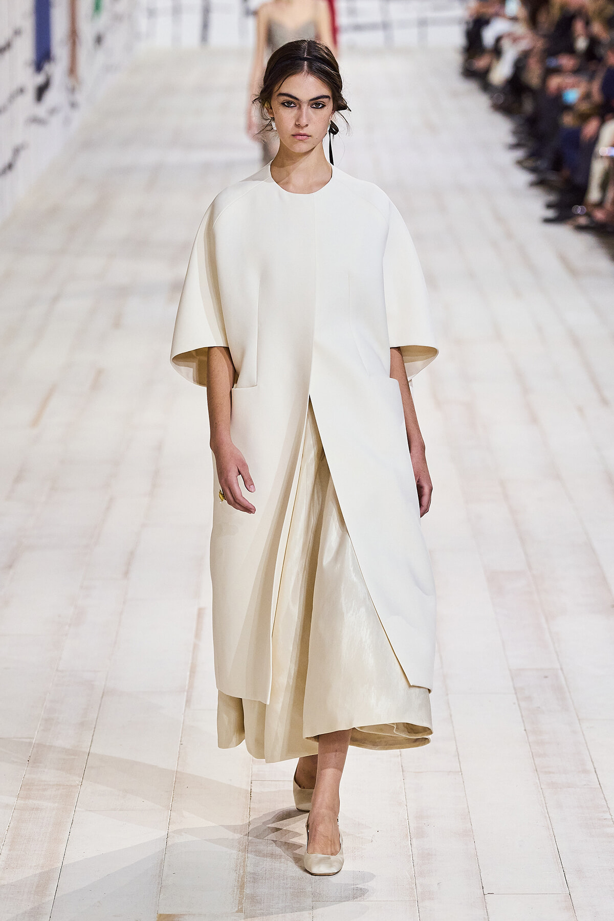 2024年1月22日(現地時間)、毎シーズン恒例となったパリのロダン美術館で、ディオールのオートクチュール 2024年春夏コレクションショーが開催。ショーは、会場が一瞬静まると音楽とともに「To weave is human…Dear readers, here we weave for you a play」と、詩の朗読が始まり、最初のモデルが登場。ファーストルックは、ケープのように肩を覆うダブルカラーが印象的なコートとワイドパンツのセットアップ。続いて、アシンメトリーやデコルテでフェミニンに仕上げたベージュの5ルックが登場する。服のフォルムとシルエットが際立つオープニングだ。