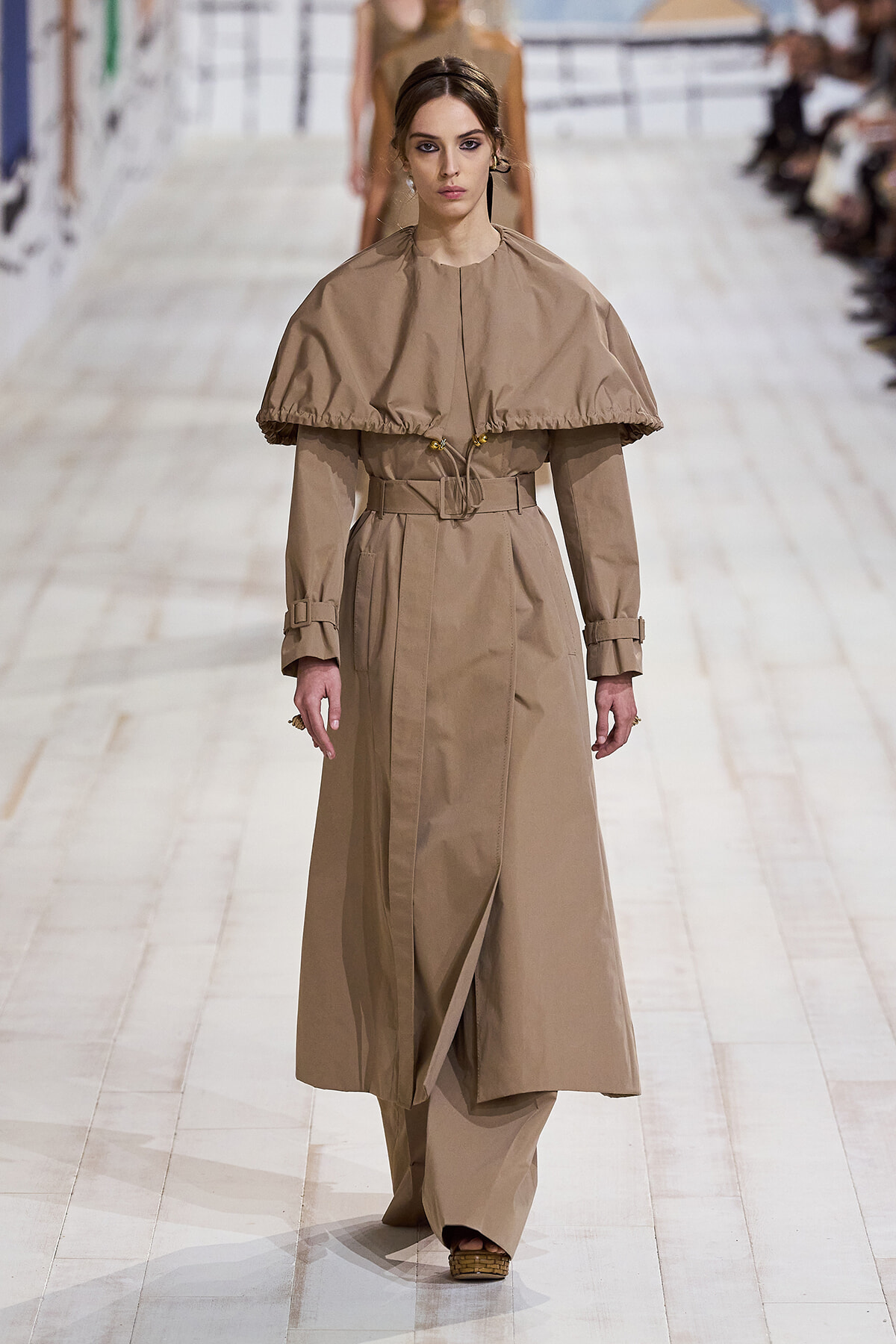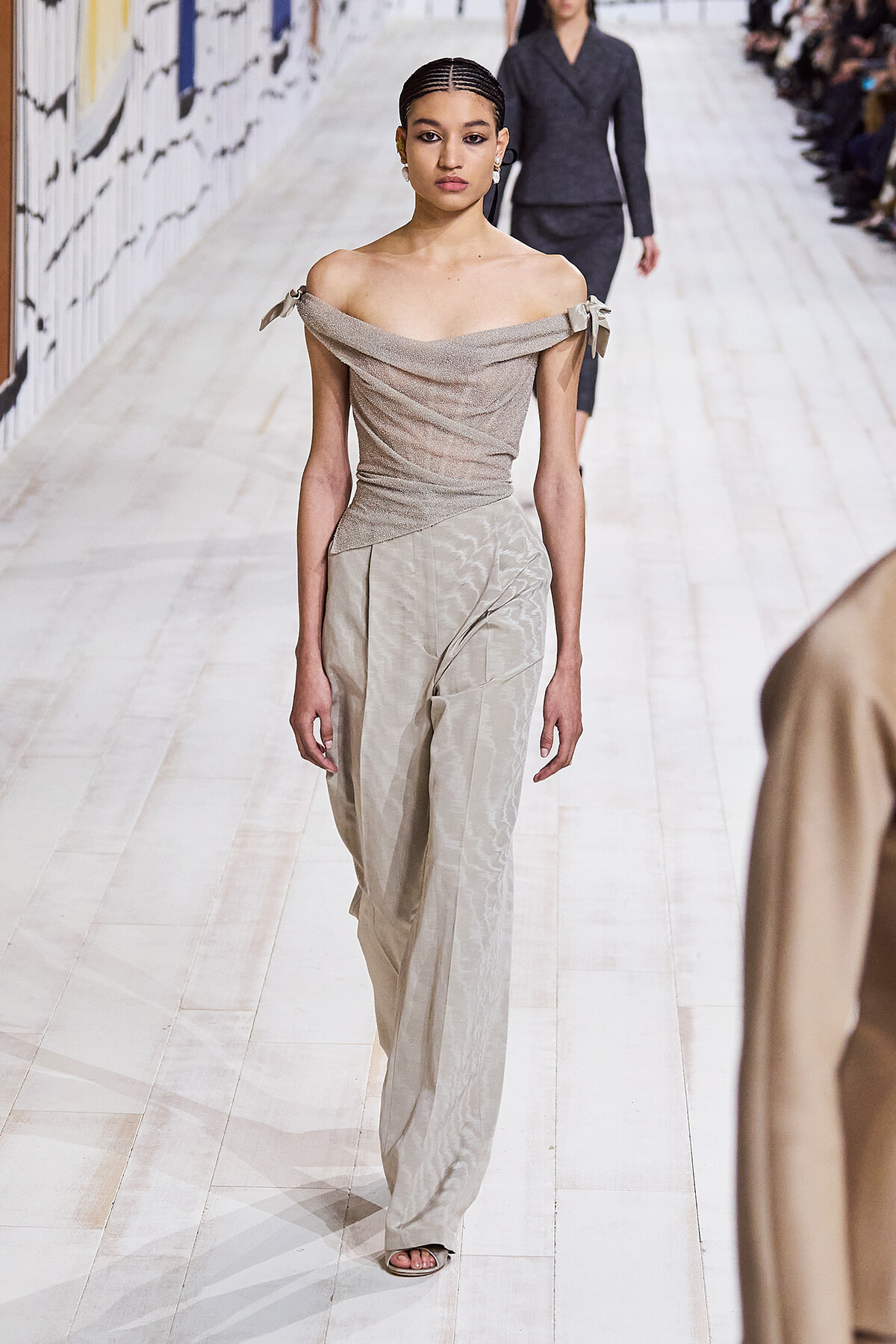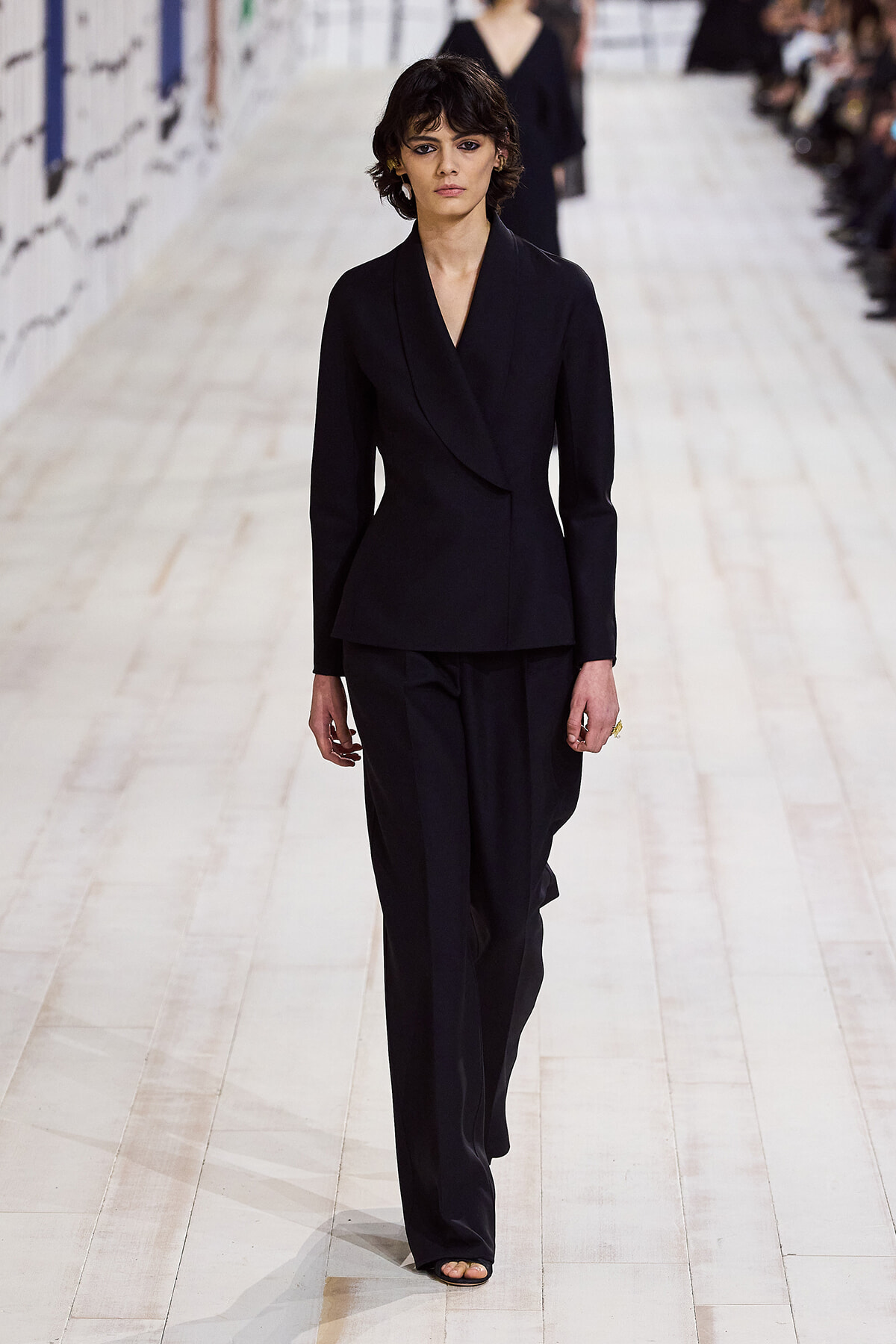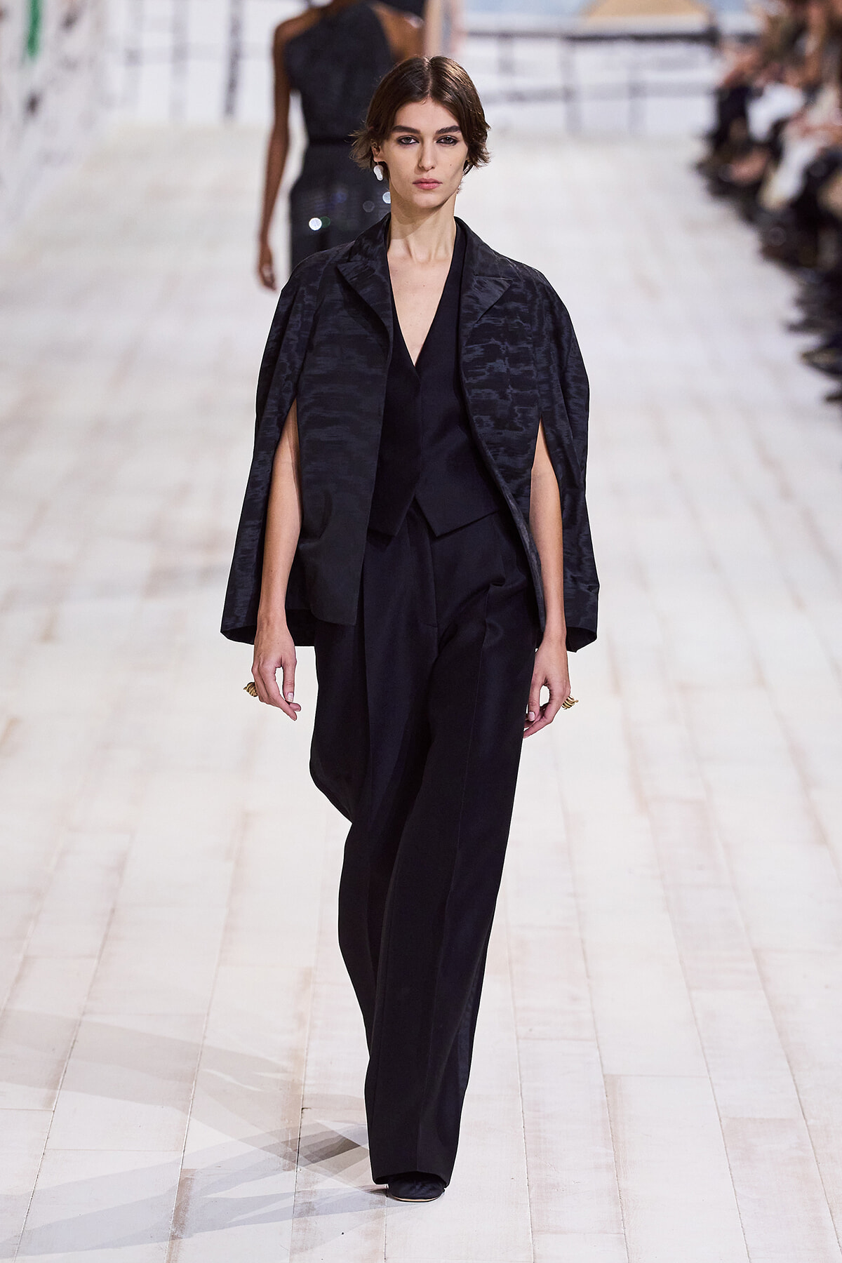 2024年1月22日(現地時間)、毎シーズン恒例となったパリのロダン美術館で、ディオールのオートクチュール 2024年春夏コレクションショーが開催。ショーは、会場が一瞬静まると音楽とともに「To weave is human…Dear readers, here we weave for you a play」と、詩の朗読が始まり、最初のモデルが登場。ファーストルックは、ケープのように肩を覆うダブルカラーが印象的なコートとワイドパンツのセットアップ。続いて、アシンメトリーやデコルテでフェミニンに仕上げたベージュの5ルックが登場する。服のフォルムとシルエットが際立つオープニングだ。