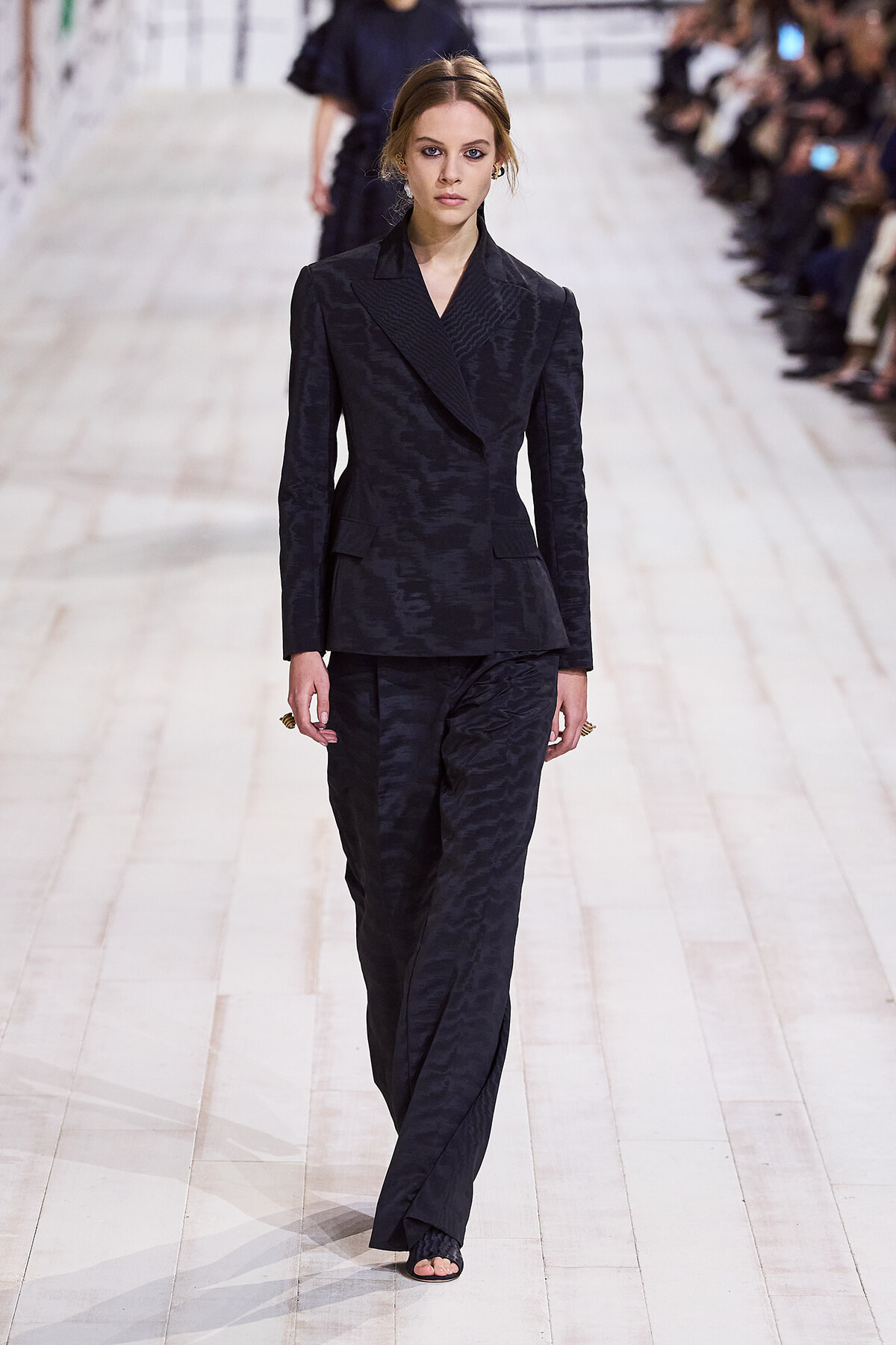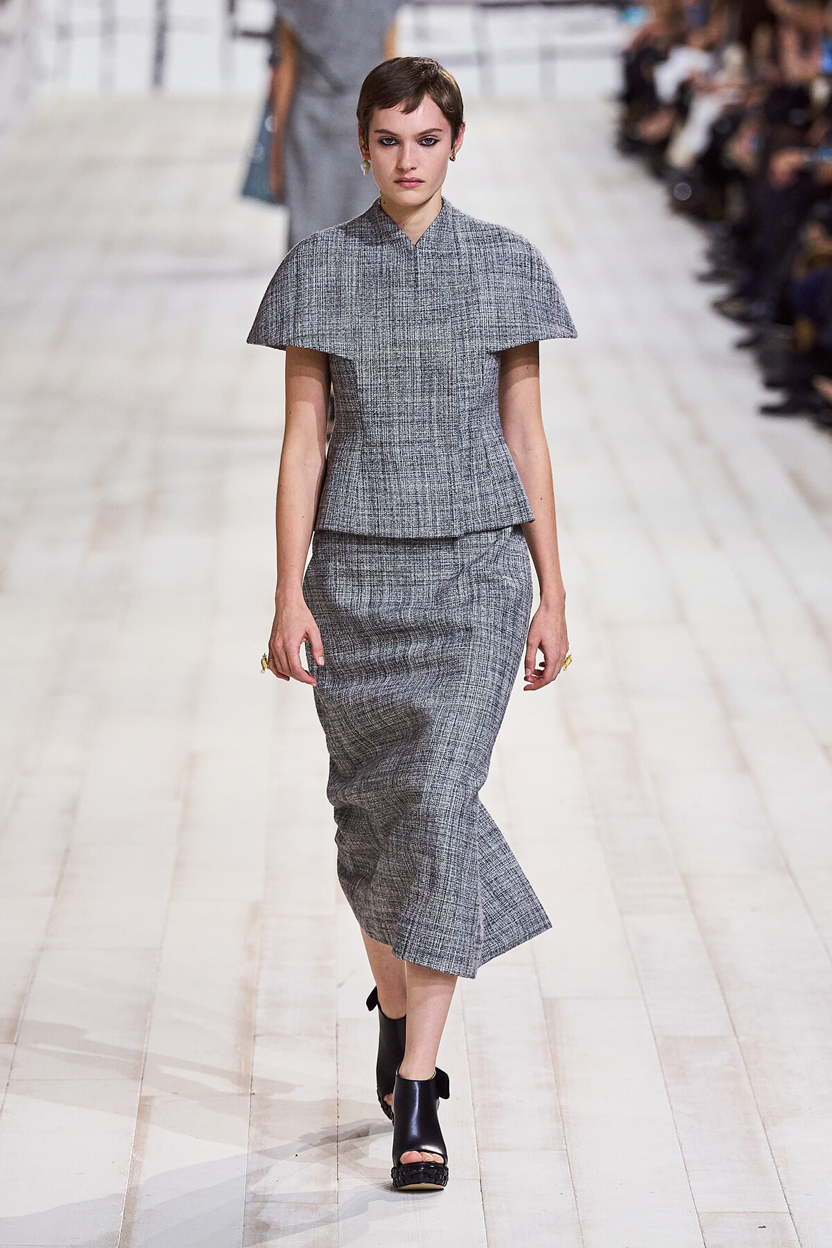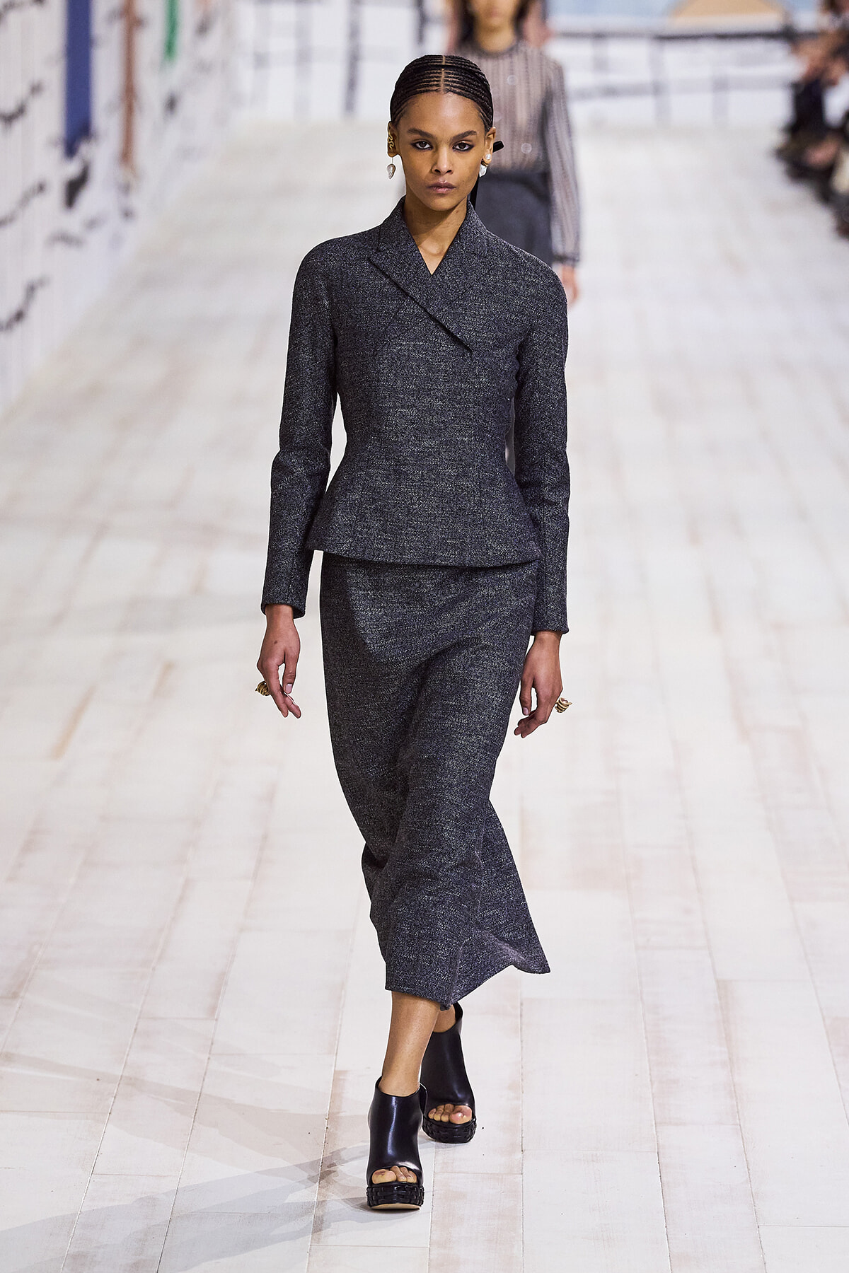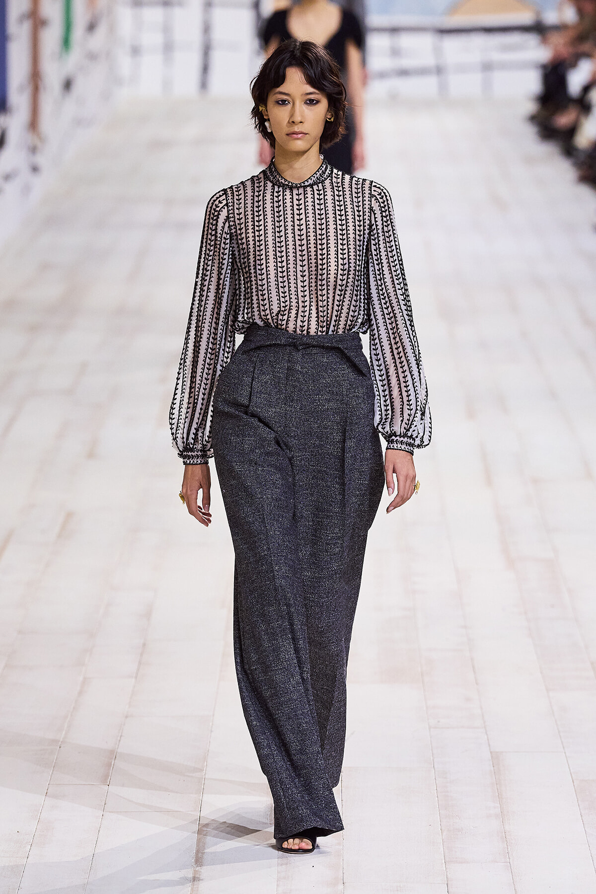 2024年1月22日(現地時間)、毎シーズン恒例となったパリのロダン美術館で、ディオールのオートクチュール 2024年春夏コレクションショーが開催。ショーは、会場が一瞬静まると音楽とともに「To weave is human…Dear readers, here we weave for you a play」と、詩の朗読が始まり、最初のモデルが登場。ファーストルックは、ケープのように肩を覆うダブルカラーが印象的なコートとワイドパンツのセットアップ。続いて、アシンメトリーやデコルテでフェミニンに仕上げたベージュの5ルックが登場する。服のフォルムとシルエットが際立つオープニングだ。