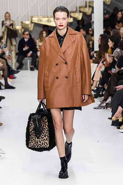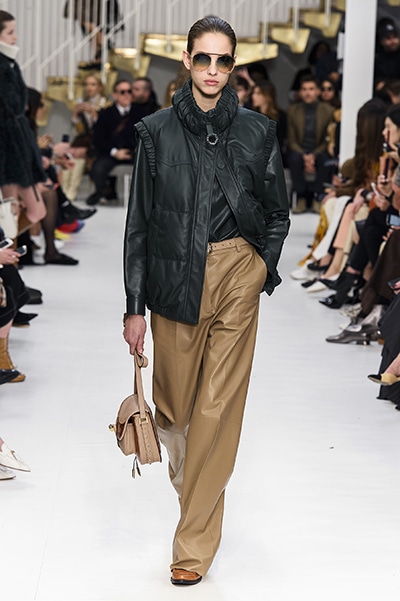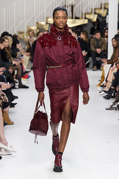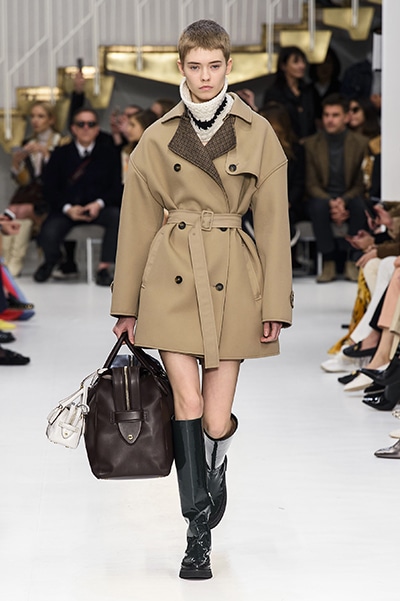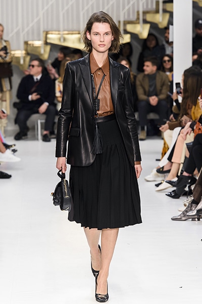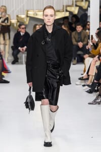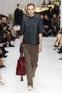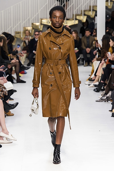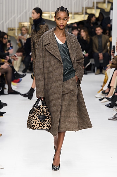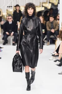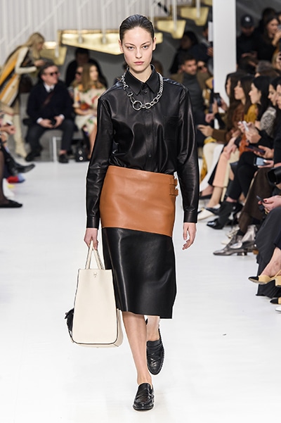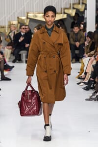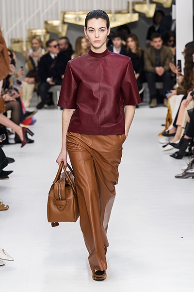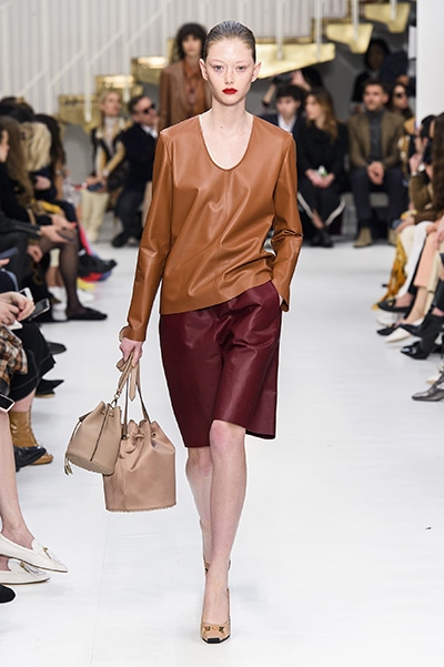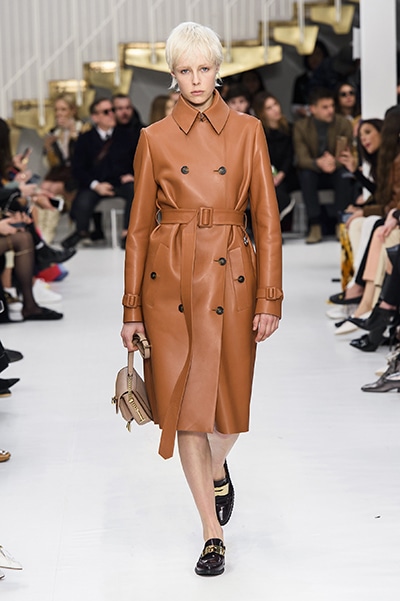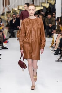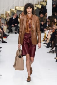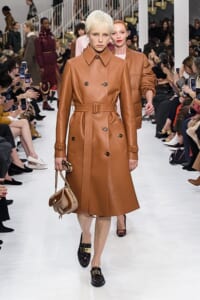 イタリアらしいエレガンスとは何か? トッズは、2019-20年秋冬コレクションで改めて上質なイタリアンエレガンスとは、ディテールへのこだわり、ものづくりへの敬意、洗練されているのにエフォートレスであることなどと定義づけ、得意のレザーをふんだんに使ったコレクションを発表。ナッパレザーで仕立てたパテントトレンチやブレザー、ボーイッシュなパンツ、リブニットに合わせた膝丈スカート、ときにロックやスポーティ、ボヘミアンなひと匙をプラスしながらも、上質なコーディネート。バケツ型バッグや「D スタイリング バッグ」など、レディライクながら機能性もあるバッグにも注目。