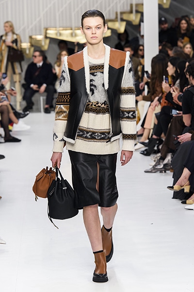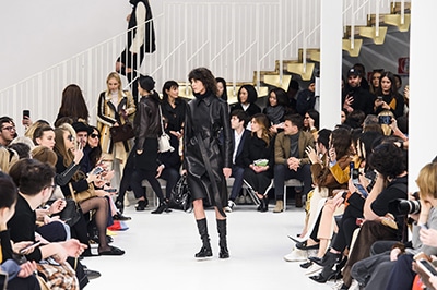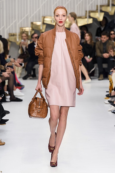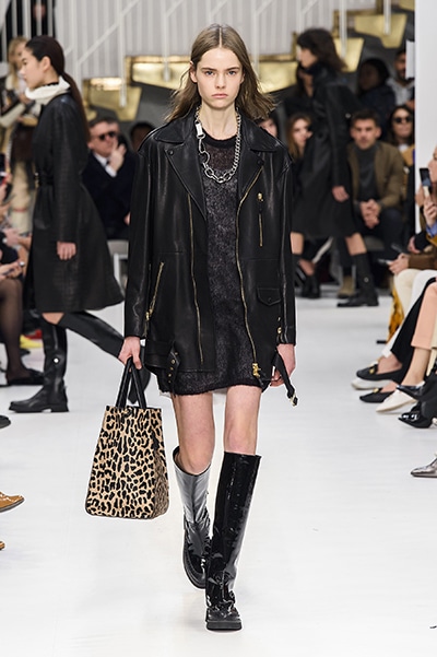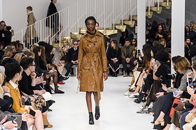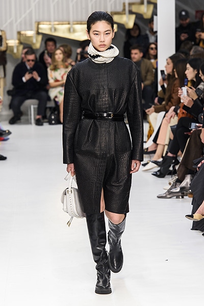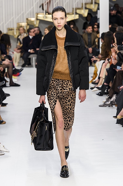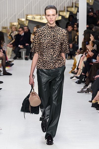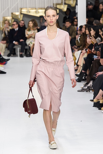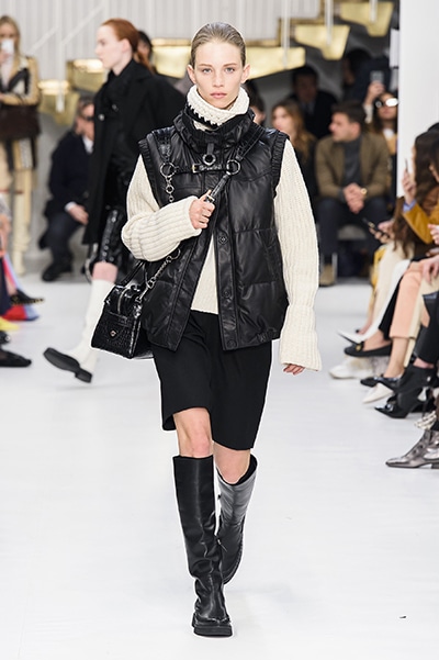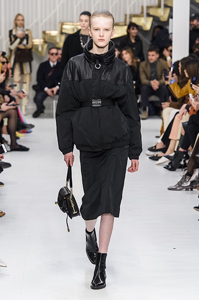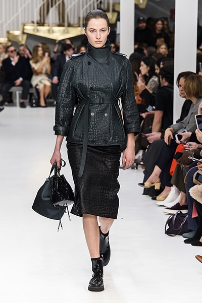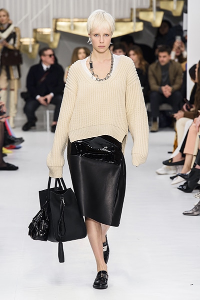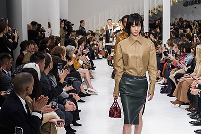 イタリアらしいエレガンスとは何か? トッズは、2019-20年秋冬コレクションで改めて上質なイタリアンエレガンスとは、ディテールへのこだわり、ものづくりへの敬意、洗練されているのにエフォートレスであることなどと定義づけ、得意のレザーをふんだんに使ったコレクションを発表。ナッパレザーで仕立てたパテントトレンチやブレザー、ボーイッシュなパンツ、リブニットに合わせた膝丈スカート、ときにロックやスポーティ、ボヘミアンなひと匙をプラスしながらも、上質なコーディネート。バケツ型バッグや「D スタイリング バッグ」など、レディライクながら機能性もあるバッグにも注目。