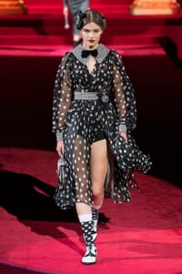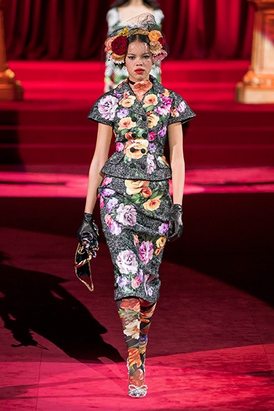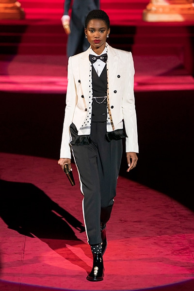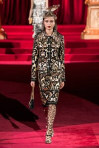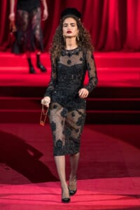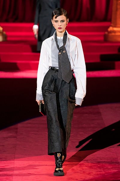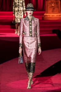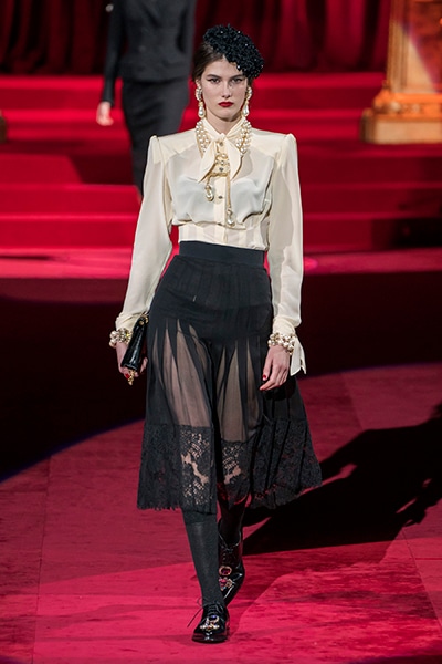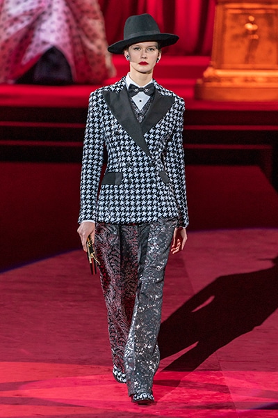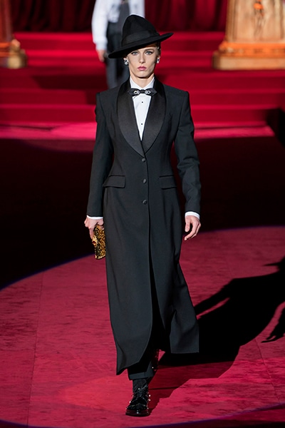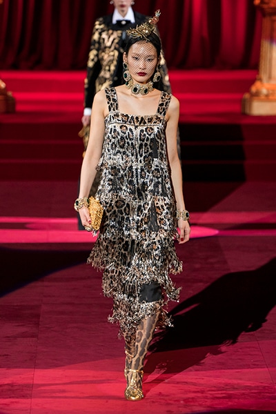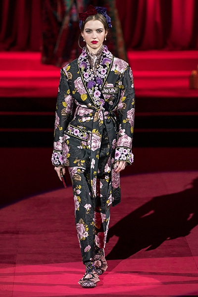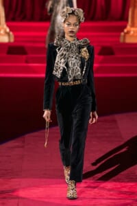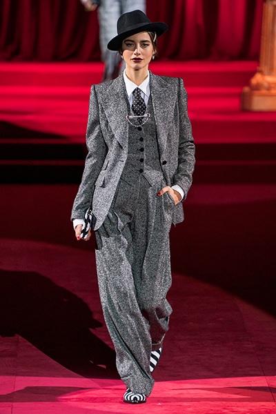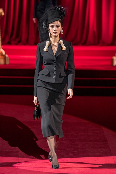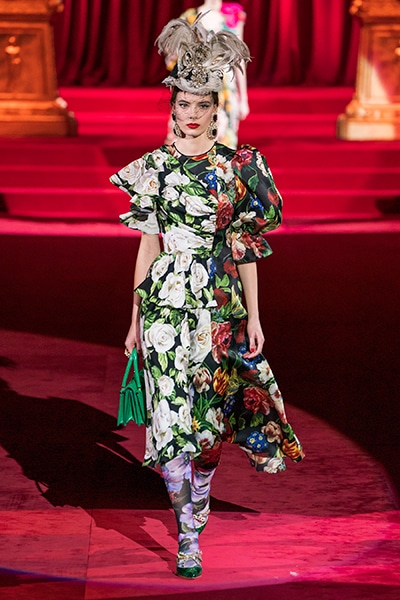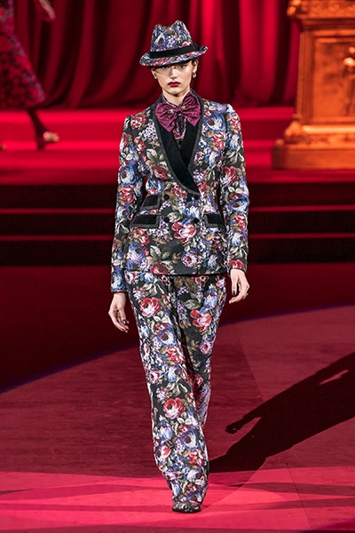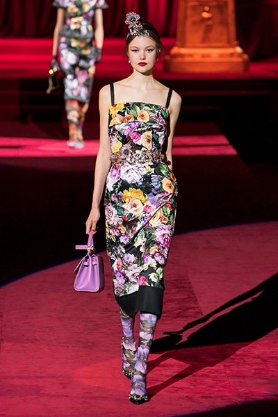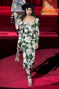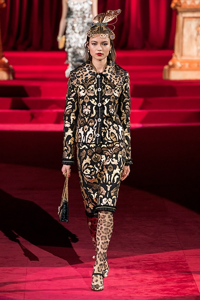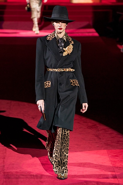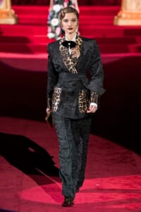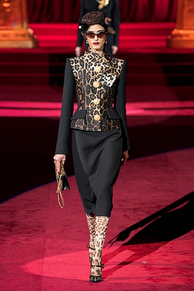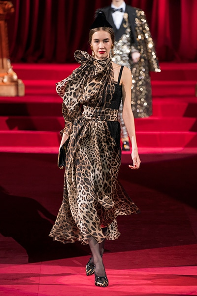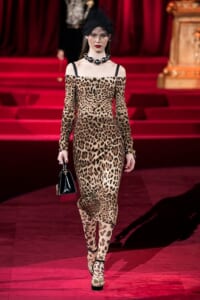 ドルチェ&ガッバーナの2019-20年 秋冬 コレクションのテーマは「フェミニン エレガンス」。 レオナルド・ダ・ヴィンチ、ラファエロなどのイタリアの巨匠たちによる絵画などイタリアンアートもキーワードとなっており、黒×白のモーニングスタイルに身を包んだマスキュリンな女性からブランドが得意とするナイトウェア、レオパード、フラワーなど、1930年代から60年代までのさまざまな要素をミックスしたスタイルを展開。 ラストはウエディングルックで女性へのオマージュを捧げた。