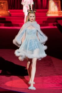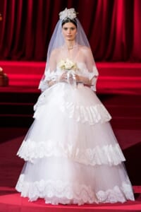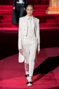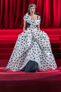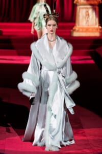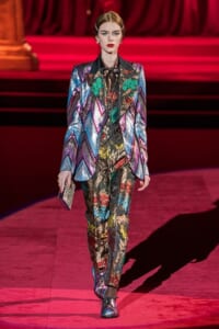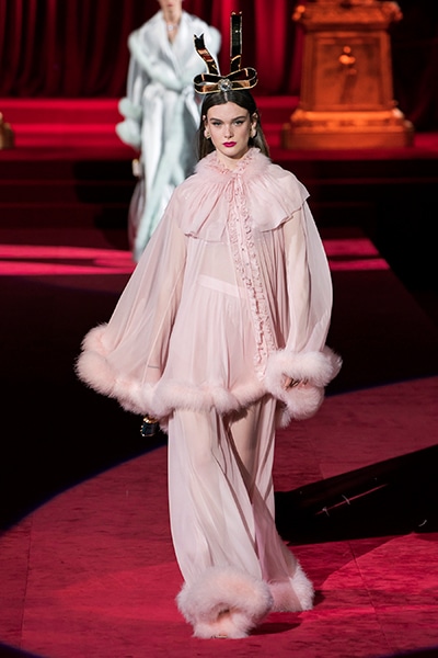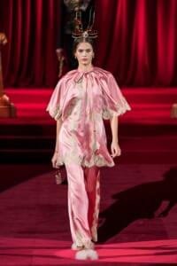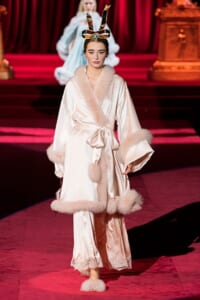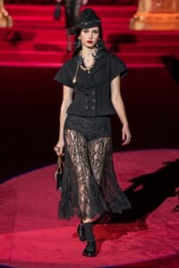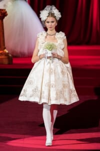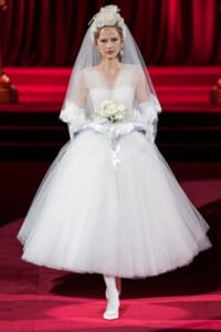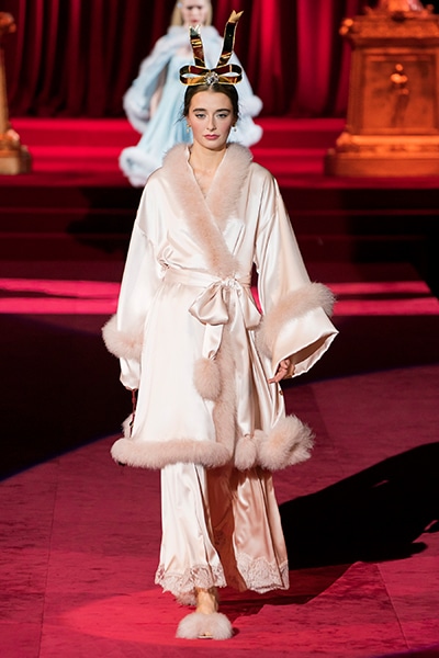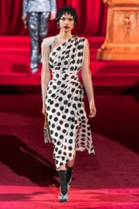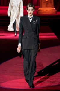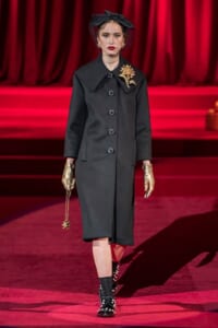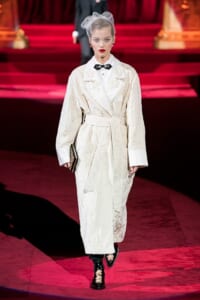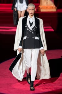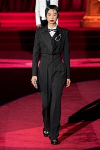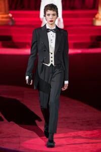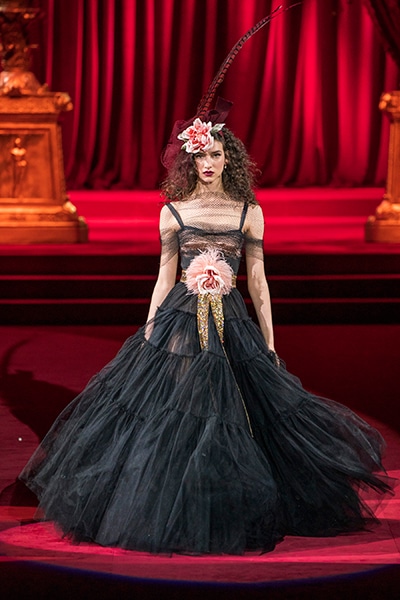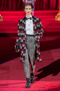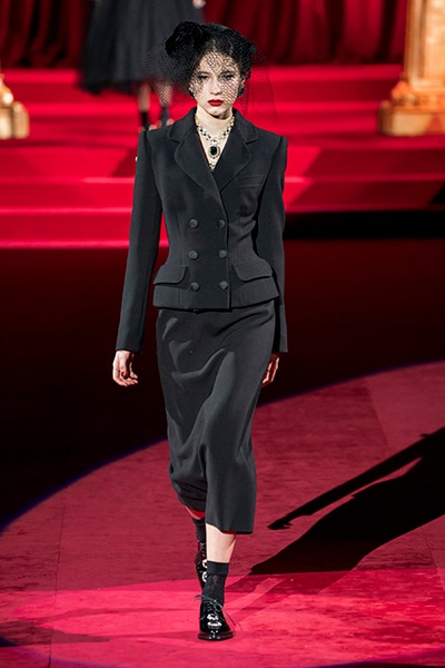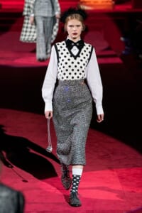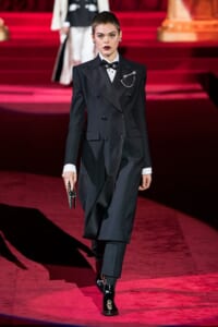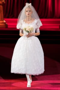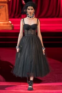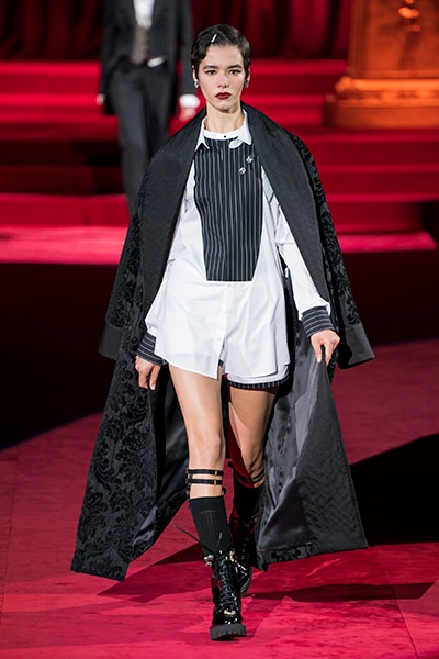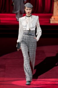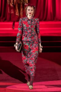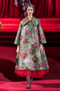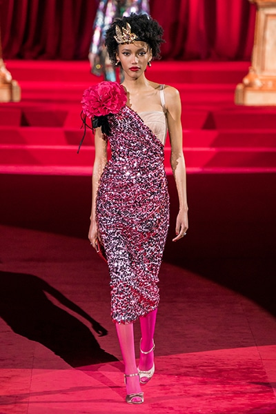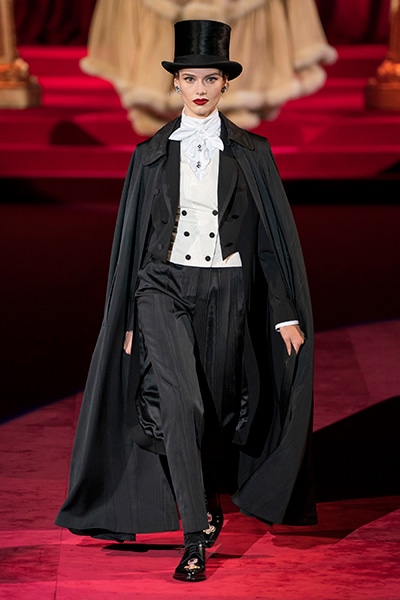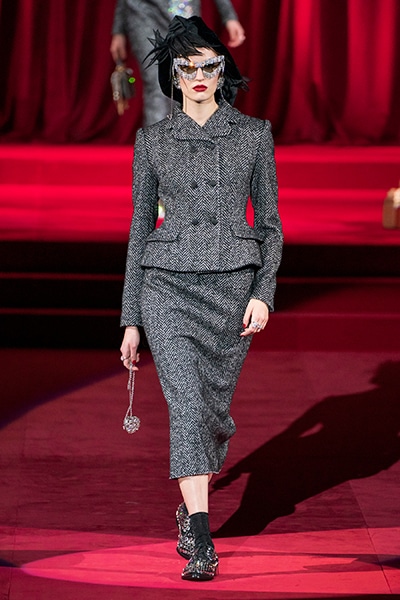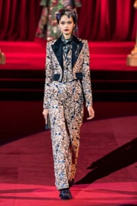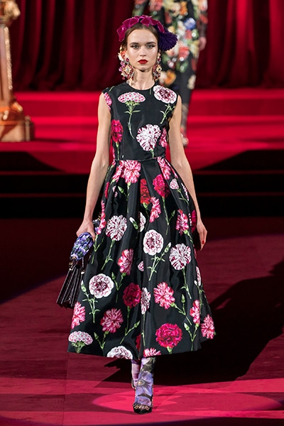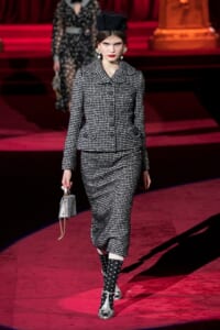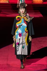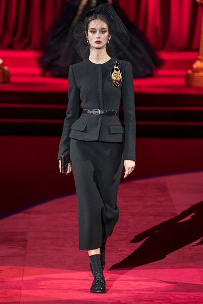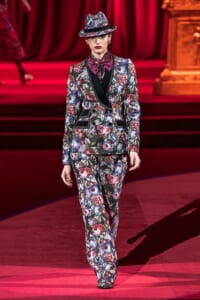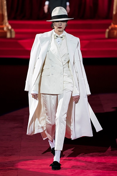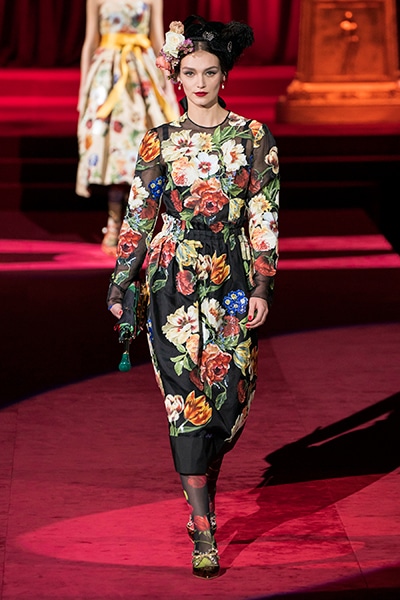 ドルチェ&ガッバーナの2019-20年 秋冬 コレクションのテーマは「フェミニン エレガンス」。 レオナルド・ダ・ヴィンチ、ラファエロなどのイタリアの巨匠たちによる絵画などイタリアンアートもキーワードとなっており、黒×白のモーニングスタイルに身を包んだマスキュリンな女性からブランドが得意とするナイトウェア、レオパード、フラワーなど、1930年代から60年代までのさまざまな要素をミックスしたスタイルを展開。 ラストはウエディングルックで女性へのオマージュを捧げた。