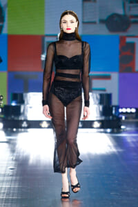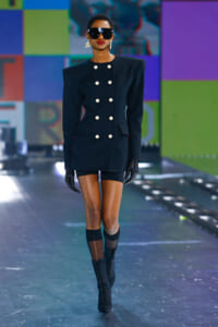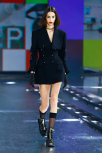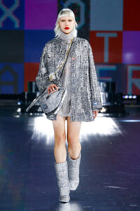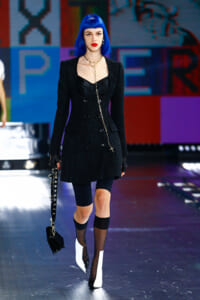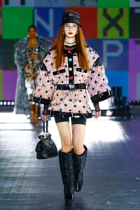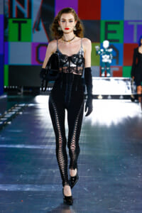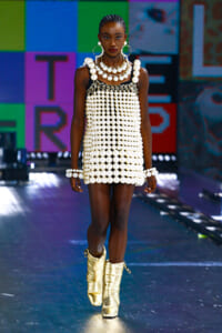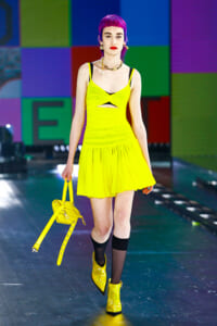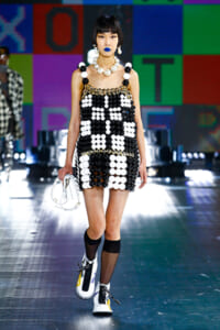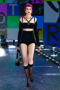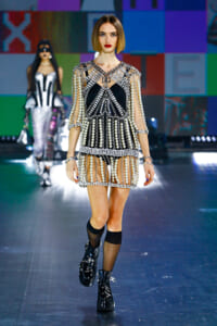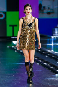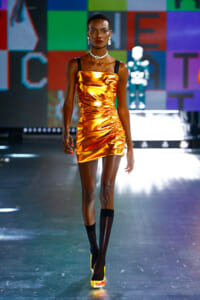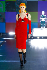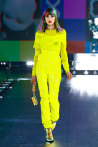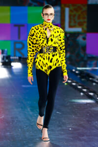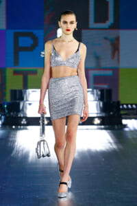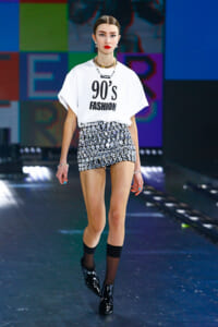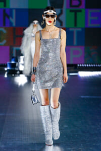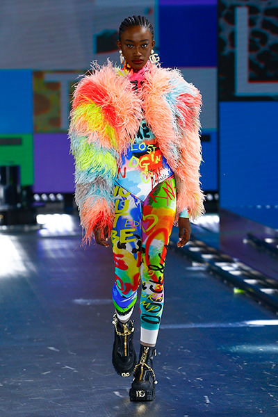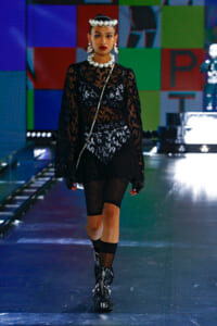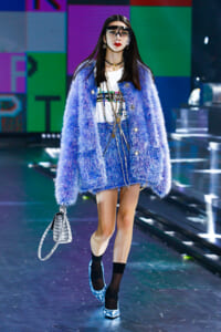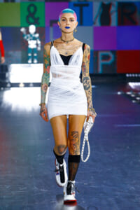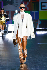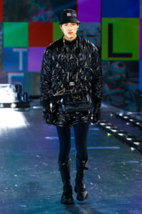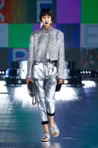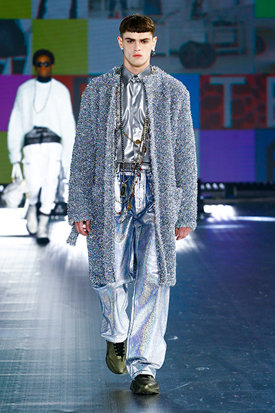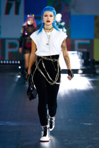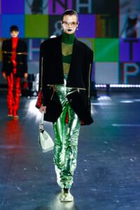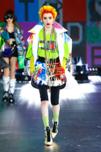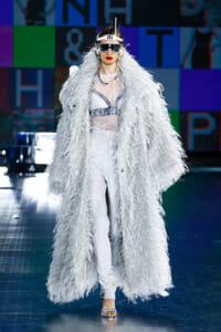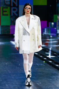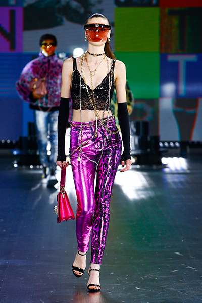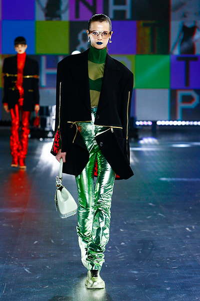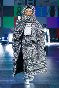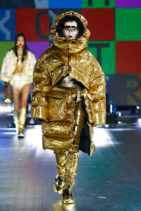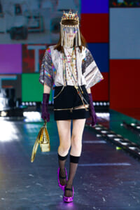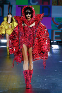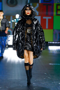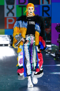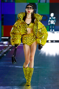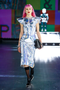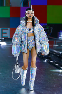 90年代に流行したランジェリーディテールのセットアップは、光沢感のあるナイロンに包まれて近未来のレイヤードルックに変身。レインボーヘアのモデルは、メタリックシルバーのドレスやボリュームのあるブーツを着こなし、ロボットをイメージさせるルックス。なかには、肩を強調したオーバーサイズのボクシージャケットや、ブランドの永遠のアイコン、レオパード柄が輝くネオン色のダウンジャケット、トゥーマッチなほど大きなパールネックレスなど、ユニークなピースも登場した。br>