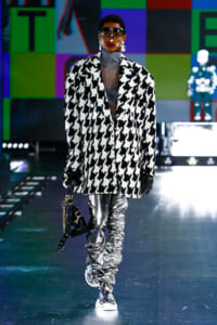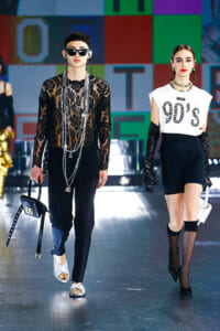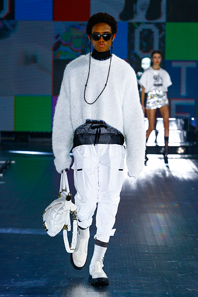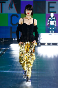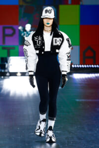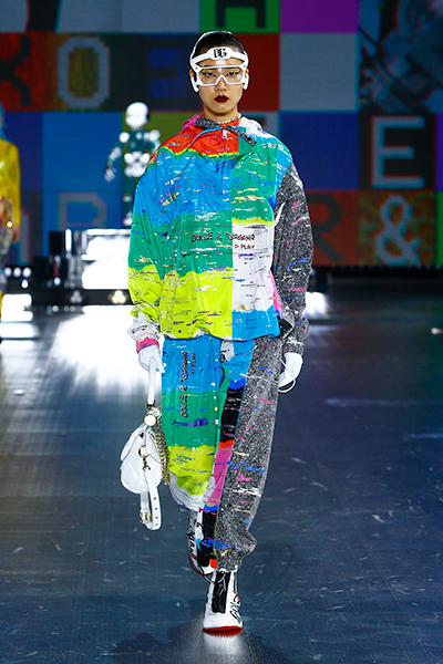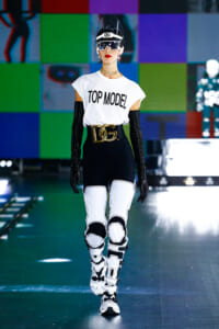 ‟90s”‟TOP MODEL”などのロゴ使いや、フェイスシールドなど今年らしいアクセサリーを加えて、ブランドのDNAと現代のロボット技術を紡ぐストーリーをパワフルに表現した。
