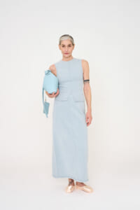 • Older woman with gray hair wearing a long camel coat over a peach dress, holding a light blue handbag against a white studio background.