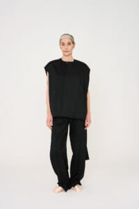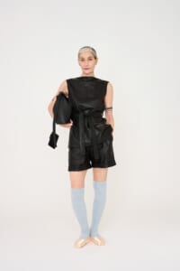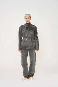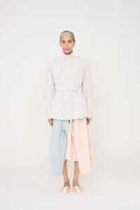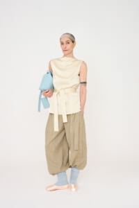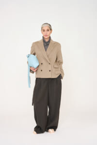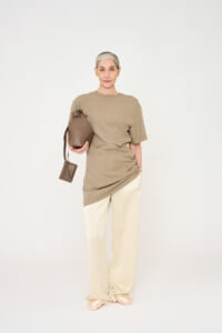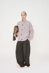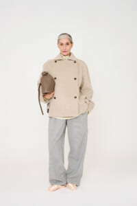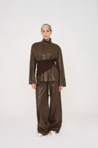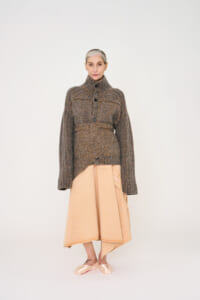 • Model wearing a beige belted knit jacket and matching wide-leg pants in a neutral studio setting, tan-toned layered look.