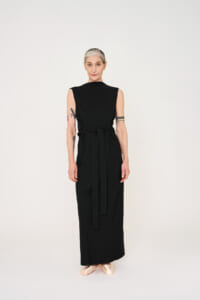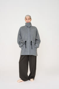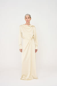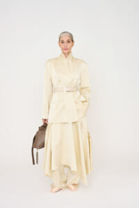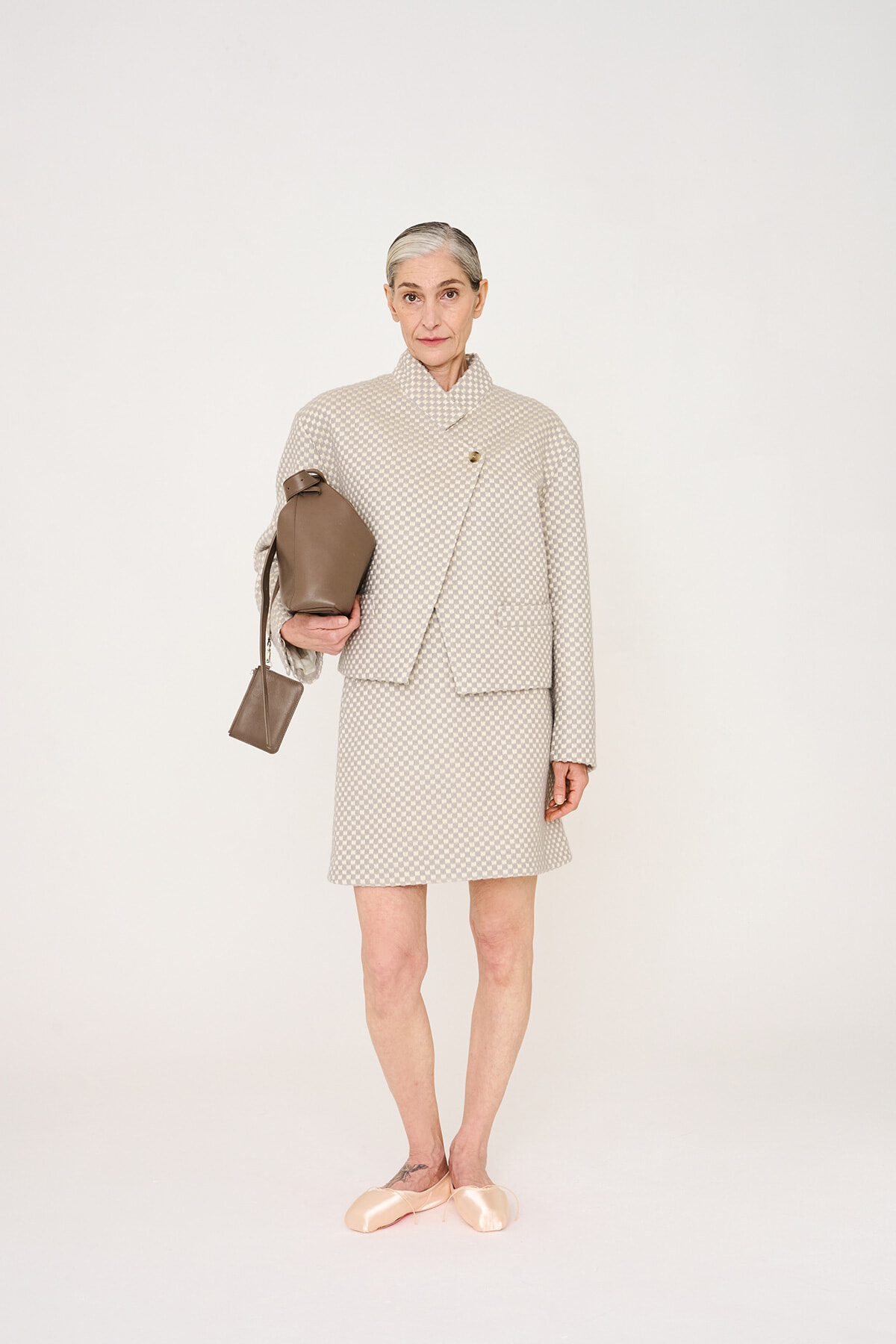 • Full-body shot of a senior woman wearing a light gray belted knit suit with a high collar and cream inner layer, standing against a plain backdrop.