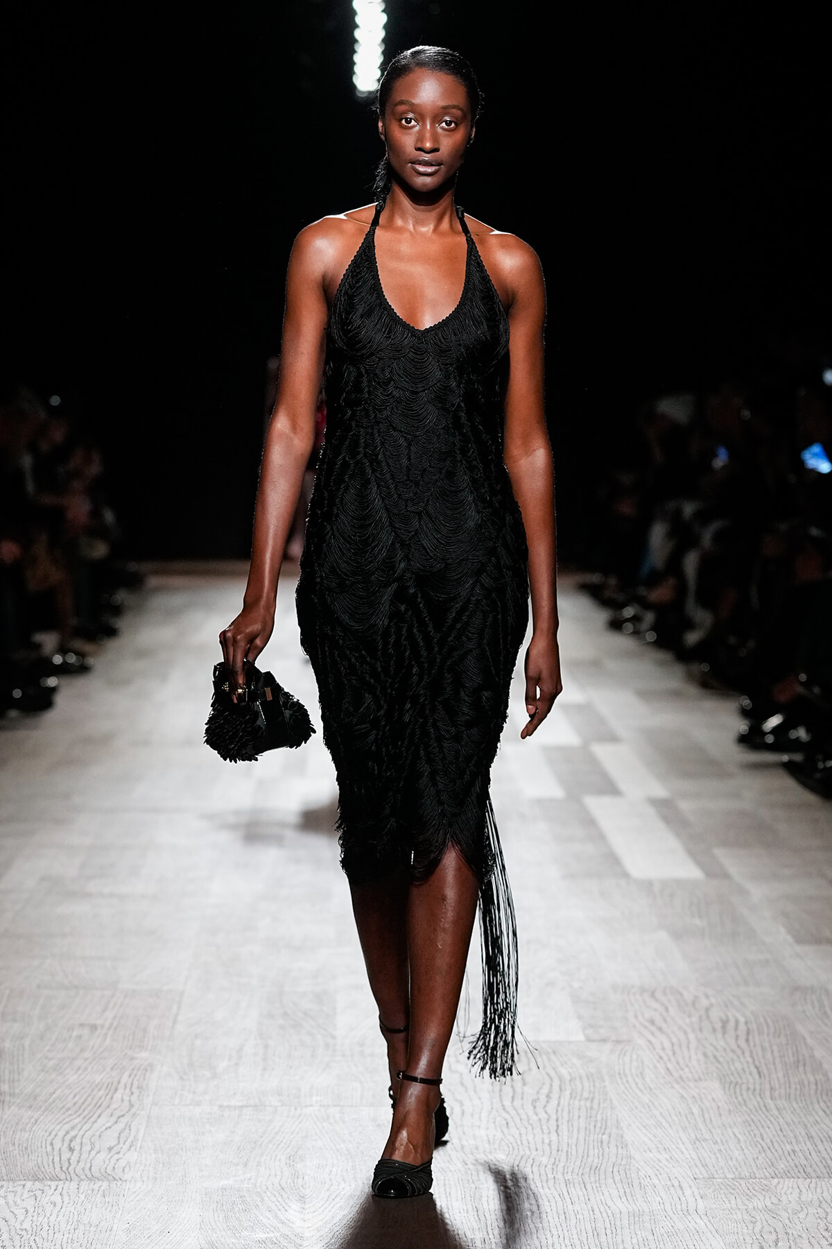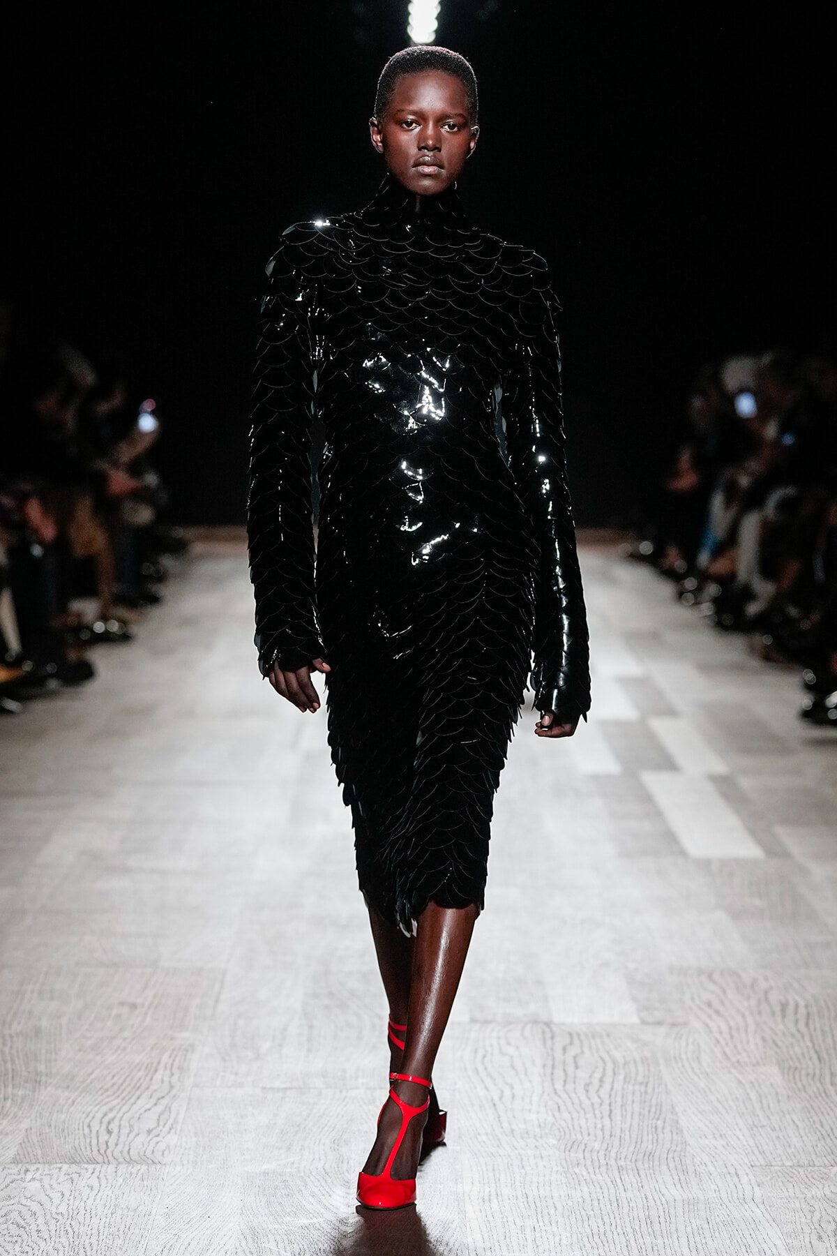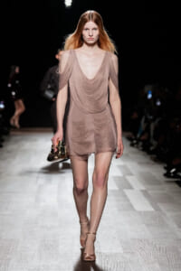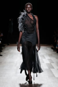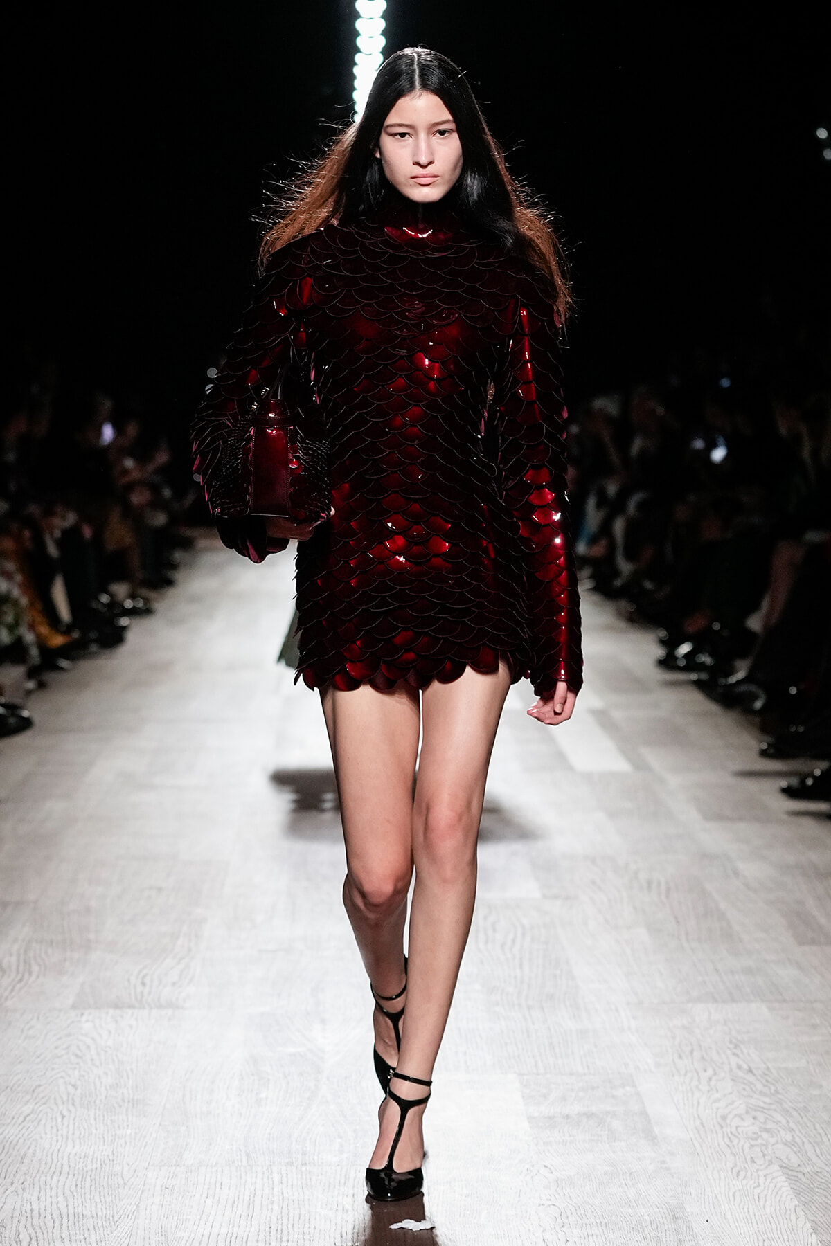短いヘムライン、スリンキーなダンスドレス、優雅なフェザーのあしらい、流動的な素材やフリンジ、リラックスしたカット。甲冑のようにも見える鱗状のドレスも登場。