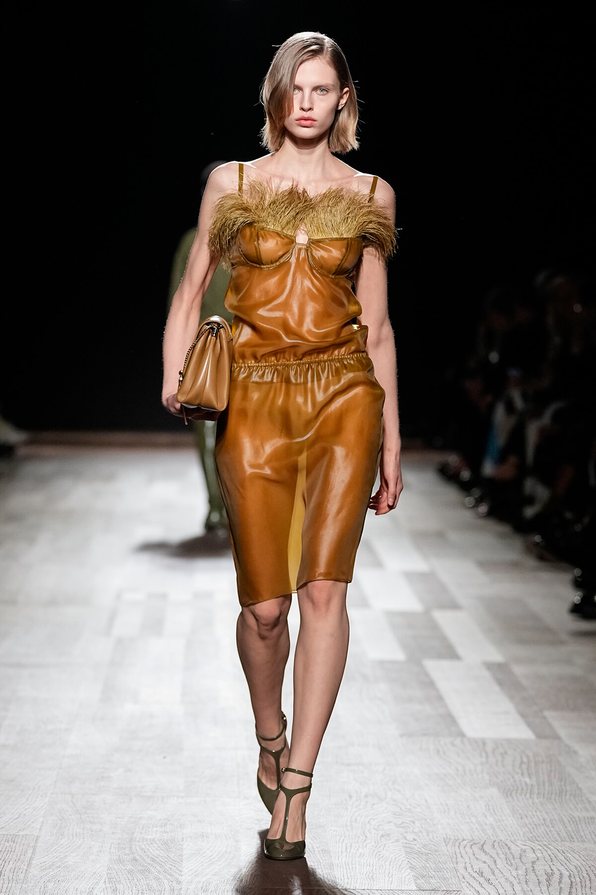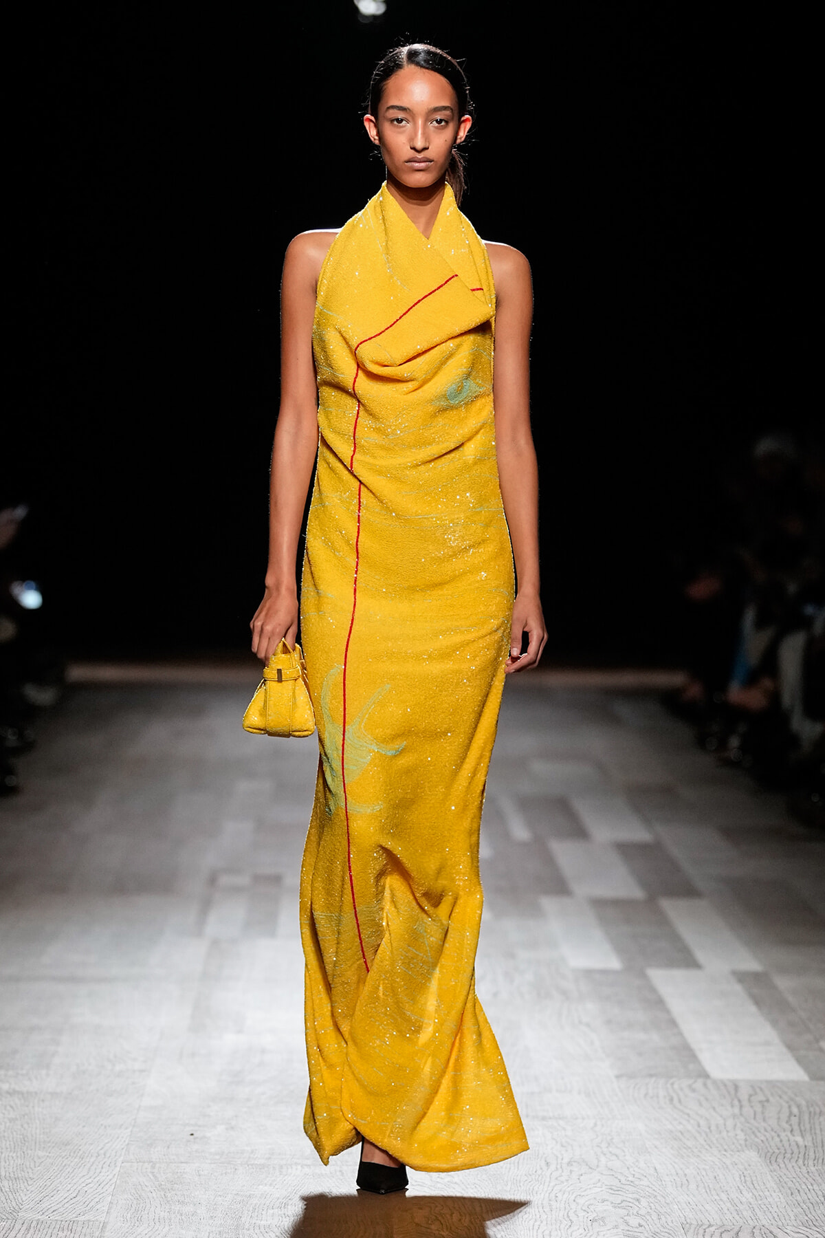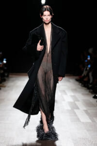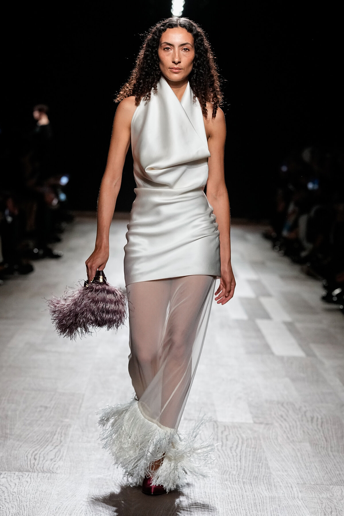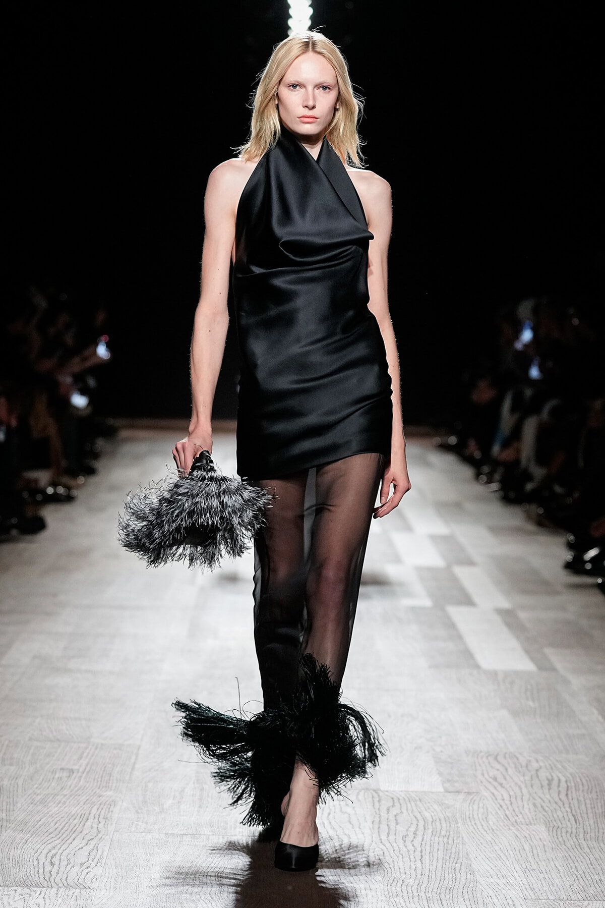 短いヘムライン、スリンキーなダンスドレス、優雅なフェザーのあしらい、流動的な素材やフリンジ、リラックスしたカット。甲冑のようにも見える鱗状のドレスも登場。