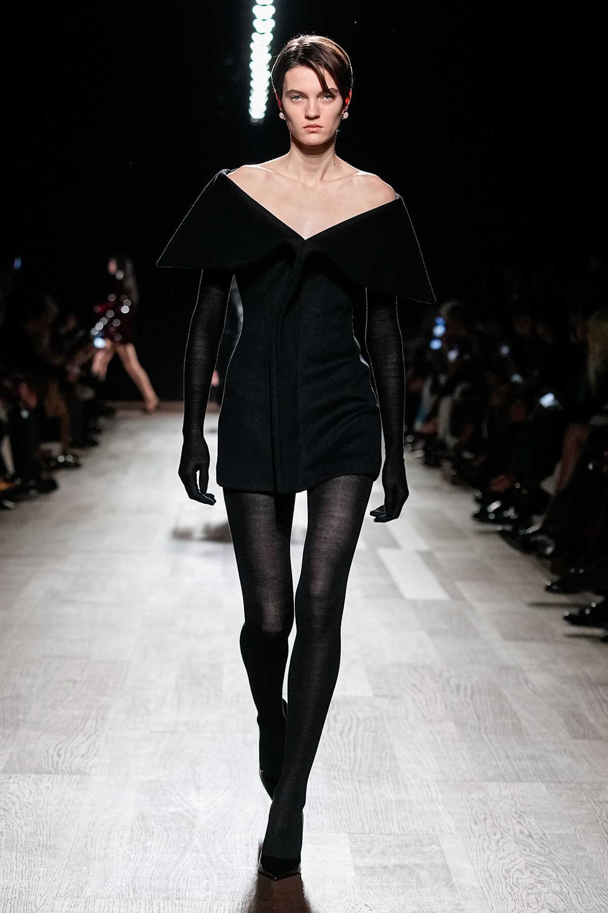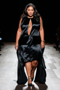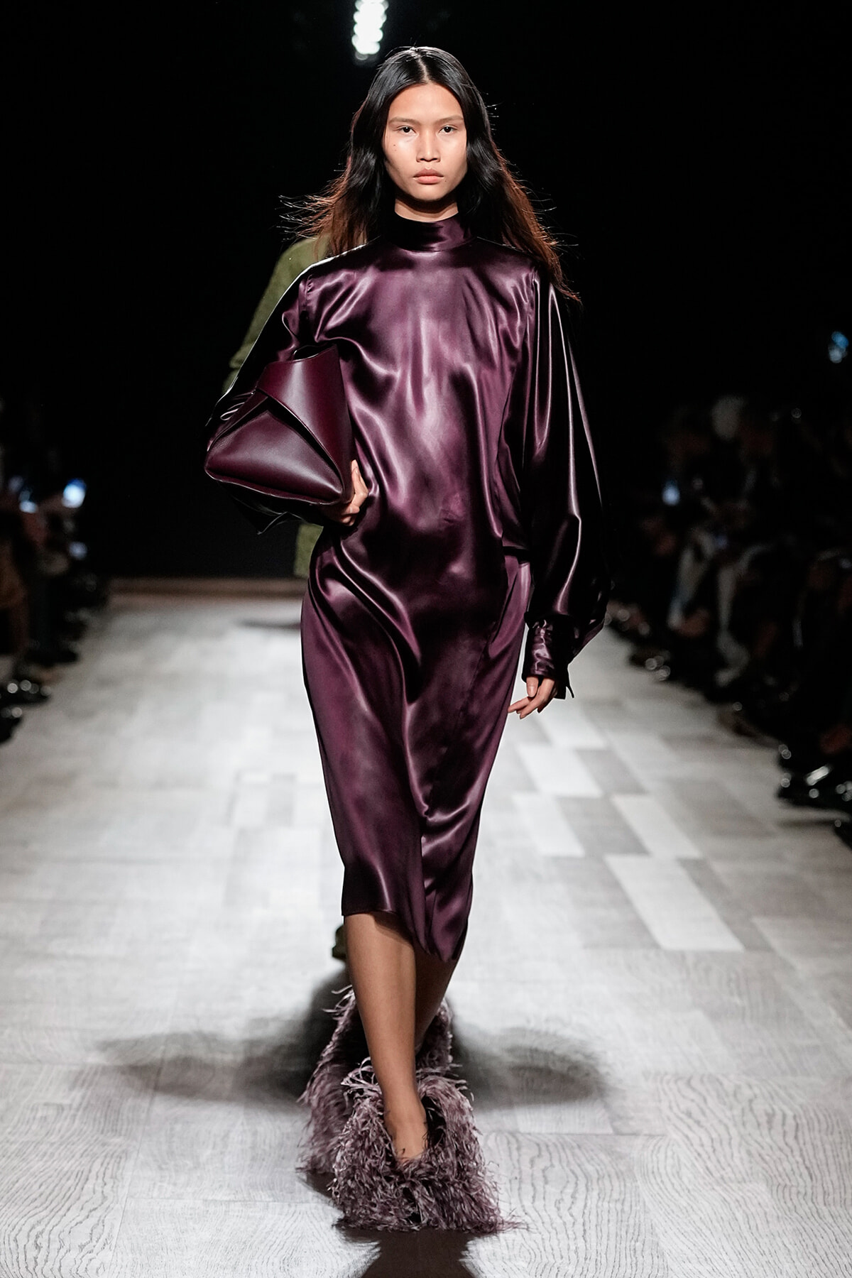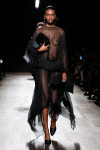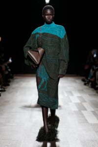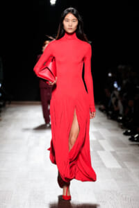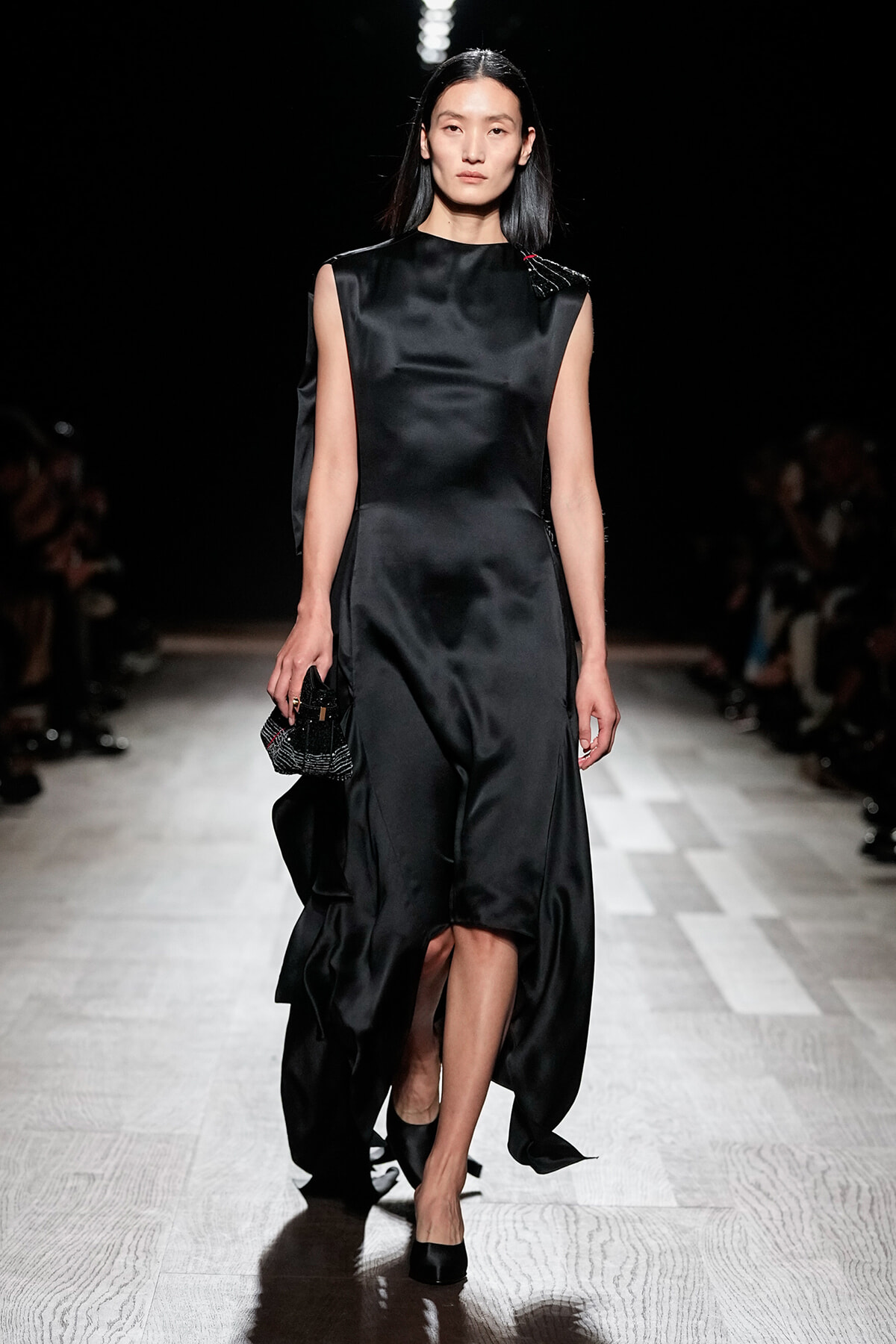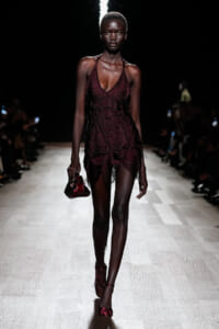 短いヘムライン、スリンキーなダンスドレス、優雅なフェザーのあしらい、流動的な素材やフリンジ、リラックスしたカット。甲冑のようにも見える鱗状のドレスも登場。