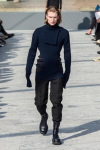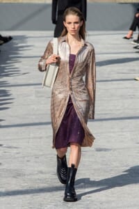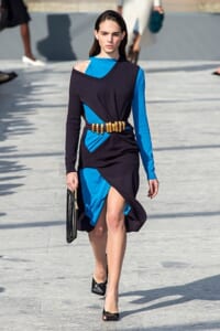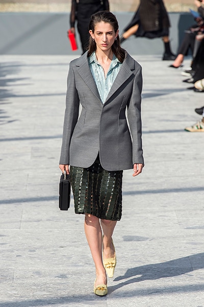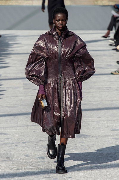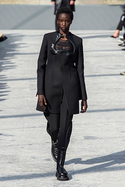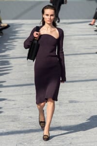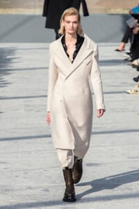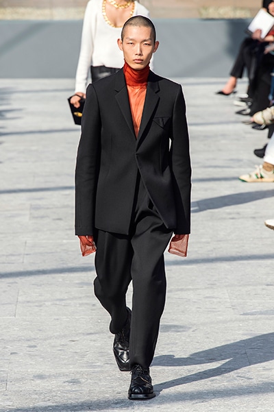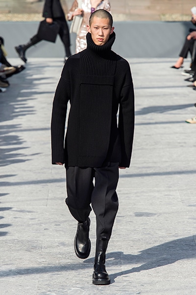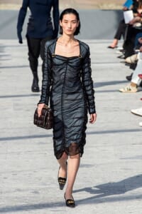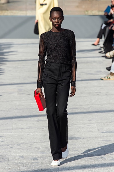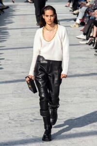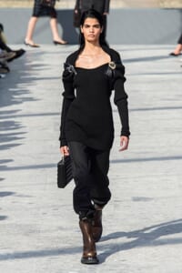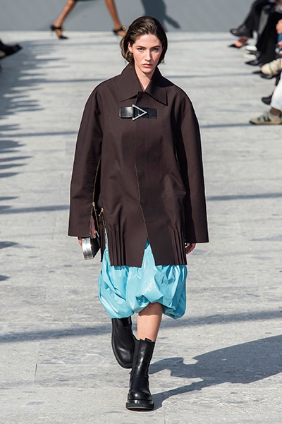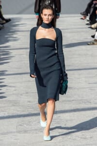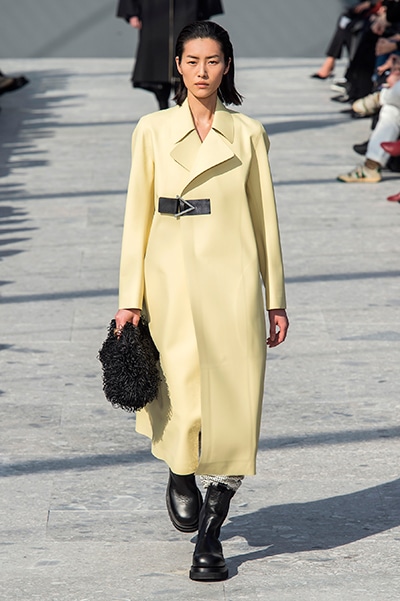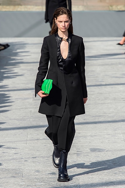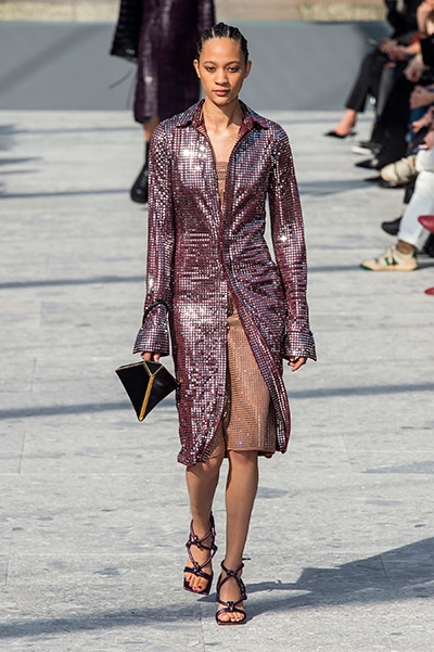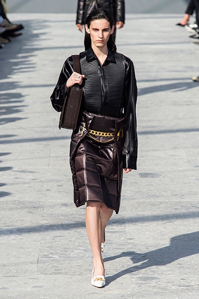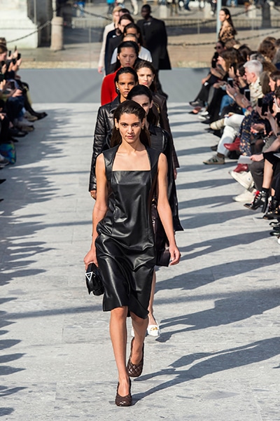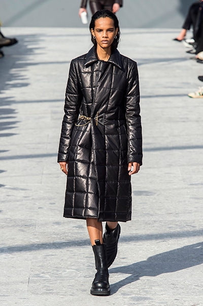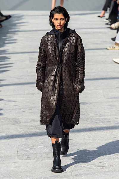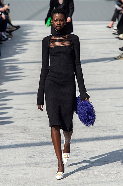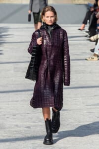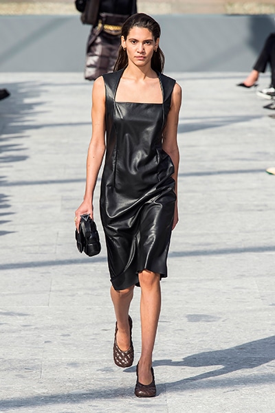 クリエイティブ・ディレクター、ダニエル・リーによるファースト・コレクションであるボッテガ・ヴェネタの2019年フォール。ミニマルなシルエットながらセクシーなバイカー風の女性らしさを演出するレザーのIラインドレスからスタートしたコレクションは、ブランドが得意とする職人技を活かしつつも、伝統とモダニティとテクノロジーを融合させ、ときにエッジ―に表現。ブランドのアイコンでもあるイントレチャートをキルティングレザーとして表現したり、デコルテを強調したシルエットのドレスで女らしさをアピールしたり、バイカーやミリタリーといった要素をタフかつフェミニンに仕上げた。