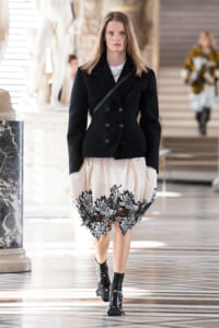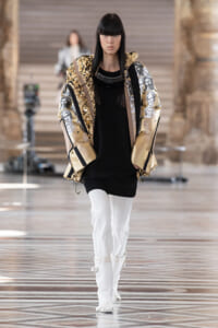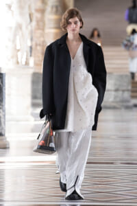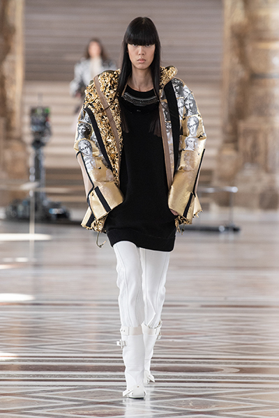哲学者や思想家の彫像モチーフをコラージュしたスリーブレスのテーラードジャケットには、ロゴを施したストリートライクなトップをミックス。ダイナミックなシルエットに、刺繍やジャカード織り、レーザープリンティングなど、伝統の技と最新技術が調和し、過去と未来のコントラストを描いた。彫像のポートレートをバッグに仕上げた「トロンプルイユ・ポシェット」などキャッチーなアクセサリーも誕生。