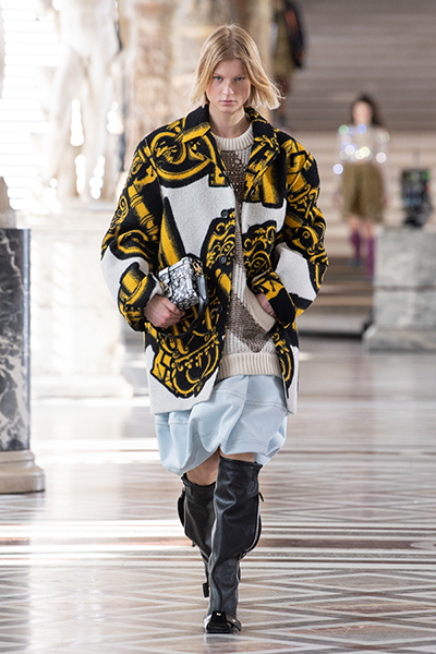 旅をすることが難しいいま、ルイ・ヴィトンは、21年秋冬コレクションを通して、古代へのタイムトラベルに誘った。閉館中のルーヴル美術館の展示室「ミケランジェロ・ギャラリー」と「ギャラリー・ダリュ」で無観客ショーを行い、デジタルで発表。今季は、イタリアのデザインアトリエ、フォルナセッティとコラボレート。フォルナセッティとは、絵画、彫刻、内装、装丁などで幅広く才能を発揮したアーティスト、ピエロ・フォルナセッティが1940年に設立したアトリエ。アーティスティックディレクターのニコラ・ジェスキエールは、保管されていた13,000点のアーカイブから彫像や肖像画、建物などのドローイングを選りすぐり、古代ギリシャ・ローマを表現したフォルナセッティのアートワークとルイ・ヴィトンのモダニティを融合した。