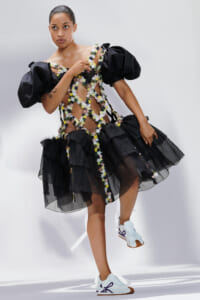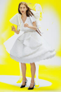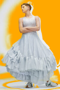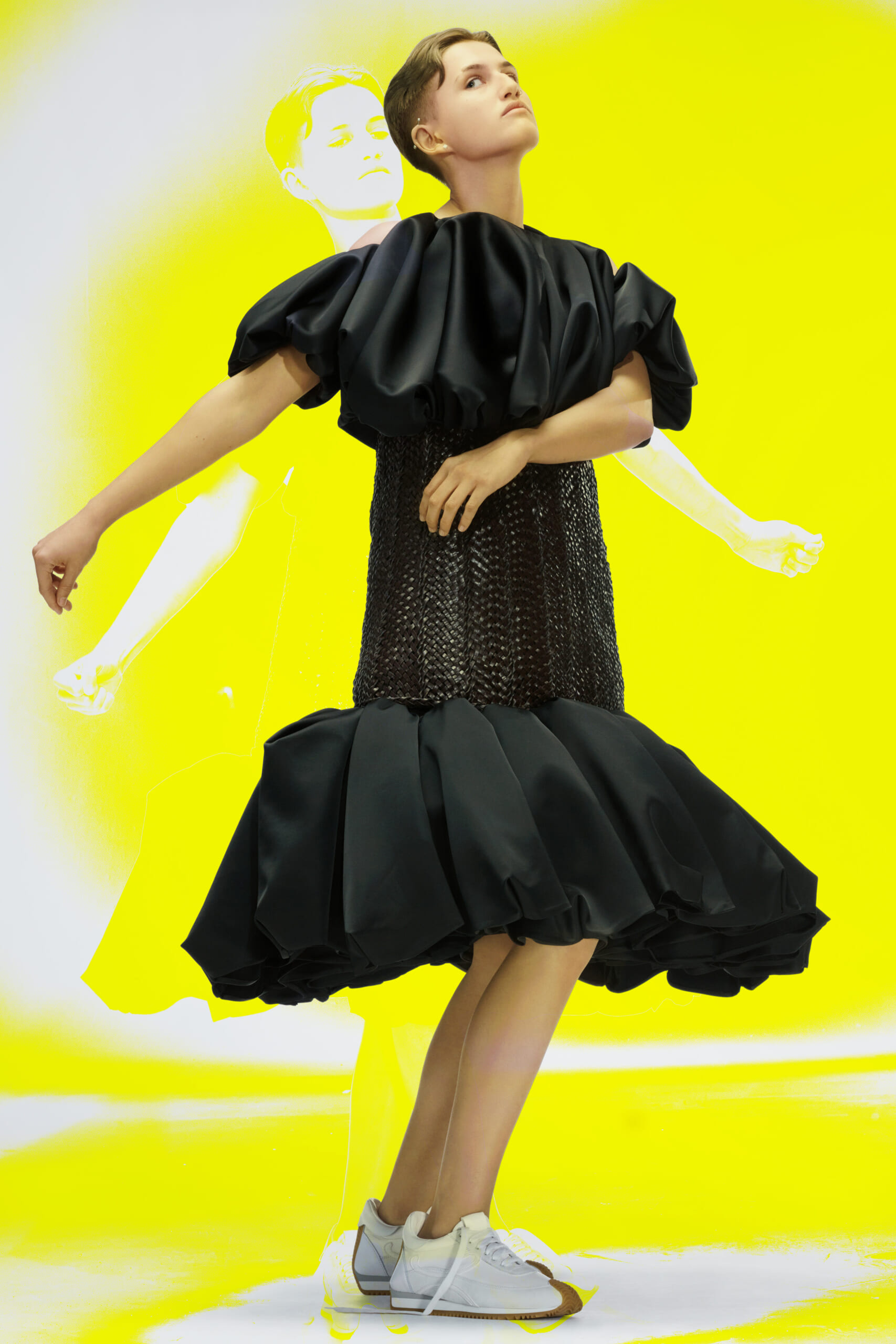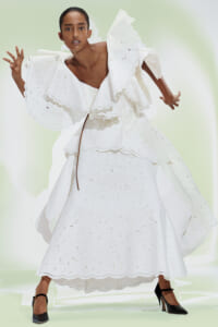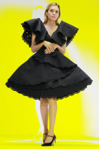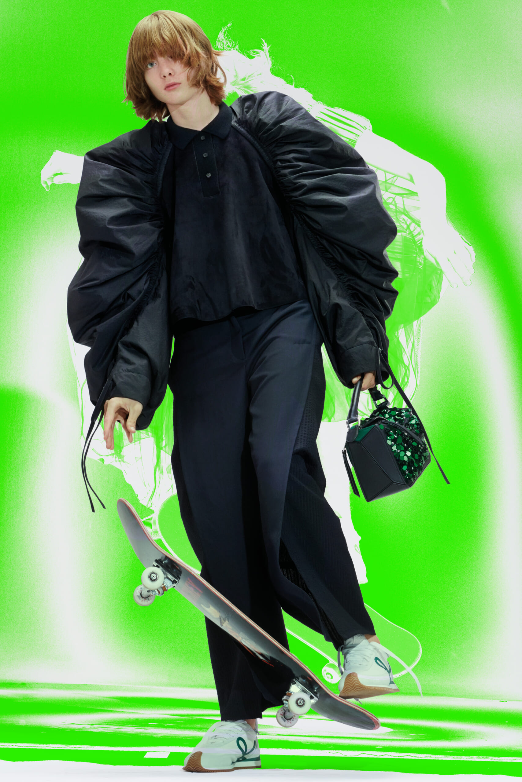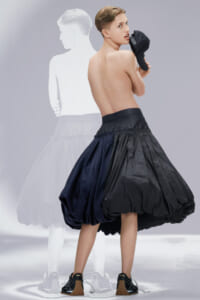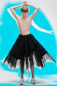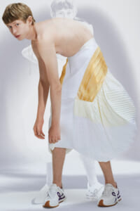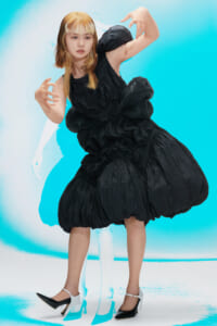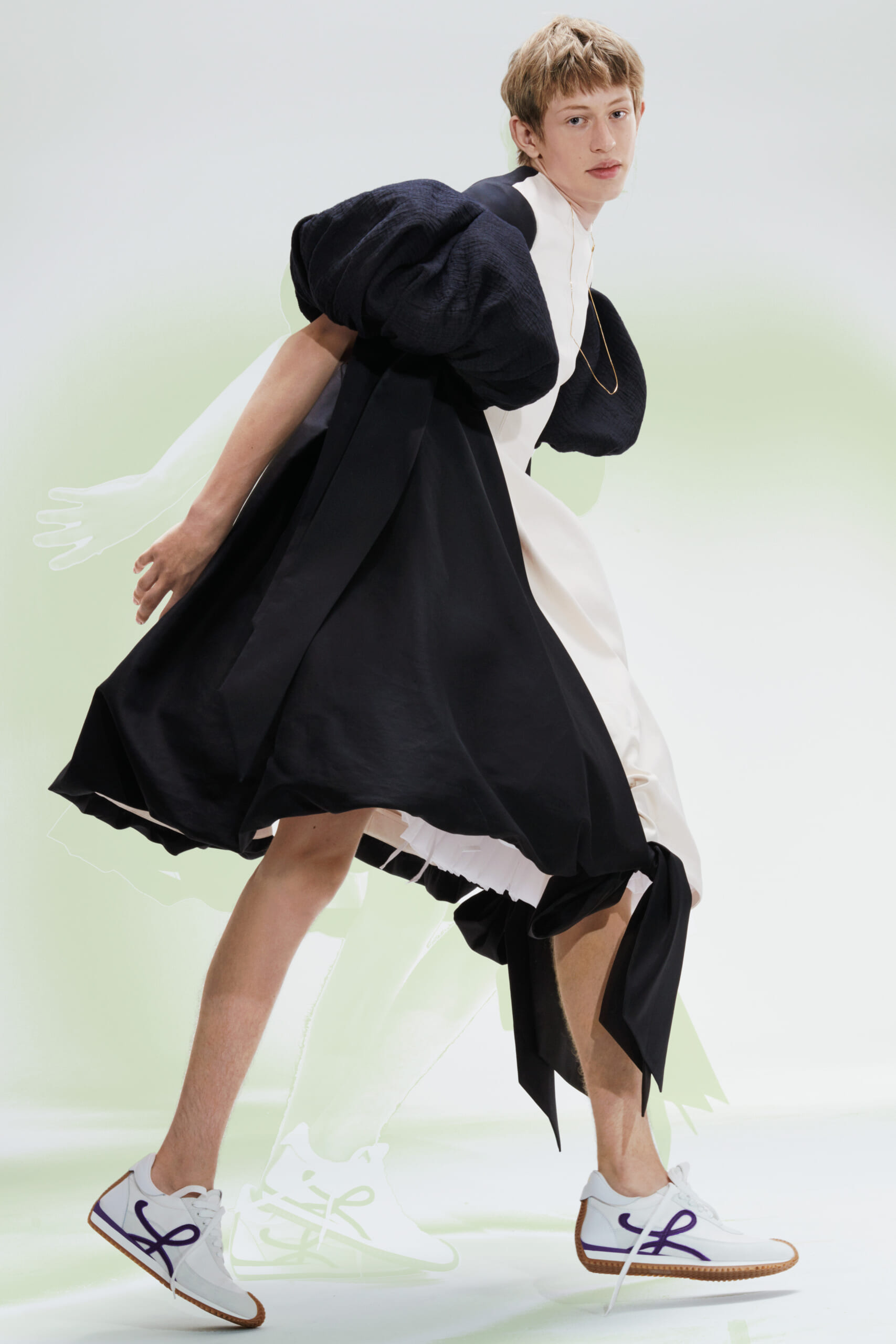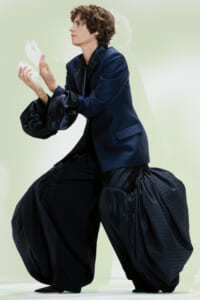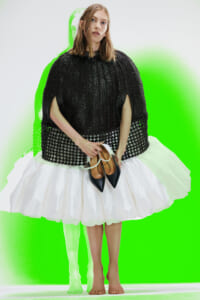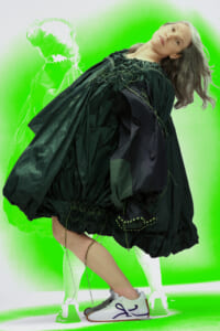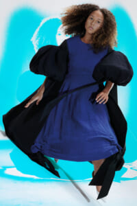 アーティスト、アンセア・ハミルトンとのコラボレーションによって作られた「Show on the wall」をコンセプトに、巨大なプレスキットで幕を開けた21年春夏のロエベ。 プレスキットには、モデルがさまざまなキャラクターを演じた等身大のポスターやのり、はさみなど、自分で壁に貼ってコレクションを楽しむことができるというウィットにとんだ仕掛け。ルックは、バルーンスリーブ、フープ、チュールなど、得意のクラフトワークを生かしながらもより彫刻的でアートな雰囲気漂う、ボリュームあるスタイルがそろう。モデルもアンセア・ハミルトン自身や一般の人をキャスティングし、いまという時代にポジティブなメッセージを打ち出した。