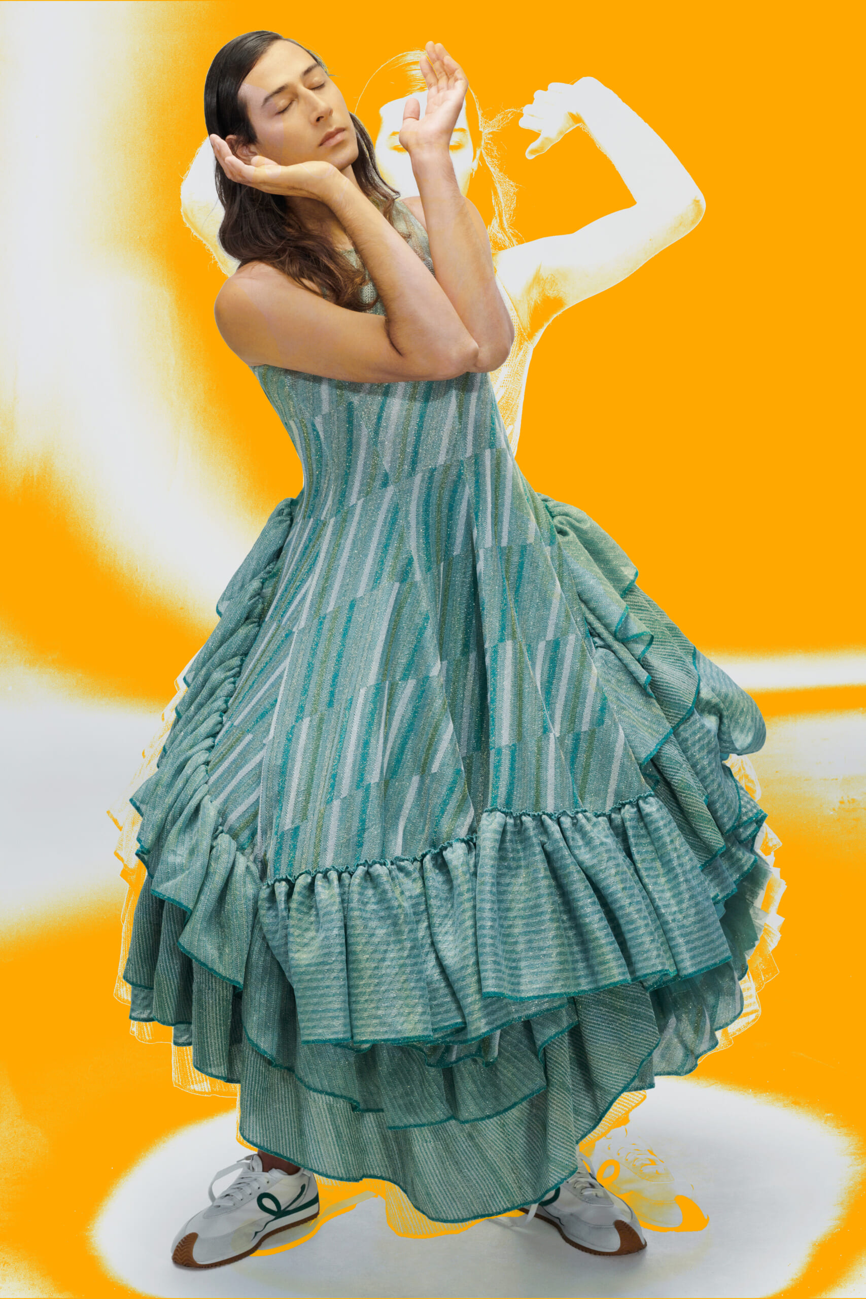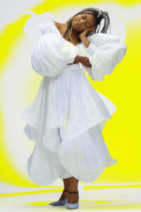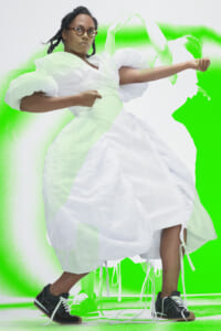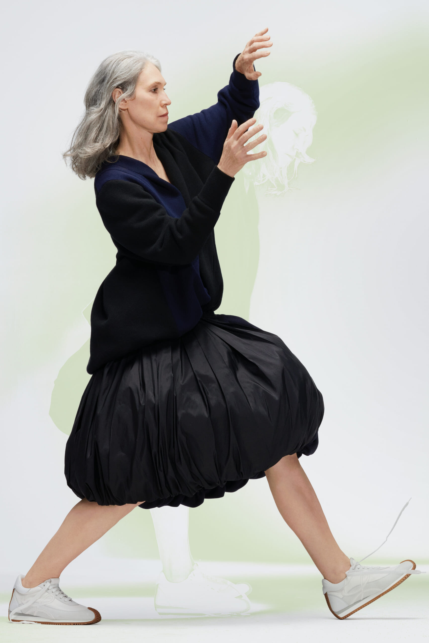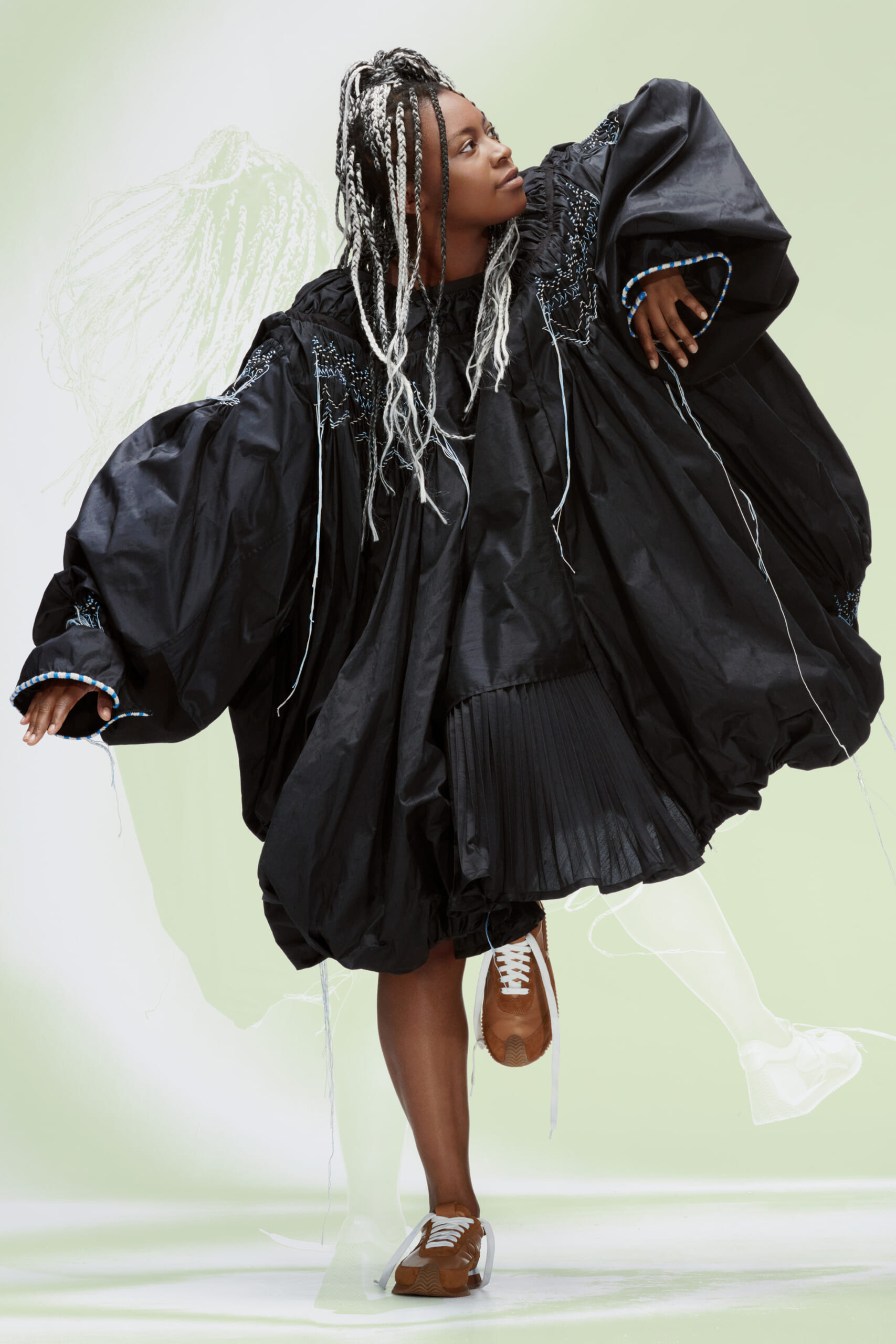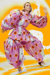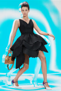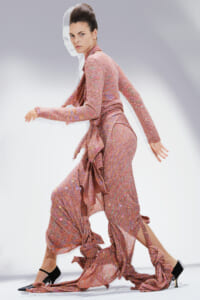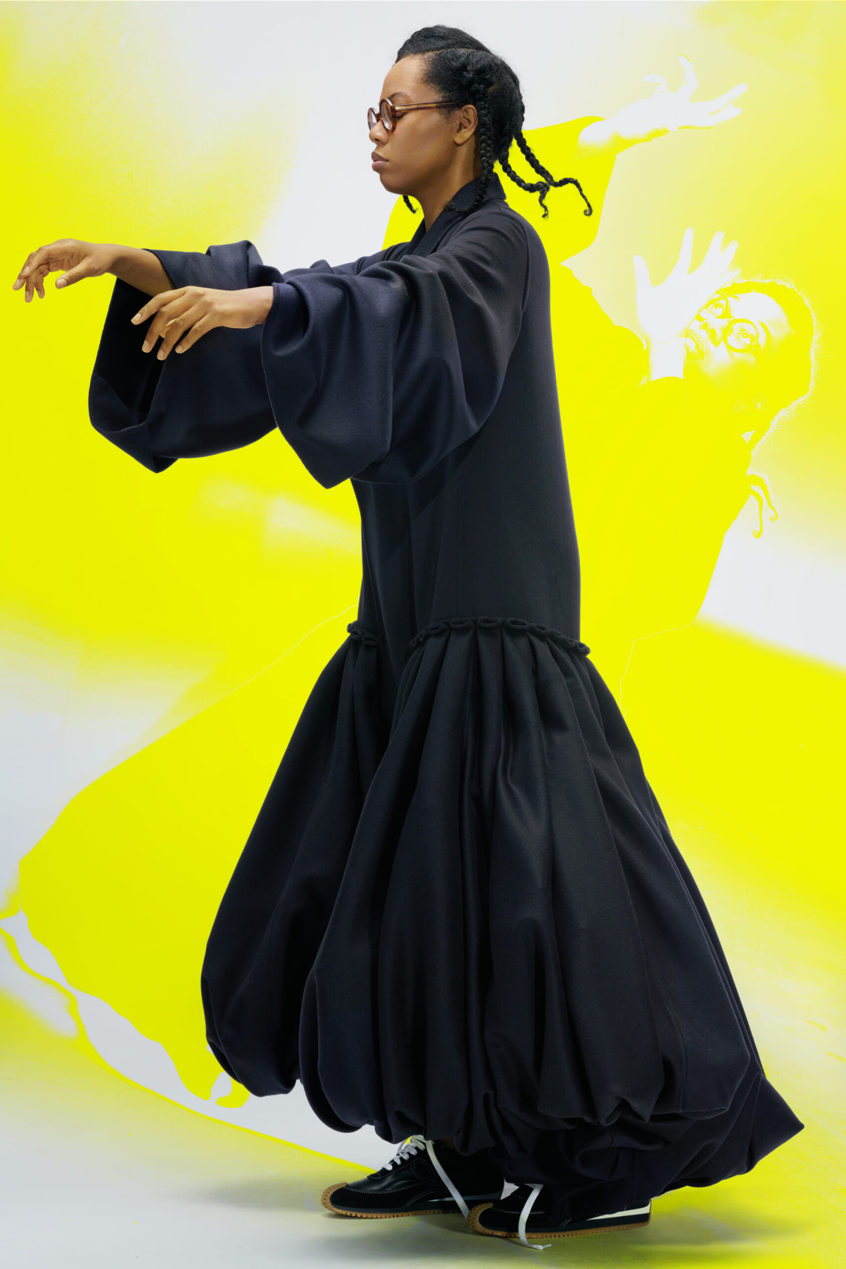 アーティスト、アンセア・ハミルトンとのコラボレーションによって作られた「Show on the wall」をコンセプトに、巨大なプレスキットで幕を開けた21年春夏のロエベ。 プレスキットには、モデルがさまざまなキャラクターを演じた等身大のポスターやのり、はさみなど、自分で壁に貼ってコレクションを楽しむことができるというウィットにとんだ仕掛け。ルックは、バルーンスリーブ、フープ、チュールなど、得意のクラフトワークを生かしながらもより彫刻的でアートな雰囲気漂う、ボリュームあるスタイルがそろう。モデルもアンセア・ハミルトン自身や一般の人をキャスティングし、いまという時代にポジティブなメッセージを打ち出した。